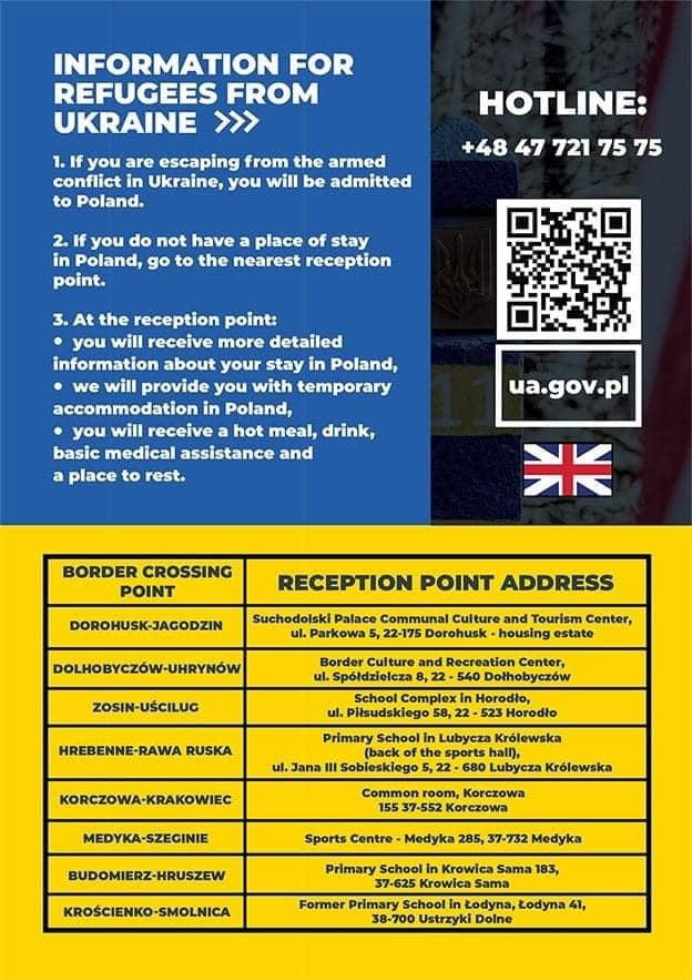 Aby uzyskać informacje, w zakresie m.in.: punktów recepcyjnych, czy ogólnych warunków i zasad wjazdu i pobytu w Polsce można też zadzwonić pod ogólnopolski numer: +48 47 721 75 75. Ministerstwo Spraw Zagranicznych przypomina, że obywatele polscy, którzy przebywają na Ukrainie, powinni natychmiast opuścić jej terytorium.