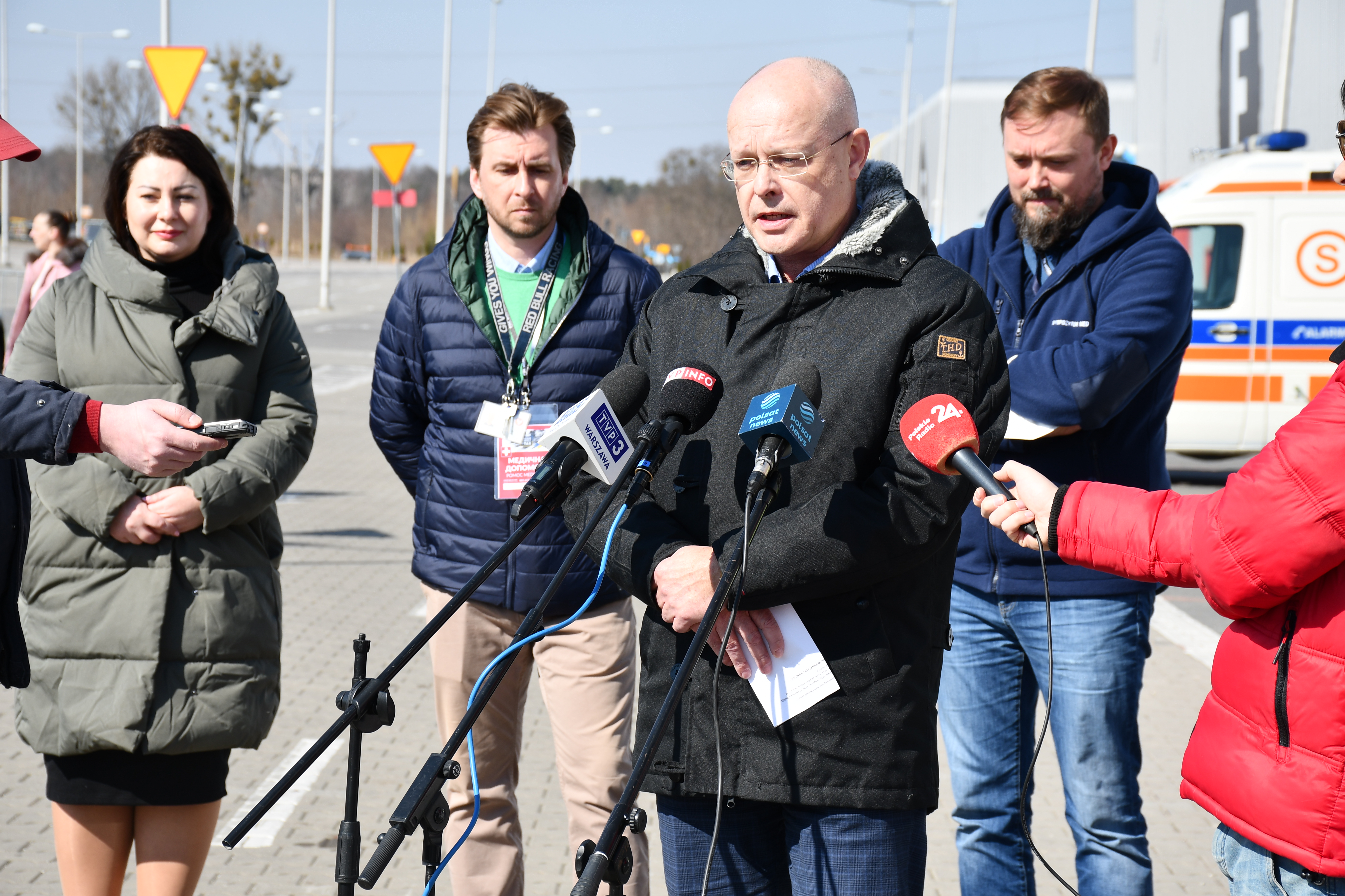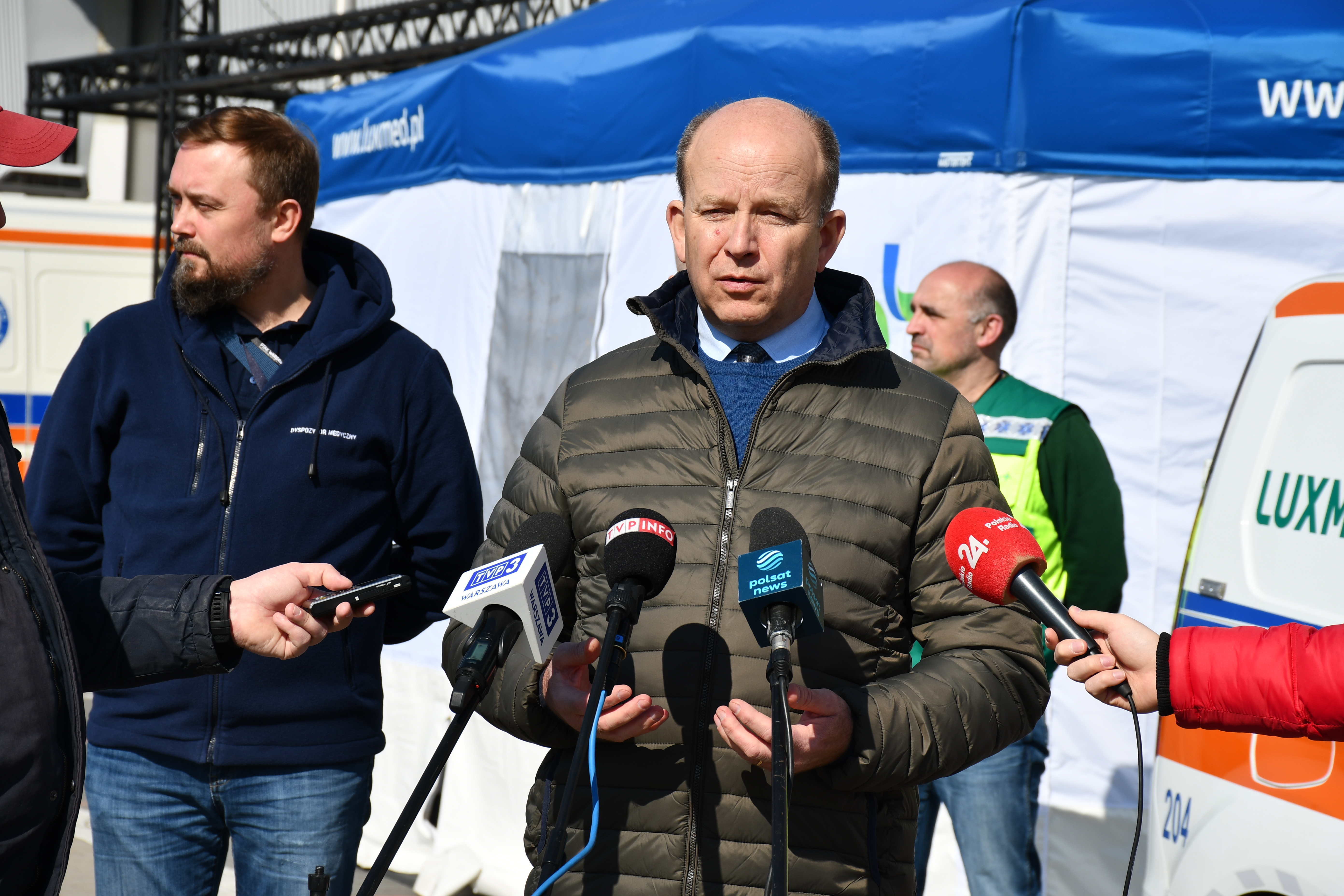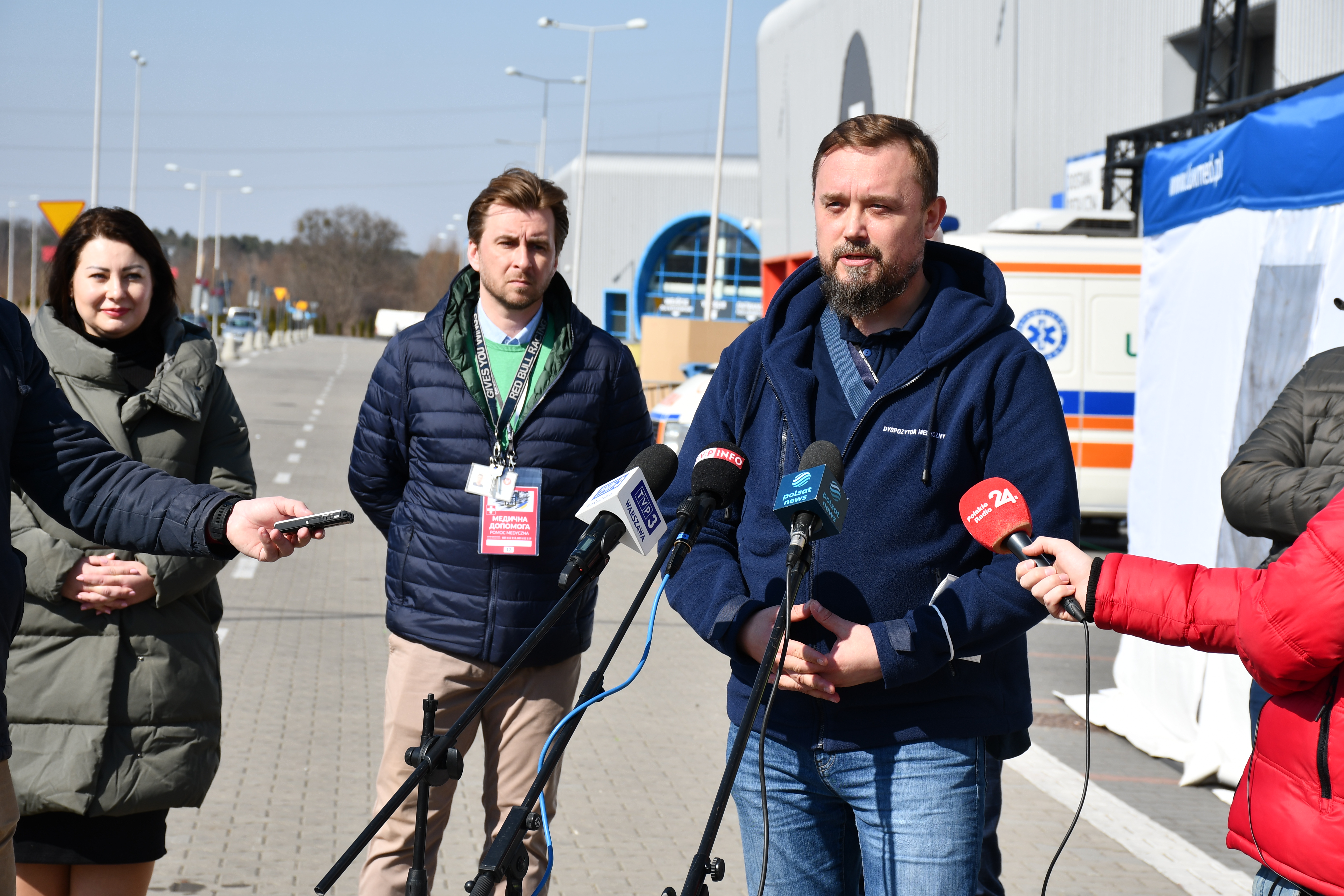 PTAK Warsaw Expo jest największym punktem zakwaterowania uchodźców z Ukrainy. Każdego dnia pomagamy tutaj ok. 6, 7 tys. potrzebującym. Potencjał tego miejsca jest znacznie większy i jesteśmy gotowi do przygotowania kolejnych łóżek, jeżeli będzie takie zapotrzebowanie. Na bieżąco reagujemy na potrzeby i oczekiwania naszych gości. Dzięki zaangażowaniu prywatnych firm medycznych i koordynatora Lux Med zorganizowane zostało miasteczko medyczne, w którym pomocy udzielają m.in. pediatra i internista. Przygotowane zostało również lądowisko dla helikoptera i dyspozytornia medyczna. Obecnie na Mazowszu przygotowanych jest ponad 400 obiektów noclegowych zapewniających ponad 32 tys. miejsc, które na bieżąco organizowane są we współpracy z samorządami. Mazowiecki Urząd Wojewódzki rozpoczął przekazywanie środków dla samorządów. Wojewoda zaangażowany jest również w projekt pomagamukrainie.pl, dzięki któremu dochodzi do współpracy pomiędzy osobami które chcą pomoc, a osobami które tej pomocy potrzebują. (…) Przyjmujemy uchodźców jako naszych gości, którzy niebawem podjętą pracą dadzą swój wkład w rozwój gospodarczy naszego kraju. W ostatnich dniach ruszyła akcja nadawania numeru PESEL, a dziś na Stadionie Narodowym uruchomiony został masowy punkt, który każdego dnia może przyjąć nawet 1 000 Ukraińców. W najbliższych dniach planujemy wsparcie dla gminy Nadarzyn, żeby także tutaj można było udostępnić taką usługę dla osób przebywających w obiekcie. Jeszcze raz dziękuje wszystkim za współpracę i okazanie serca wychodząc naprzeciw potrzebom. – powiedział Wojewoda Mazowiecki.