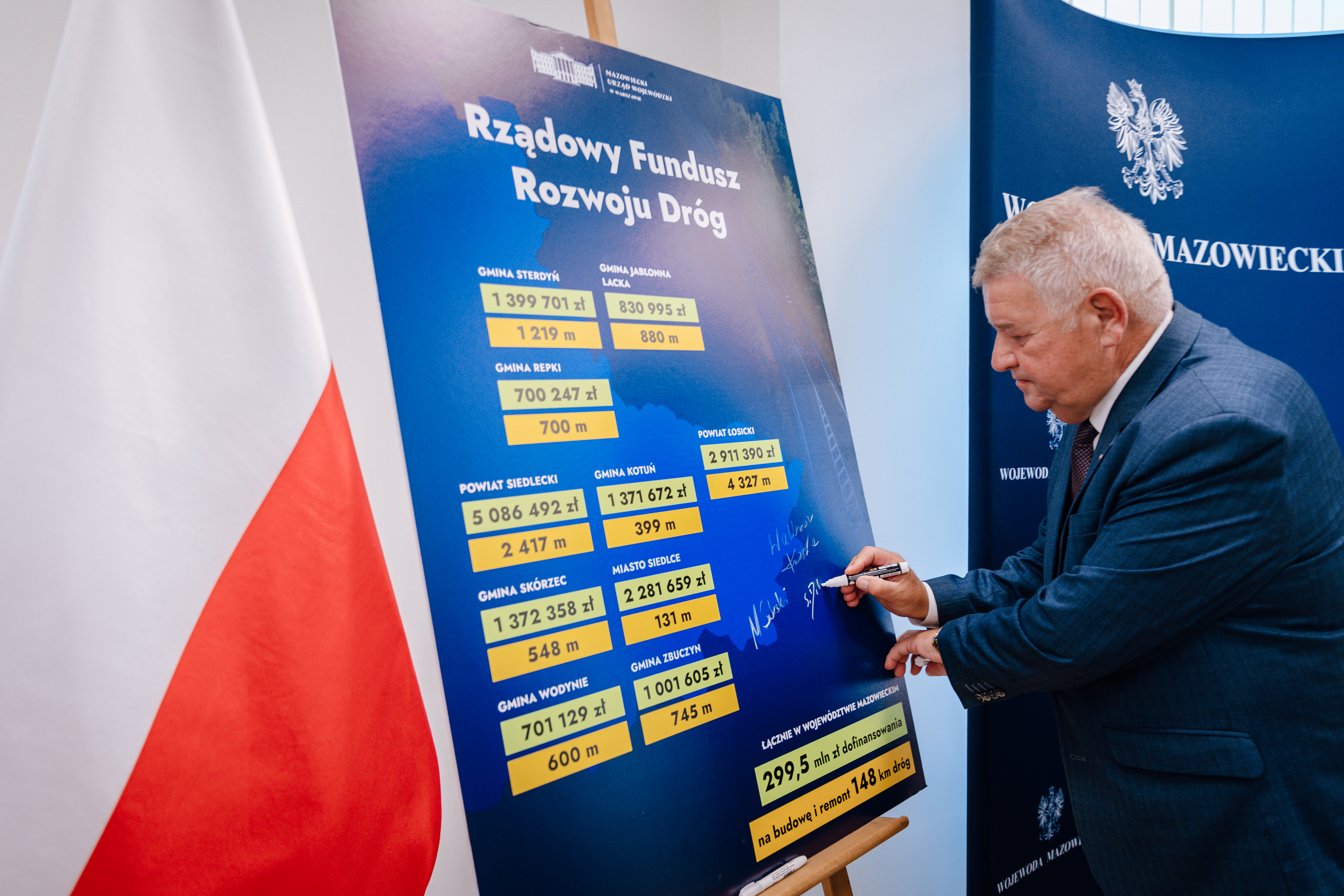 Ponad 17,6 mln zł otrzymają samorządy z województwa mazowieckiego, z regionu siedleckiego, w ramach Rządowego Funduszu Rozwoju Dróg. Łączna długość dróg realizowanych w ramach podpisanych umów to ponad 11,9 km. Uroczystość podpisania umów z udziałem Wicewojewody Mazowieckiego Sylwestra Dąbrowskiego odbyła się 14 lipca br. w Delegaturze Mazowieckiego Urzędu Wojewódzkiego w Siedlcach. W wydarzeniu udział wzięli również: Sekretarz Stanu w Ministerstwie Zdrowia Waldemar Kraska i Poseł na Sejm RP Maciej Górski.