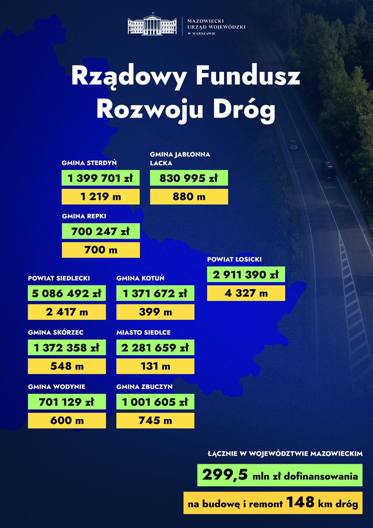 Dzięki środkom z Rządowego Funduszu Rozwoju Dróg, samorządy z województwa mazowieckiego otrzymają w 2023 r. dofinansowanie na realizację zadań polegających na budowie, przebudowie lub remoncie dróg gminnych i powiatowych w kwocie 299 487 081,96 zł. Dofinansowaniem na chwilę obecną objęte zostanie 114 zadań, z czego 23 zadania to zadania wieloletnie kontynuowane, a 91 to zadania, których realizacja rozpocznie się w 2023 r.