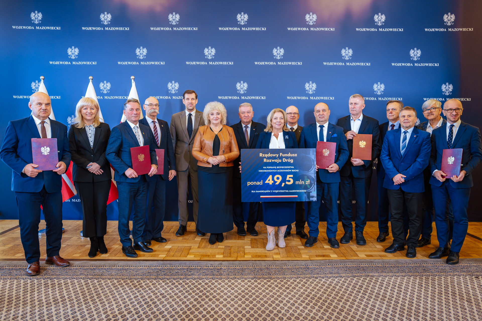 W ramach podpisywanych 30 listopada br. umów samorządy województwa mazowieckiego otrzymają 49 547 087,63 zł na realizację zadań mających na celu poprawę bezpieczeństwa niechronionych uczestników ruchu. Środki pochodzą z Rządowego Funduszu Rozwoju Dróg. W uroczystości wzięli udział Poseł na Sejm RP Maria Koc, Wojewoda Mazowiecki Tobiasz Bocheński, Wicewojewoda Mazowiecki Sylwester Dąbrowski oraz Dyrektor Wydziału Transportu i Rozwoju Regionalnego Mazowieckiego Urzędu Wojewódzkiego w Warszawie Katarzyna Harmata.