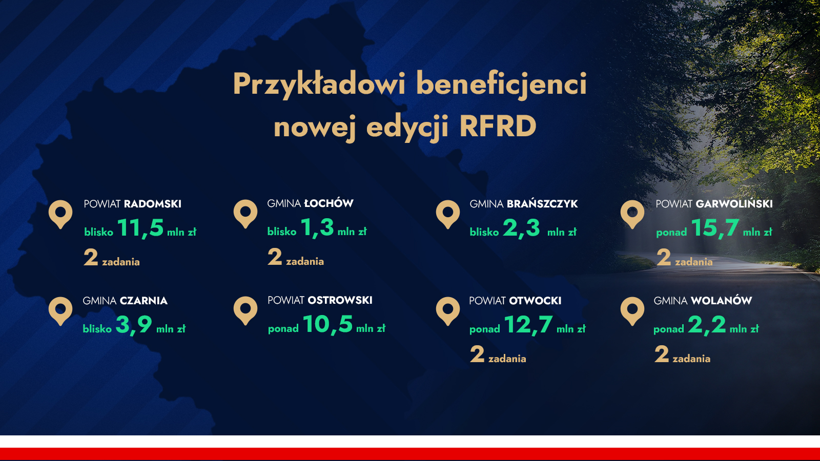 • Powiat Radomski – dwie umowy na łączną kwotę prawie 11,5 mln zł na rozbudowę drogi powiatowej nr 3560W Ruda Wielka - Dąbrówka Warszawska oraz remont drogi powiatowej nr 3513W Nowe Zawady – Bierwce oraz drogi powiatowej nr 3514W Wierzchowiny – Lisów, Gmina Jedlińsk,