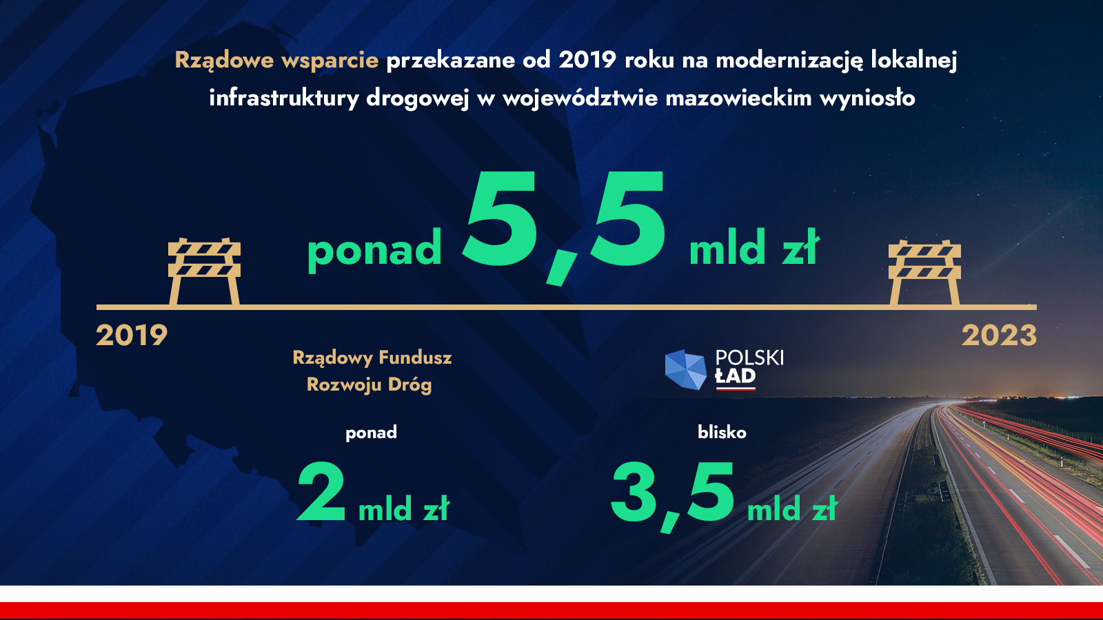 W ramach Rządowego Funduszu Rozwoju Dróg (wcześniej Funduszu Dróg Samorządowych), w latach 2019-2023 jednostkom samorządu terytorialnego z województwa mazowieckiego przyznano dofinansowanie na realizację 1324 zadań gminnych oraz powiatowych w łącznej kwocie ponad 2 mld zł (2 035 930 498,30 zł). Długość odcinków dróg objętych dofinansowaniem w latach 2019-2023 to ponad 1717 km. Ponadto, dofinansowaniem objęto podniesienie poziomu bezpieczeństwa na ponad 300 przejściach dla pieszych.