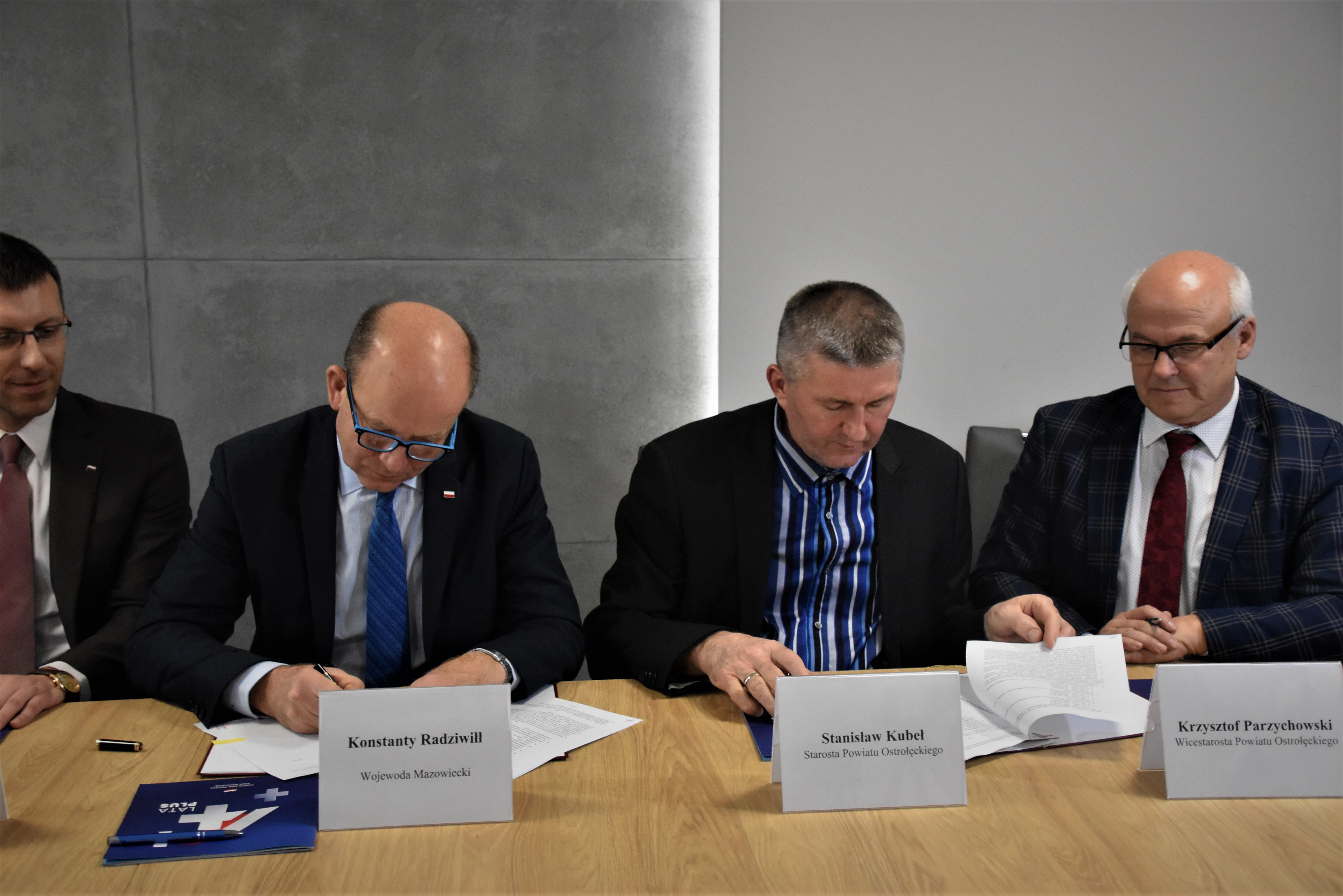 10 grudnia br. w Delegaturze Mazowieckiego Urzędu Wojewódzkiego w Ostrołęce Wojewoda Mazowiecki Konstanty Radziwiłł oraz Starosta Ostrołęcki Stanisław Kubeł i Wicestarosta Krzysztof Parzychowski podpisali porozumienie w sprawie realizacji zadania zgłoszonego do dofinansowania w ramach Rządowego Programu Uzupełniania Lokalnej i Regionalnej Infrastruktury Drogowej – „Mosty dla Regionów” oraz umowę o udzielenie dotacji na pierwszy etap realizacji projektu. Ogólnie Powiat Ostrołęcki otrzyma ponad milion złotych dotacji na opracowanie dokumentacji projektowej dotyczącej budowy przeprawy mostowej przez rzekę Narew z drogami dojazdowymi łączącymi drogę krajową nr DK61 w miejscowości Teodorowo w gminie Rzekuń z drogą powiatową nr 2539W w miejscowości Łęg Przedmiejski w gminie Lelis w powiecie ostrołęckim. Wsparcie finansowe umożliwi kompleksowe przygotowanie dokumentacji projektowej, na podstawie której w przyszłości zostanie wybudowany most.
