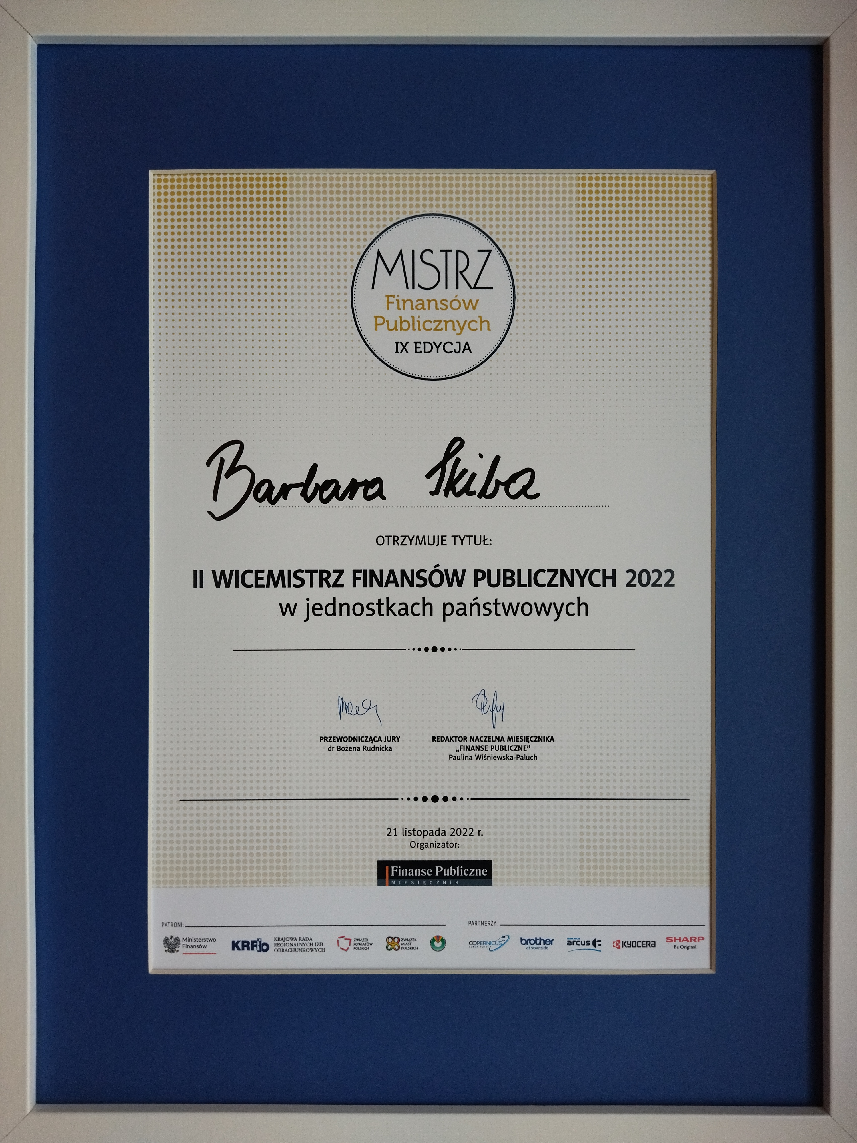 W IX edycji konkursu Mistrz Finansów Publicznych pracownik Mazowieckiego Urzędu Wojewódzkiego w Warszawie, Barbara Skiba, zastępca kierownika Oddziału Budżetu w Wydziale Finansów i Budżetu, została II wicemistrzem Finansów Publicznych w Jednostkach Państwowych.