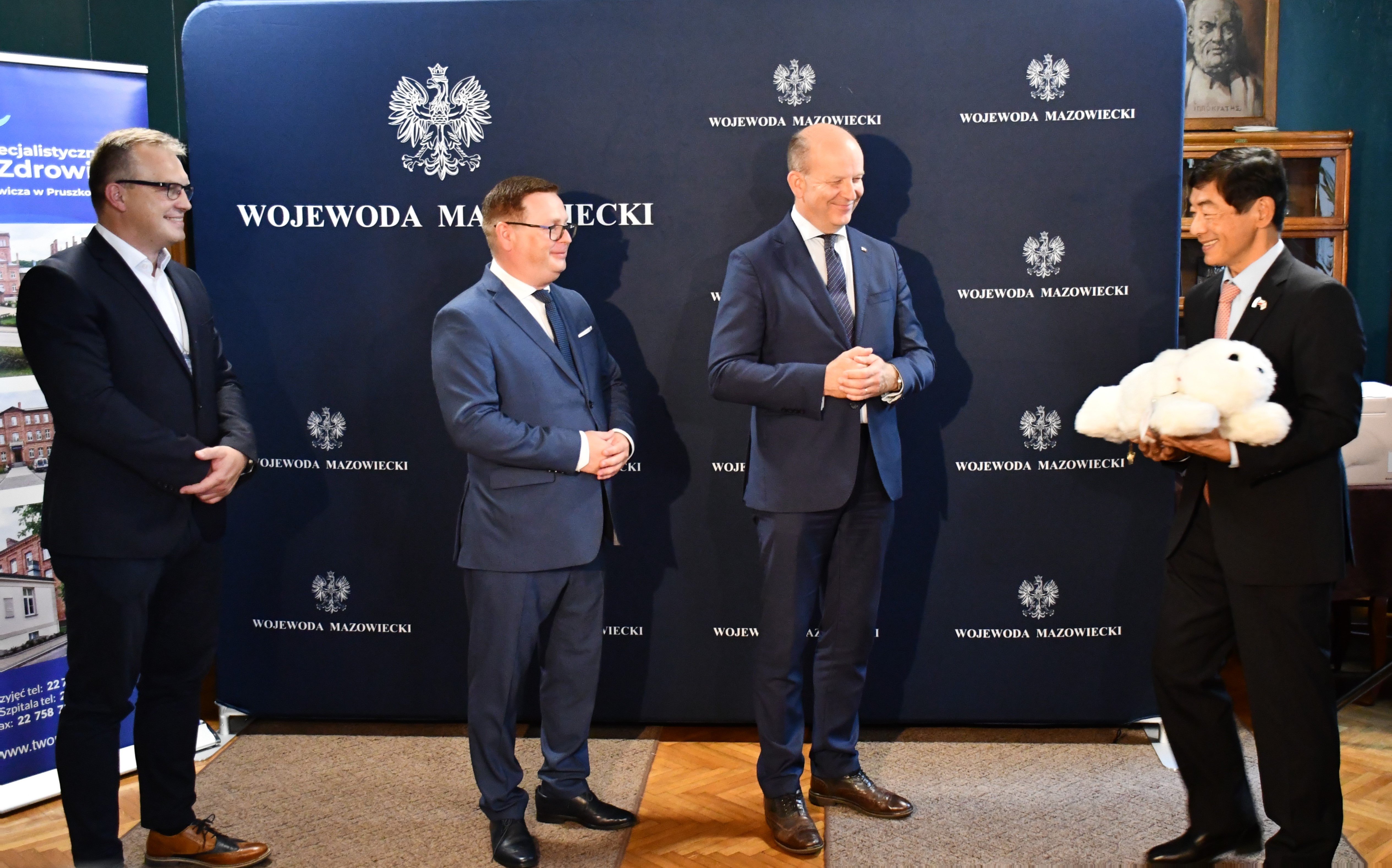 - Cieszę się, że mogę uczestniczyć w uroczystości przekazania robota terapeutycznego przez Pana Ambasadora Japonii Mazowieckiemu Specjalistycznemu Centrum Zdrowia w Pruszkowie. Z Panem Ambasadorem od dłuższego czasu współpracujemy w różnych obszarach. Ambasada Japonii dała się poznać, jako partner różnych akcji pomocowych, jeśli chodzi o wsparcie uchodźców z Ukrainy. Ale wrażliwość i chęć niesienia pomocy nie skończyła się na jednej grupie. Pan Ambasador jest gotów udzielać cały czas pomocy, tym którzy jej potrzebują. Cieszę się, że dzisiaj możemy uczestniczyć w przekazaniu robota terapeutycznego, foczki PARO szpitalowi w Pruszkowie. Ta foczka przynosi ulgę osobom z różnego rodzaju kłopotami zdrowia psychicznego. Są doniesienia, że uspokaja ona osoby z upośledzeniem umysłowym, ale także osoby z chorobą Alzheimera. Panie Ambasadorze, dziękuję za tę życzliwość. Mam nadzieję, że ten robot będzie ciężko pracował w szpitalu w Pruszkowie i że skutki jego obecności tutaj będą pozytywne. – powiedział Wojewoda Mazowiecki Konstanty Radziwiłł.