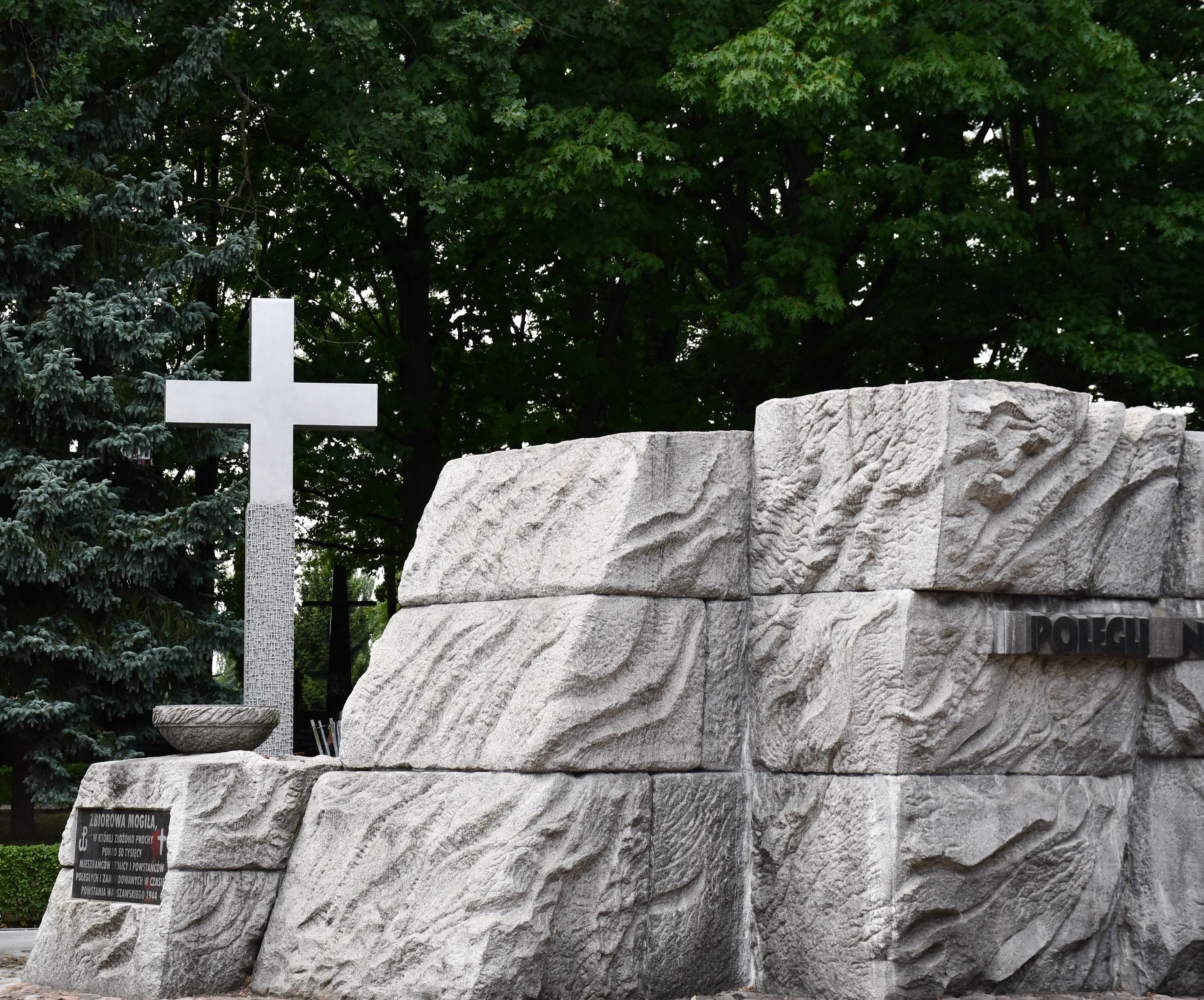 Wejście do krypty znajdujące się za pomnikiem oznaczono granitową płytą z odlaną z brązu tablicą z napisem: „W tym miejscu spoczywają prochy ponad 50 tysięcy Polaków, cywilnych mieszkańców Warszawy oraz żołnierzy Armii Krajowej, poległych za wolność Ojczyzny zamordowanych przez Niemców podczas Powstania Warszawskiego w sierpniu i wrześniu 1944 r. 6 VIII 1946 r. złożono tu 117 trumien z prochami osób zamordowanych i spalonych przewiezionych między innymi: z siedziby Gestapo w Al. Szucha, ul. Wolskiej, ul. Górczewskiej, parku Sowińskiego, ze szpitala św. Stanisława (fabryka Franaszka), ul. Moczydło, ul. Młynarskiej.”