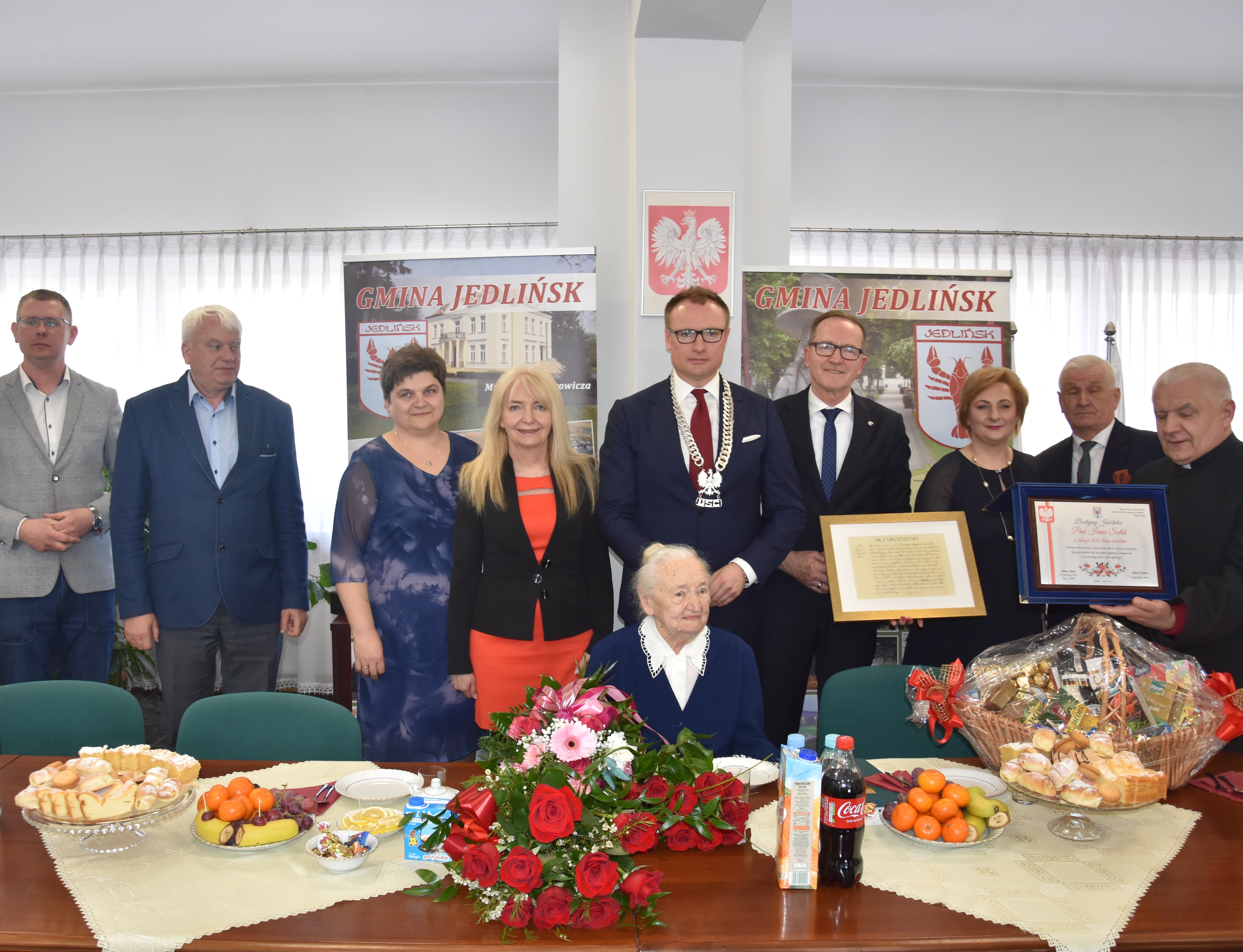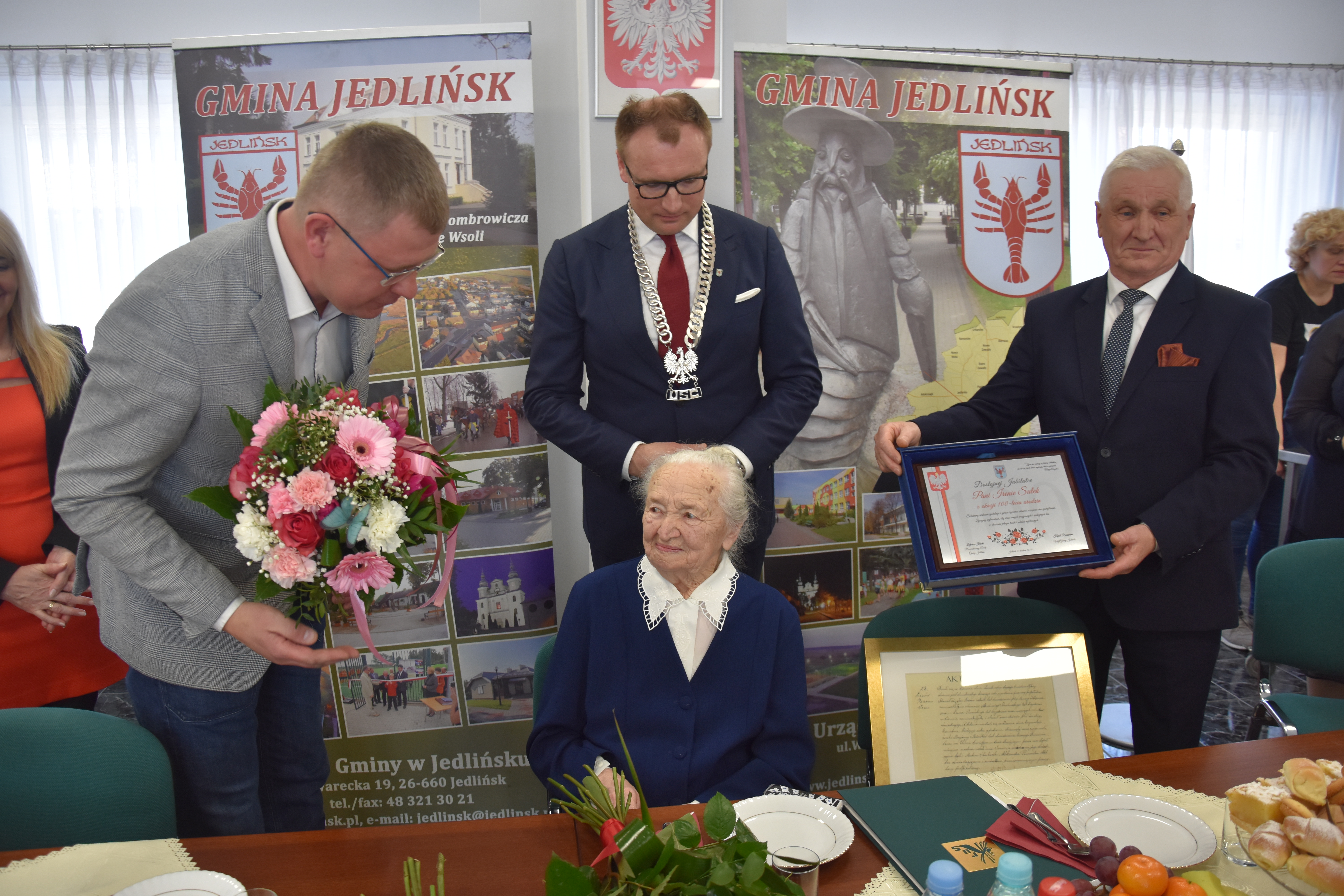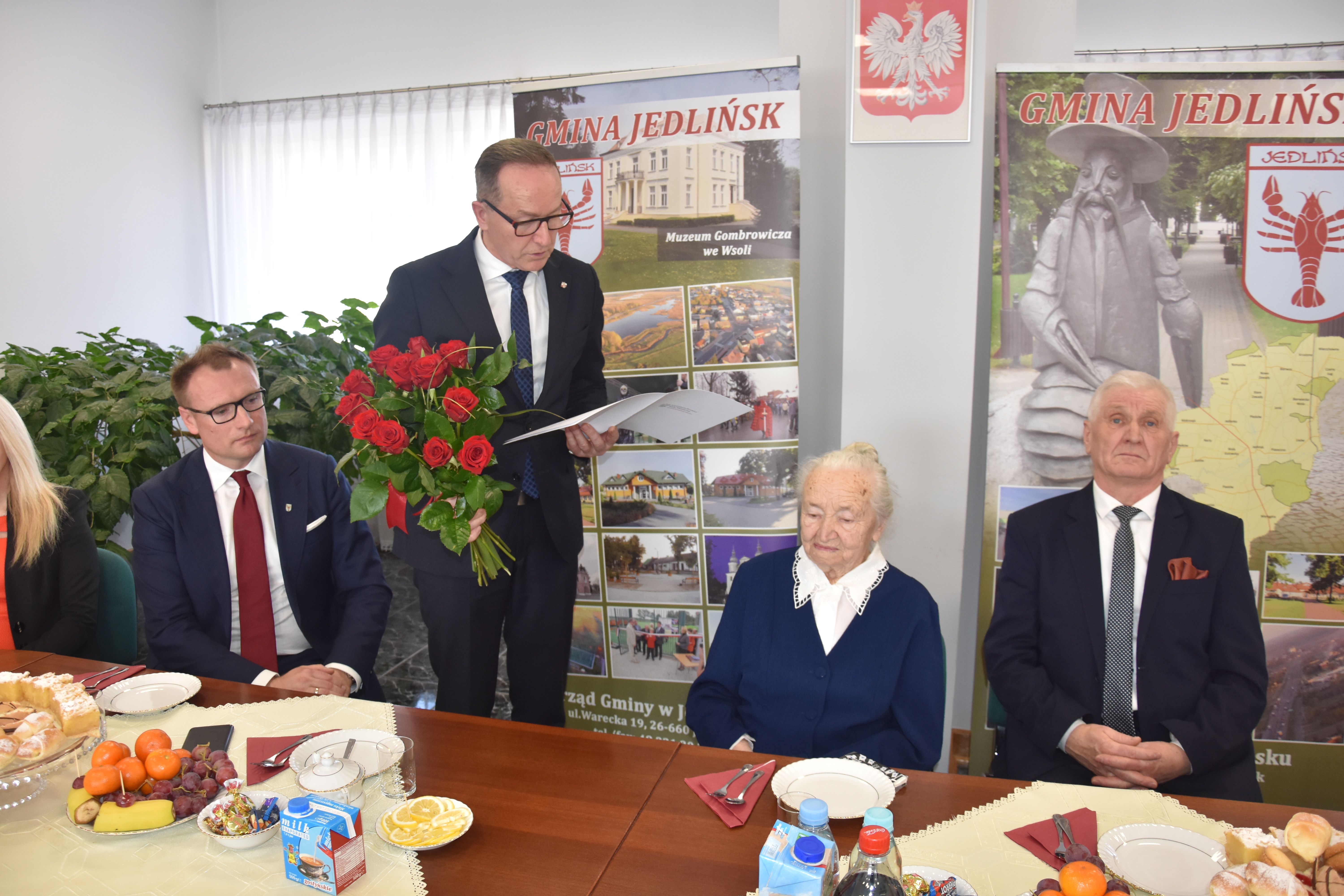 W czwartek, 13 kwietnia br. w Urzędzie Gminy w Jedlińsku odbyła się uroczystość z okazji setnych urodzin Pani Ireny Sułek, jednej z najstarszych mieszkanek Gminy Jedlińsk. W obecności najbliższej rodziny oraz przedstawicieli administracji samorządowej i powiatowej, Kierownik Delegatury Mazowieckiego Urzędu Wojewódzkiego w Radomiu Krzysztof Murawski odczytał, a następnie wręczył Pani Irenie Sułek list gratulacyjny skierowany przez Prezesa Rady Ministrów Mateusza Morawieckiego. Krzysztof Murawski wraz z życzeniami od szefa rządu przekazał również gratulacje i kwiaty od Wicewojewodów Sylwestra Dąbrowskiego i Artura Standowicza.