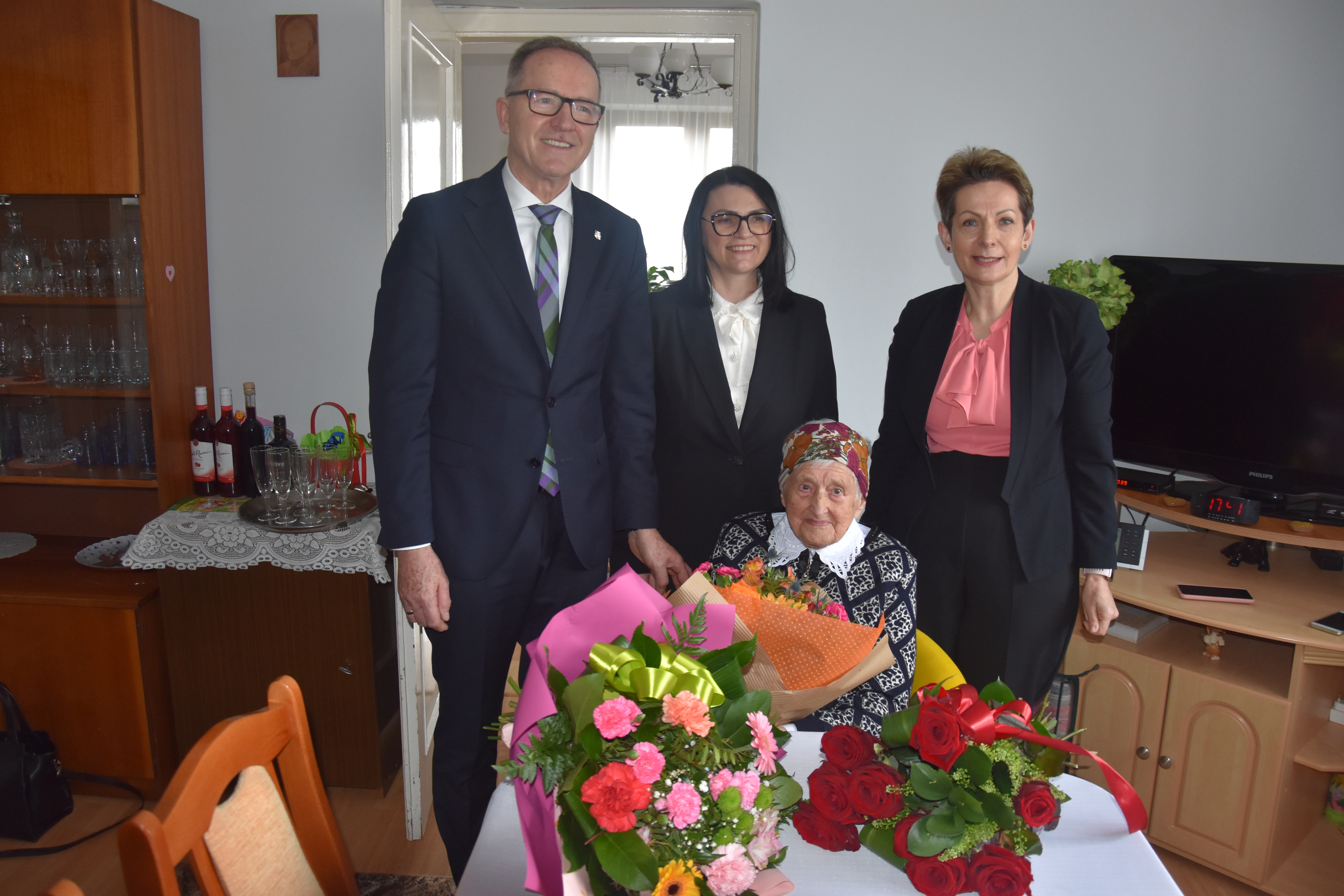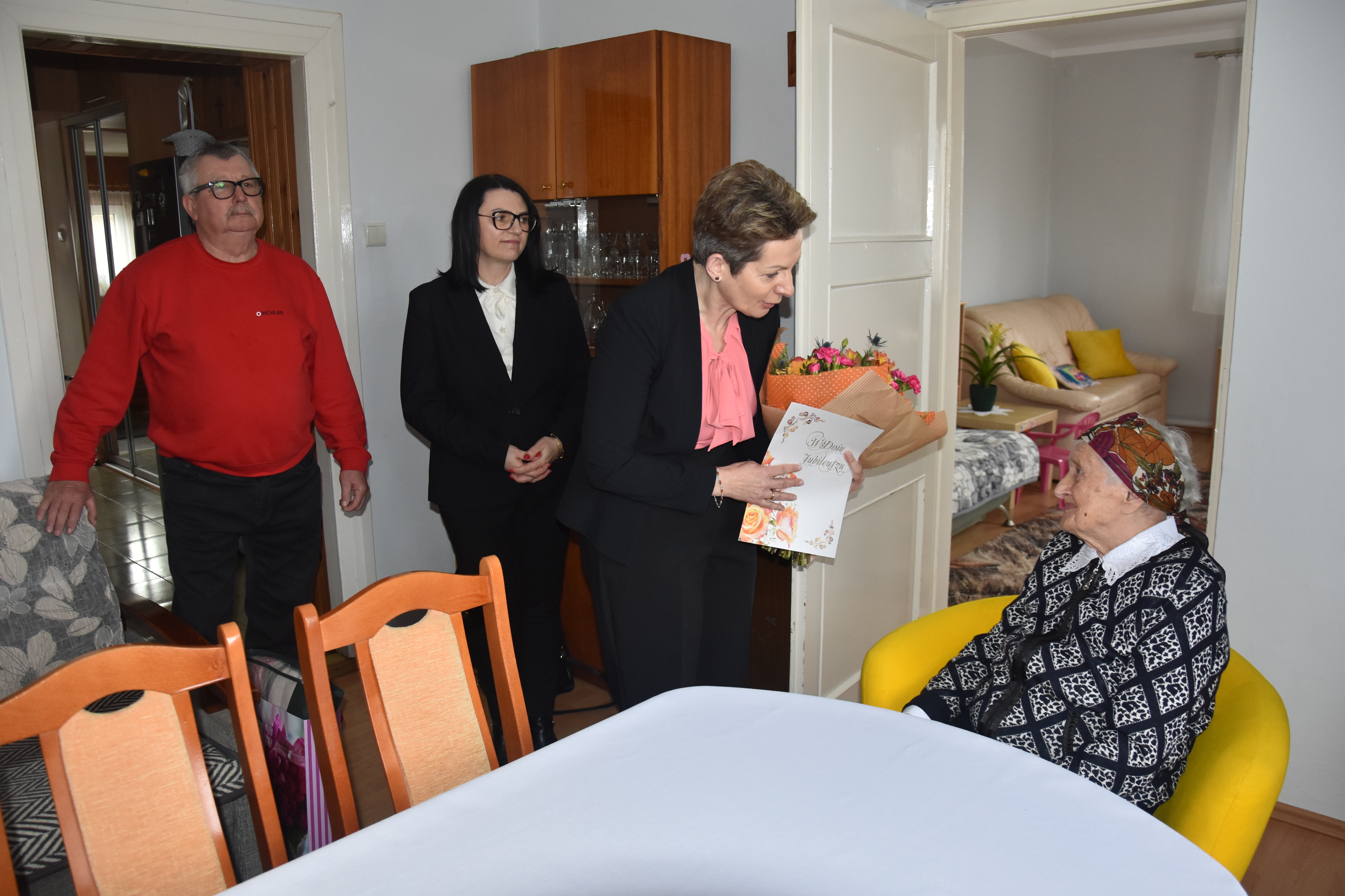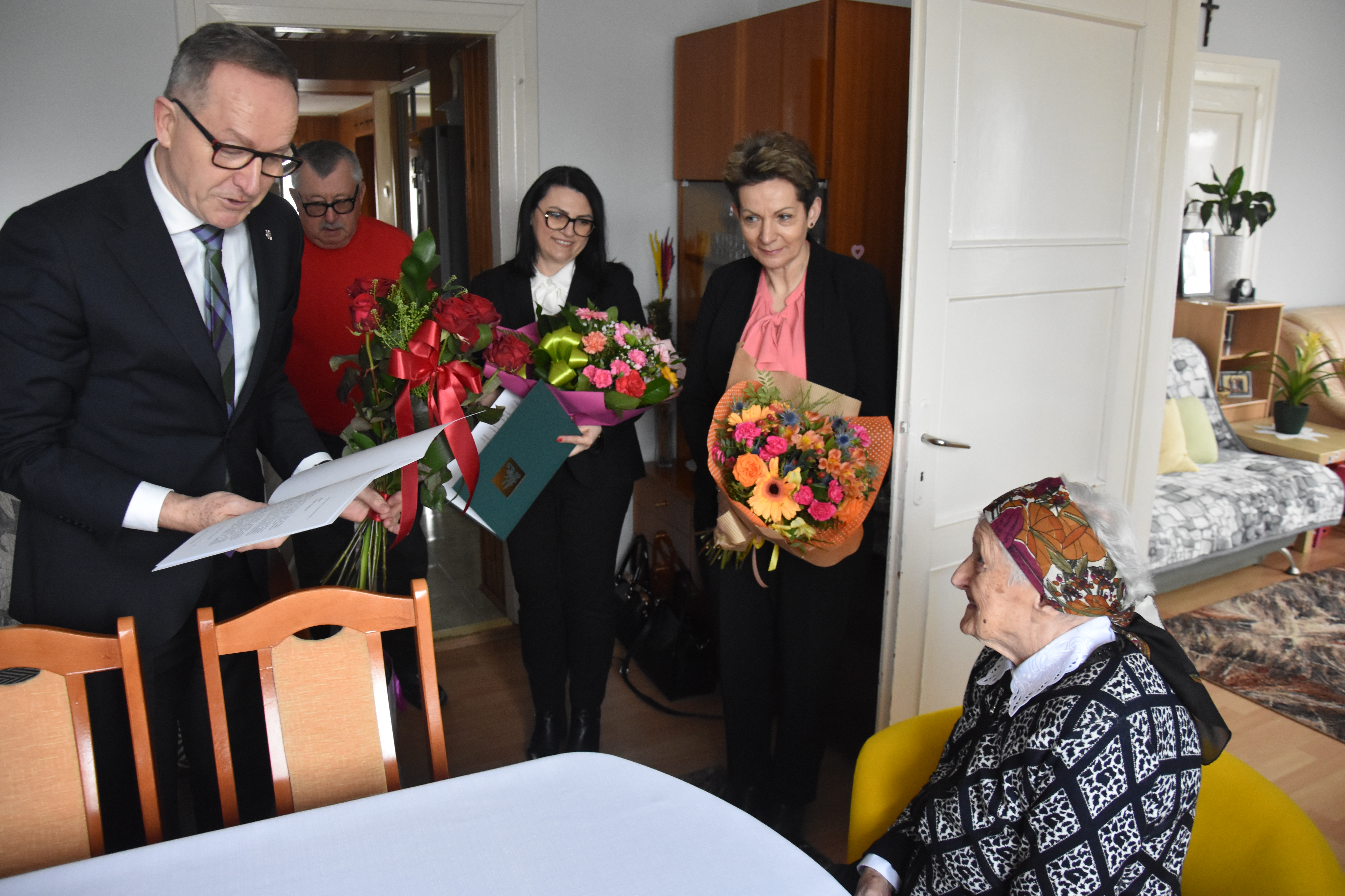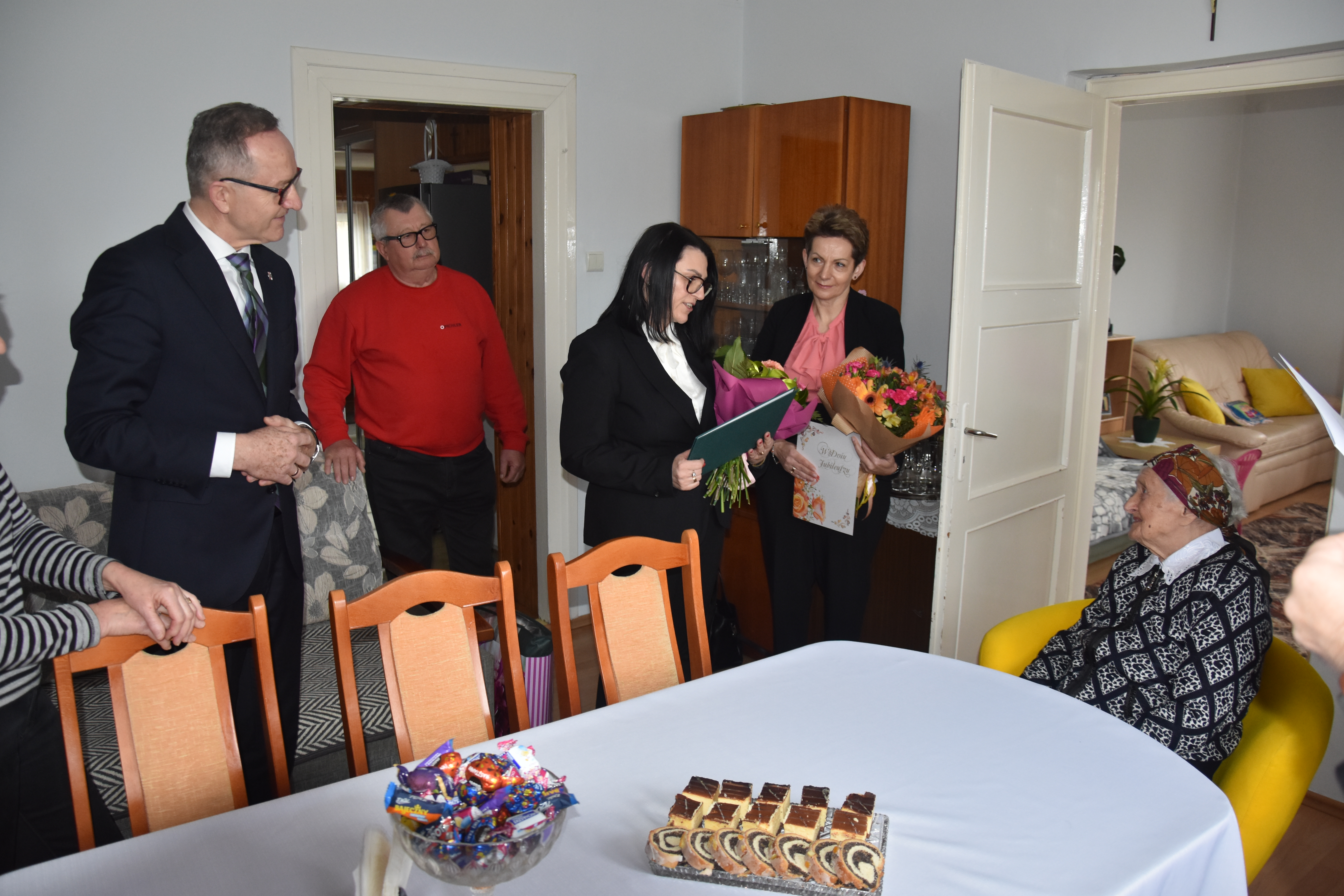 Wraz z życzeniami i gratulacjami od Prezesa Rady Ministrów, Kierownik Delegatury Mazowieckiego Urzędu Wojewódzkiego w Radomiu Krzysztof Murawski przekazał Pani Zofii bukiet kwiatów w imieniu Wicewojewodów Sylwestra Dąbrowskiego i Artura Standowicza. Życzenia od lokalnego samorządu złożyła Wójt Gminy Wolanów Ewa Markowska-Bzducha. Nową decyzję emerytalną oraz życzenia w imieniu Prezesa Kasy Rolniczego Ubezpieczenia Społecznego przekazała Kierownik Placówki Terenowej KRUS w Radomiu Monika Pachniewska.