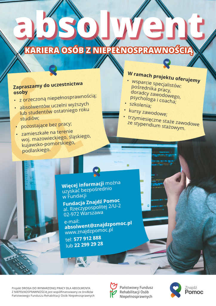 Fundacja Znajdź Pomoc cały czas prowadzi rekrutację do projektu "Droga do wymarzonej pracy dla absolwenta z niepełnosprawnością" w ramach programu „Absolwent” współfinansowanego ze środków Państwowego Funduszu Rehabilitacji Osób Niepełnosprawnych. Projekt obejmuje cykl spotkań z psychologiem i doradcą zawodowym, którzy wyznaczą dalszą ścieżkę udziału w projekcie w zależności od predyspozycji: zdobycie uprawnień zawodowych, ukończenie kursów i szkoleń specjalizacyjnych lub odbycie trzymiesięcznego stażu zawodowego. Przewidziane są również warsztaty przygotowujące do wejścia na rynek pracy, wsparcie pośrednika pracy i coacha.