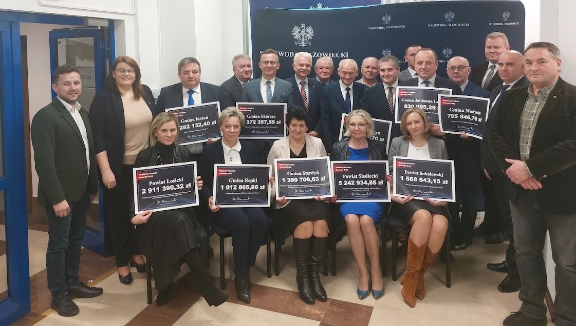 27 lutego br. w siedleckiej Delegaturze Mazowieckiego Urzędu Wojewódzkiego wręczono samorządowcom z terenu powiatów siedleckiego, sokołowskiego i łosickiego, symboliczne czeki na dofinansowanie zadań drogowych w ramach Rządowego Funduszu Rozwoju Dróg. Podczas spotkania przekazano czeki na łączna kwotę ponad 24 mln zł. W wydarzeniu udział wzięli m.in.: Poseł na Sejm RP Krzysztof Tchórzewski, Wiceminister Zdrowia Waldemar Kraska, Wicewojewoda Mazowiecki Sylwester Dąbrowski oraz Kierownik Delegatury Mazowieckiego Urzędu Wojewódzkiego w Siedlcach Anna Kaszuba.