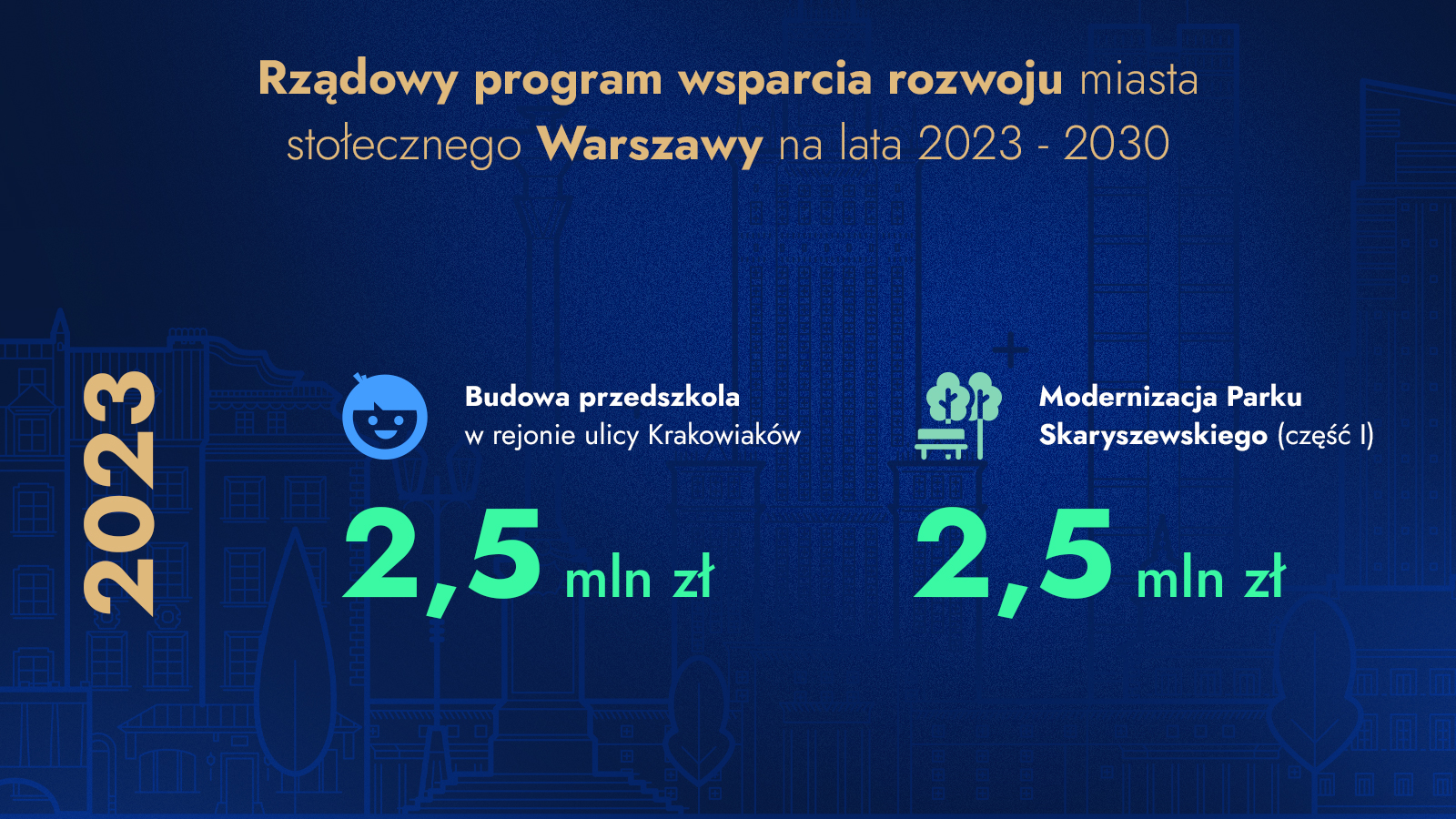 5 września br. Rada Ministrów podjęła uchwałę w sprawie ustanowienia wieloletniego programu pod nazwą „Rządowy program wsparcia rozwoju m.st. Warszawy na lata 2023-2030”. Program ma na celu zwiększenie możliwości rozwoju stolicy i podniesienia jakości życia jego mieszkańców. Dzięki temu dofinansowaniu poprawi się dostępność transportowa w mieście stołecznym Warszawa, podniesie się jakość życia jego mieszkańców oraz wszystkich odwiedzających stolicę oraz wzrośnie atrakcyjność inwestycyjna oraz turystyczna i rekreacyjna miasta stołecznego. W wyznaczonym terminie przez Wojewodę Mazowieckiego m. st. Warszawa złożyło dwa wnioski dotyczące: