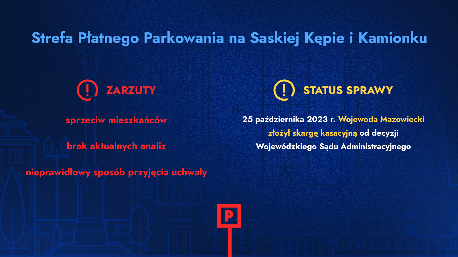 25 października 2023 r. Wojewoda Mazowiecki złożył skargę kasacyjną do Naczelnego Sądu Administracyjnego w sprawie ustalenia strefy płatnego parkowania, wysokości stawek opłaty za postój pojazdów samochodowych na drogach publicznych w strefie, wysokości opłaty dodatkowej oraz określenia sposobu pobierania tych opłat rozszerzającej obszar SPPN o Saską Kępę i Kamionek, argumentując, że WSA potraktował rozstrzygnięcie nadzorcze jako decyzję.