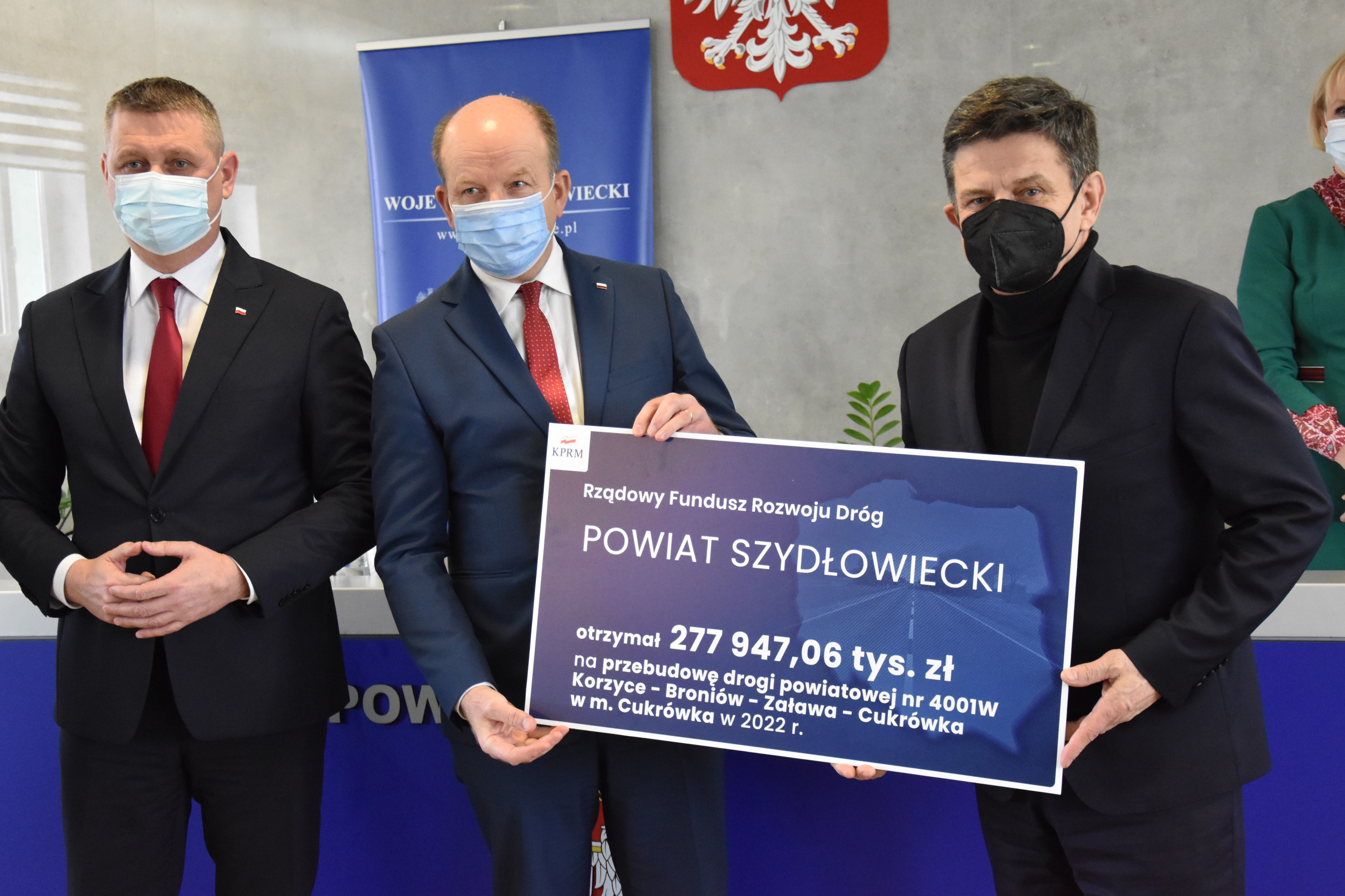 - Powiatu Szydłowieckiego – promesa na dofinansowanie w wysokości 277 947,06 zł na przebudowę drogi powiatowej nr 4001W Korzyce - Broniów - Zaława - Cukrówka w miejscowości Cukrówka;