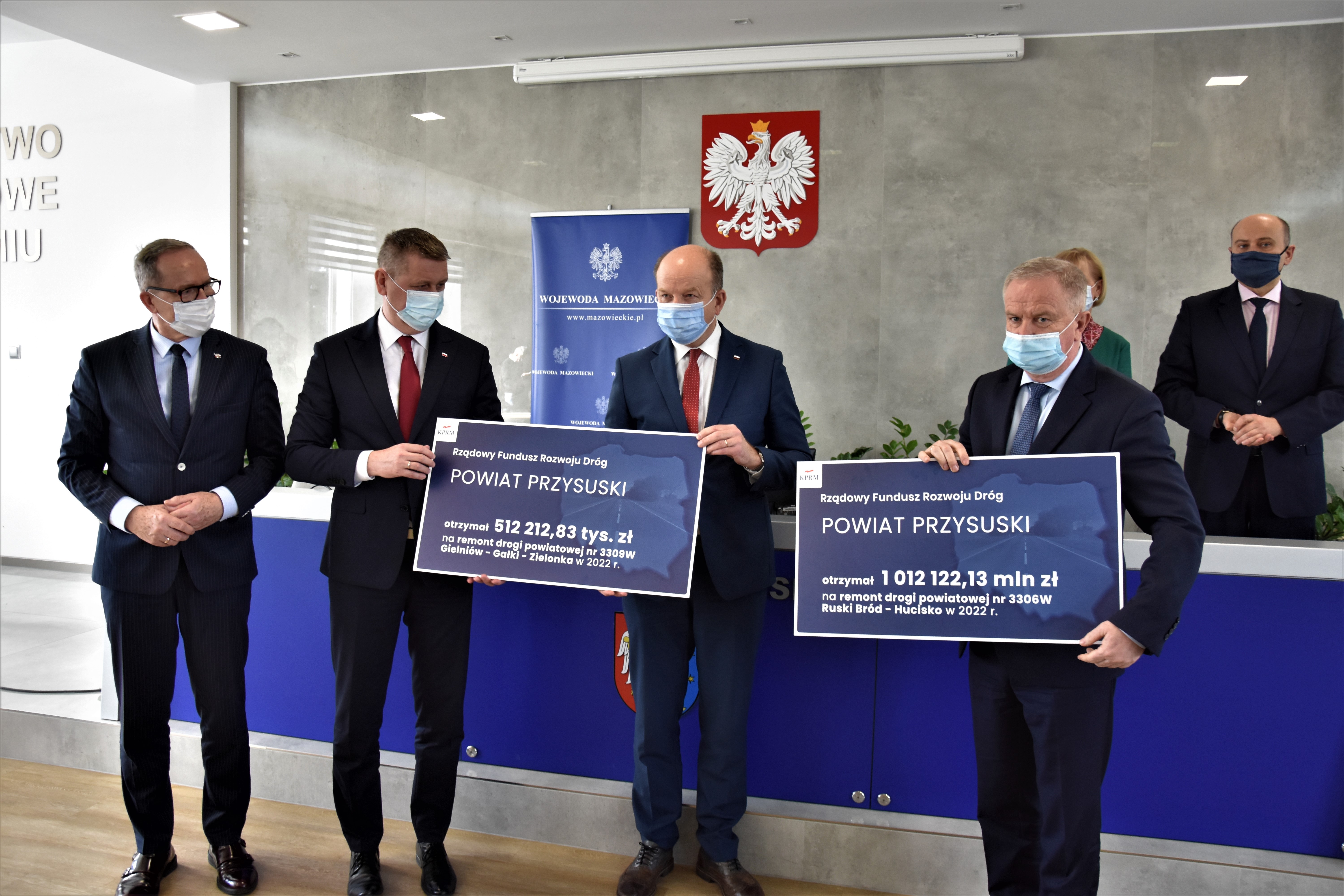 - Powiatu Przysuskiego – dwie promesy: jedna na dofinansowanie w wysokości 512 212,83 zł na remont drogi powiatowej nr 3309W Gielniów - Gałki - Zielonka oraz druga w wysokości 1 012 122, 13 zł na remont drogi powiatowej nr 3306W Ruski Bród - Hucisko - granica województwa;