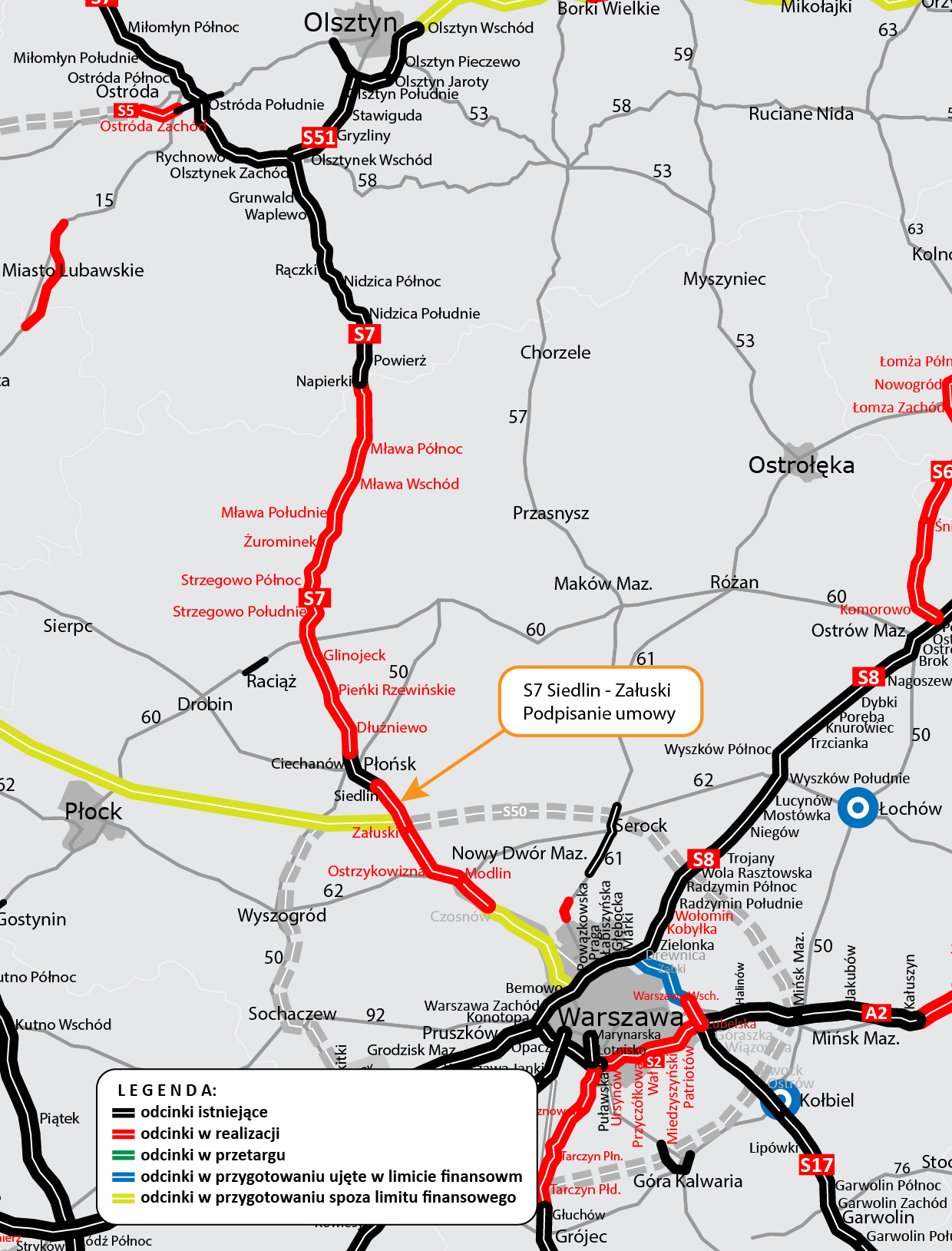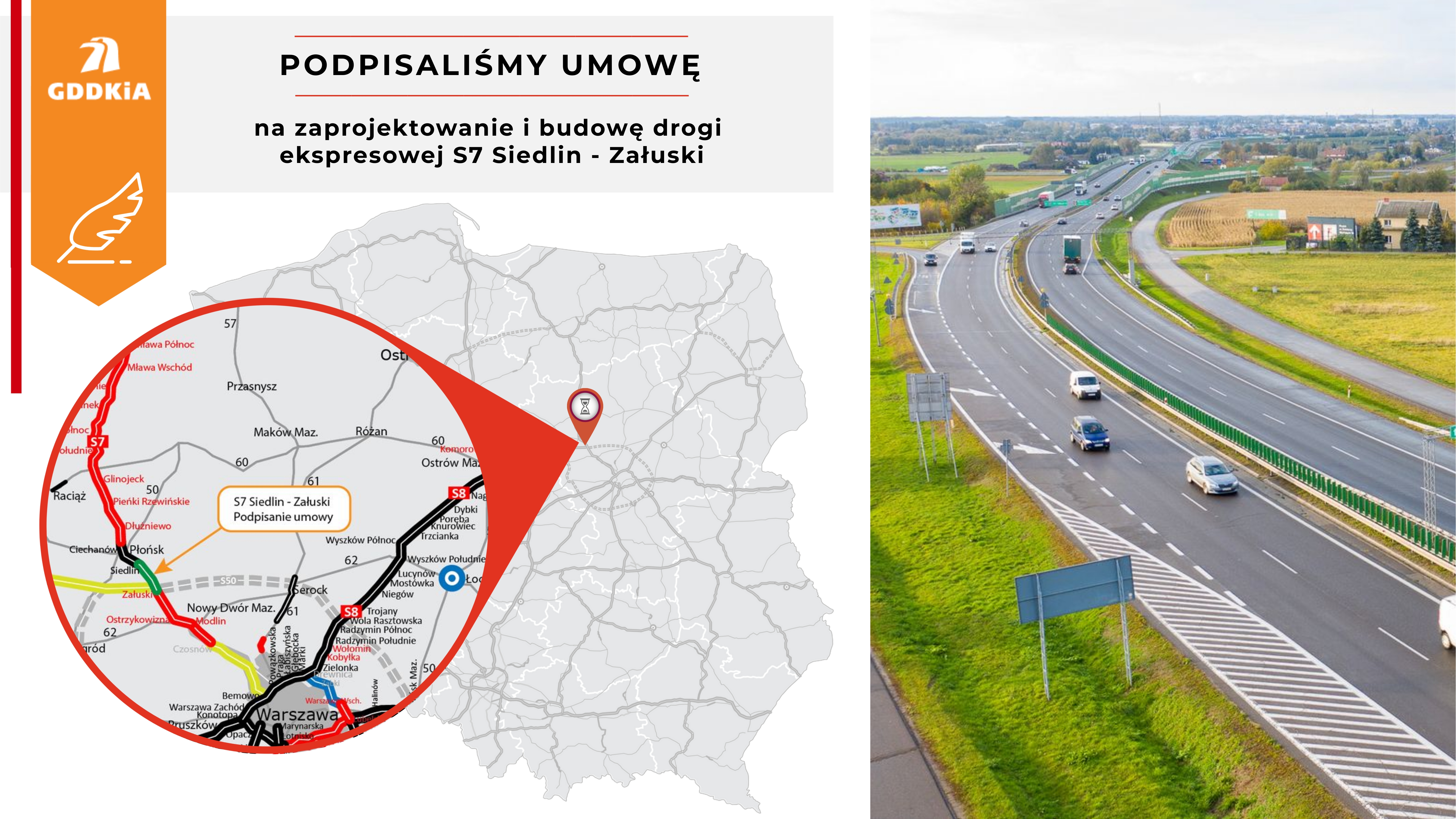 1 października 2020 r. Generalna Dyrekcja Dróg Krajowych i Autostrad podpisała umowę na zaprojektowanie i budowę ostatniego z trzech odcinków drogi ekspresowej S7 między Płońskiem a Czosnowem, prawie 13-kilometrowego odcinka S7 Siedlin – Załuski. Dzięki temu cały fragment tej trasy, od podwarszawskiego Czosnowa aż do Napierek w województwie warmińsko-mazurskim, jest już w realizacji lub użytkowaniu.