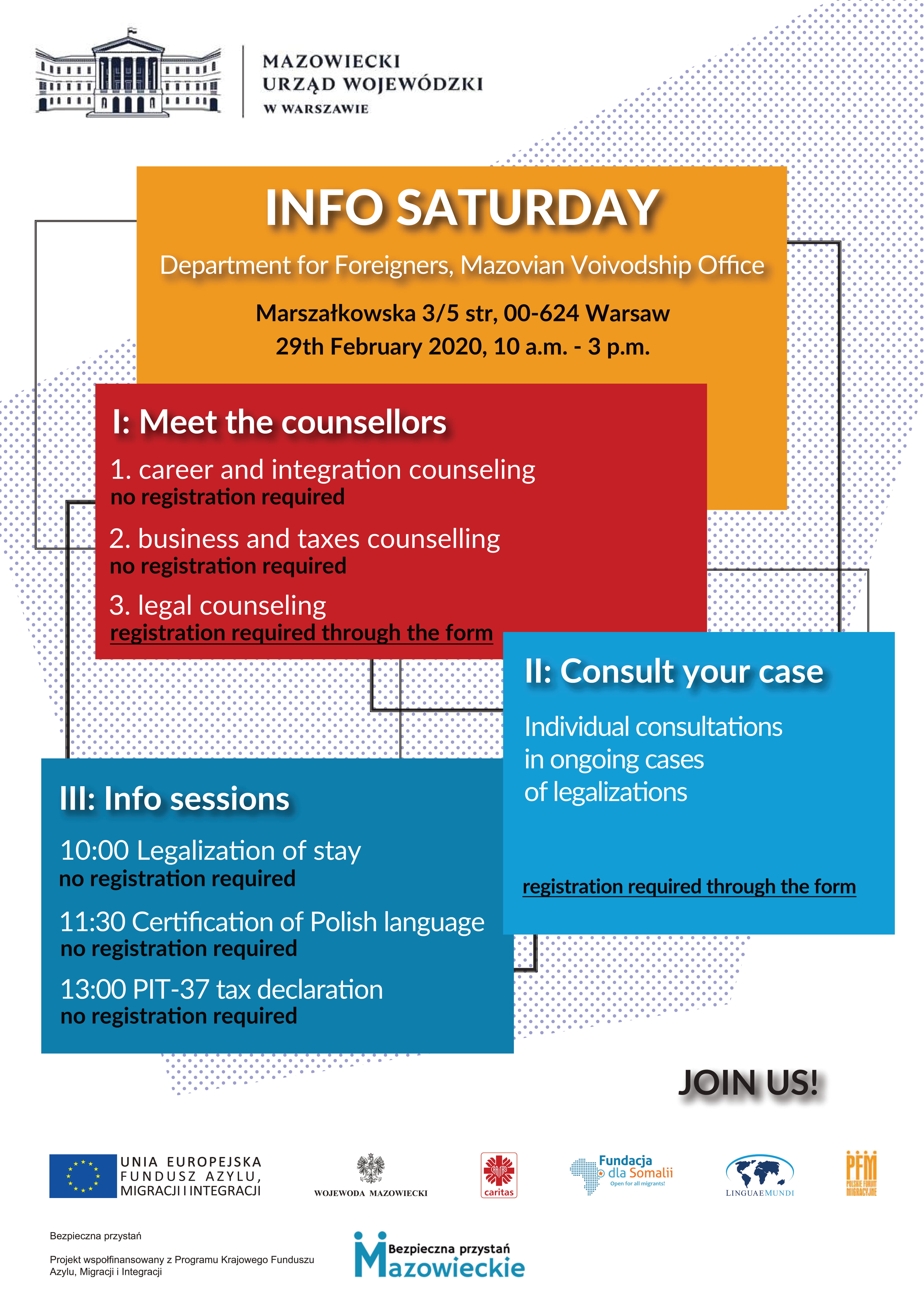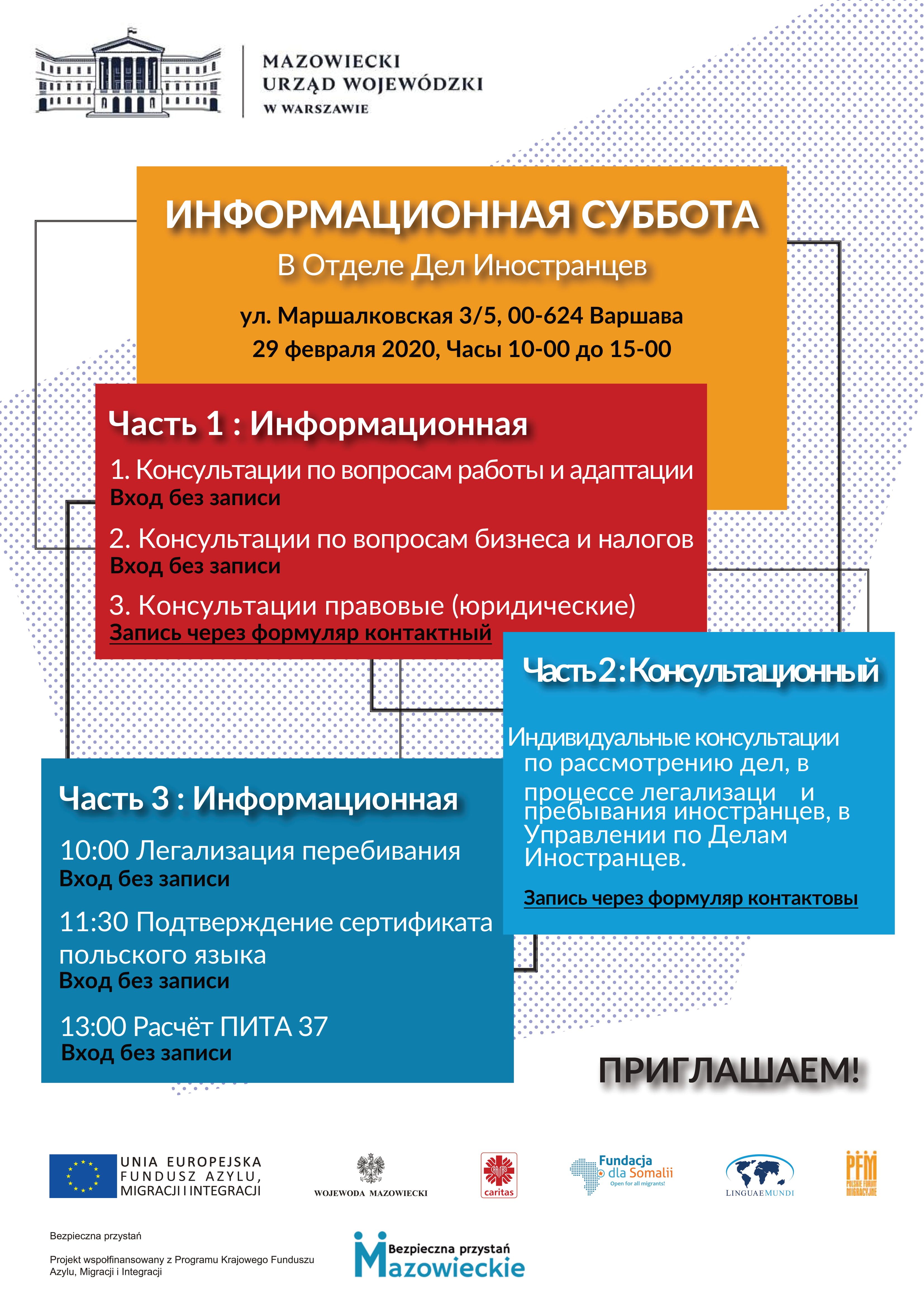 W sobotę, 29 lutego br. w Wydziale Spraw Cudzoziemców Mazowieckiego Urzędu Wojewódzkiego w Warszawie, w godzinach 10:00-15:00 odbędzie się „Sobota informacyjna”. Wydarzenie to dedykowane jest cudzoziemcom ubiegającym się o legalizację pobytu w Polsce oraz o legalne podjęcie pracy na terenie województwa mazowieckiego. Ze względu na zindywidualizowany charakter wydarzenia, podzielono go na 3 moduły tematyczne: informacyjny, konsultacyjny oraz sesje informacyjne.