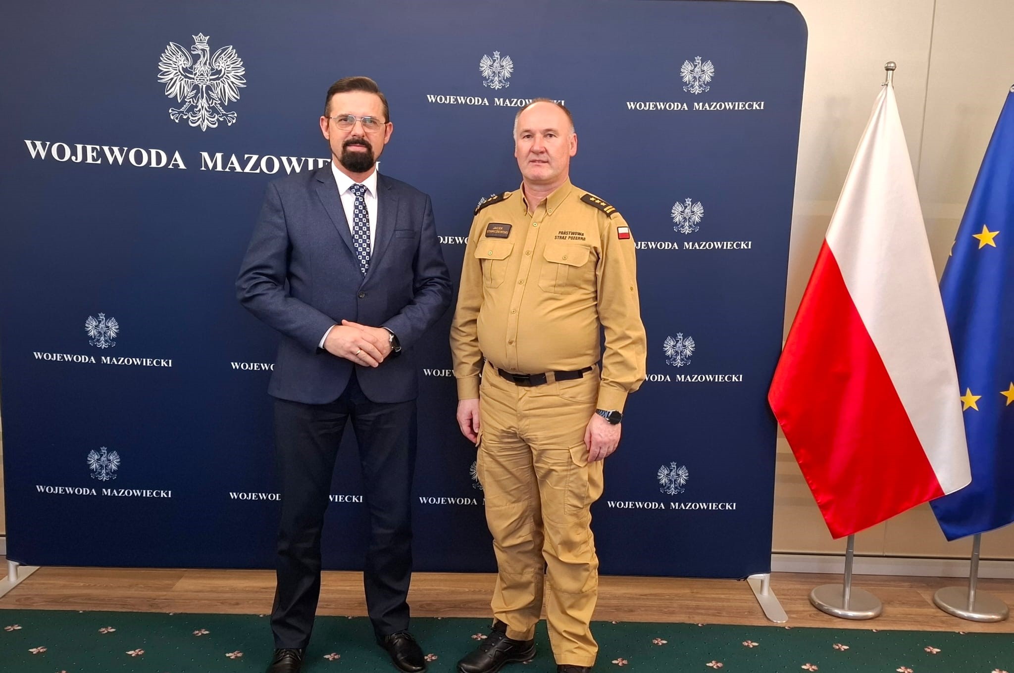 Potrzeby Państwowej Straży Pożarnej i druhów z Ochotniczych Straży Pożarnych, modernizacja sprzętu ratowniczo-gaśniczego oraz rozwój infrastruktury zabezpieczającej to tylko niektóre z tematów poruszonych podczas spotkania Kierownika Delegatury Mazowieckiego Urzędu Wojewódzkiego w Płocku Bogdana Banaszczaka z st. bryg. Jackiem Starczewskim.