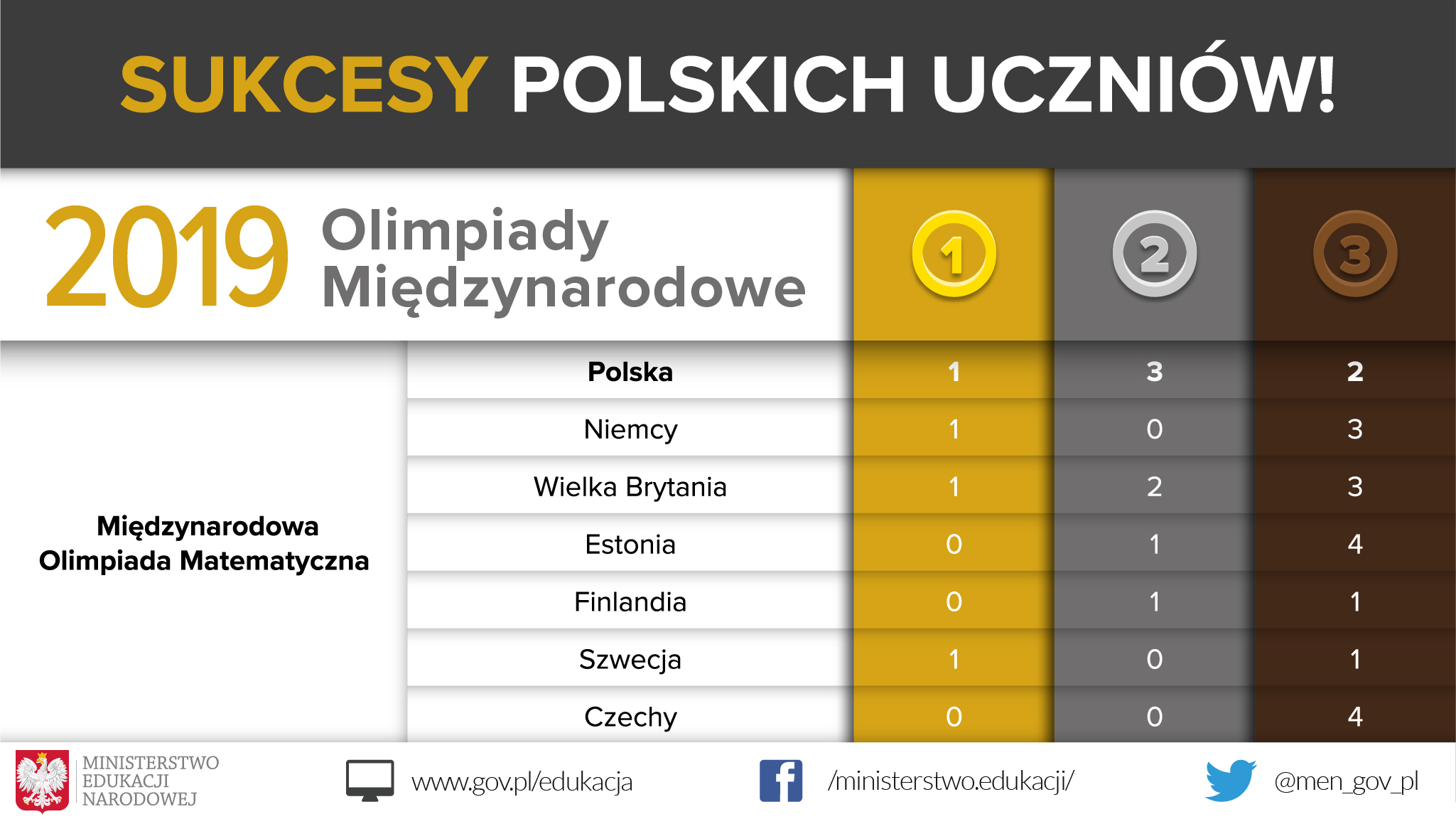 Złoty medal na Międzynarodowej Olimpiadzie Matematycznej, 4 srebrne medale na Międzynarodowej Olimpiadzie Biologicznej i 3 srebrne krążki na Międzynarodowej Olimpiadzie Geograficznej oraz Chemicznej – to najważniejsze osiągnięcia polskich uczniów na międzynarodowych zawodach edukacyjnych w 2019 r. Łącznie nasi uczniowie w 8 olimpiadach międzynarodowych w ubiegłym roku zdobyli aż 30 krążków: 1 złoty, 19 srebrnych i 10 brązowych. Historyczny sukces odnieśli młodzi matematycy, którzy na zawodach w Wielkiej Brytanii wywalczyli aż 6 medali. Przedstawiamy zestawienie naszych osiągnięć na międzynarodowych olimpiadach przedmiotowych i interdyscyplinarnych w 2019 r.