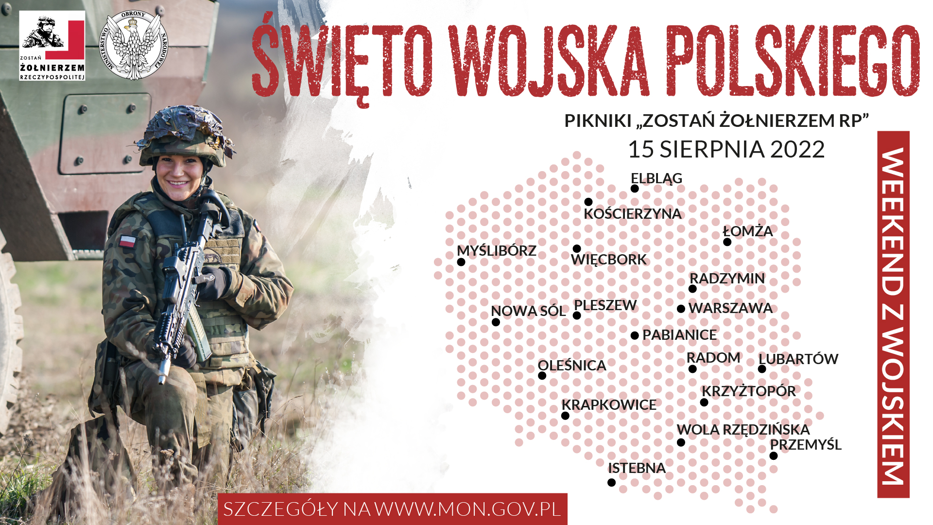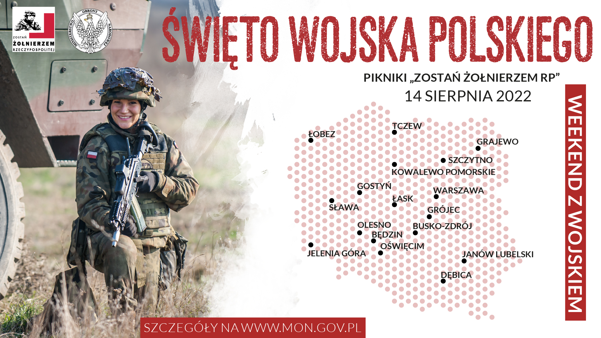 - *14.00 – 18.00 – 15 miejscowości (mapa) – pikniki wojskowe pod hasłem „Zostań Żołnierzem RP”