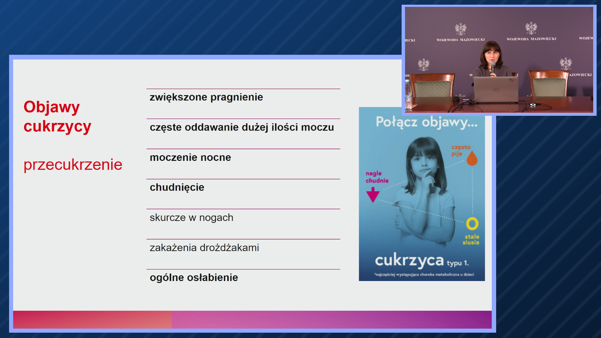 Wydział Zdrowia Mazowieckiego Urzędu Wojewódzkiego z inicjatywy Ministra Zdrowia, przy współpracy Wojewódzkiego Kuratora Oświaty oraz lekarzy specjalistów w dziedzinie diabetologii zorganizował szkolenie „Dziecko z cukrzycą”. W wydarzeniu, które odbyło się 3 listopada br., uczestniczyli: Wojewoda Mazowiecki Konstanty Radziwiłł, Dyrektor Wydziału Zdrowia MUW Tomasz Sławatyniec, Zastępca Dyrektora Wydziału Zdrowia MUW Urszula Kuroczycka, Dyrektor Wydziału Wychowania i Kształcenia Specjalnego Kuratorium Oświaty w Warszawie Małgorzata Wojtaszewska oraz diabetolog dr n. med. Lidia Groele.