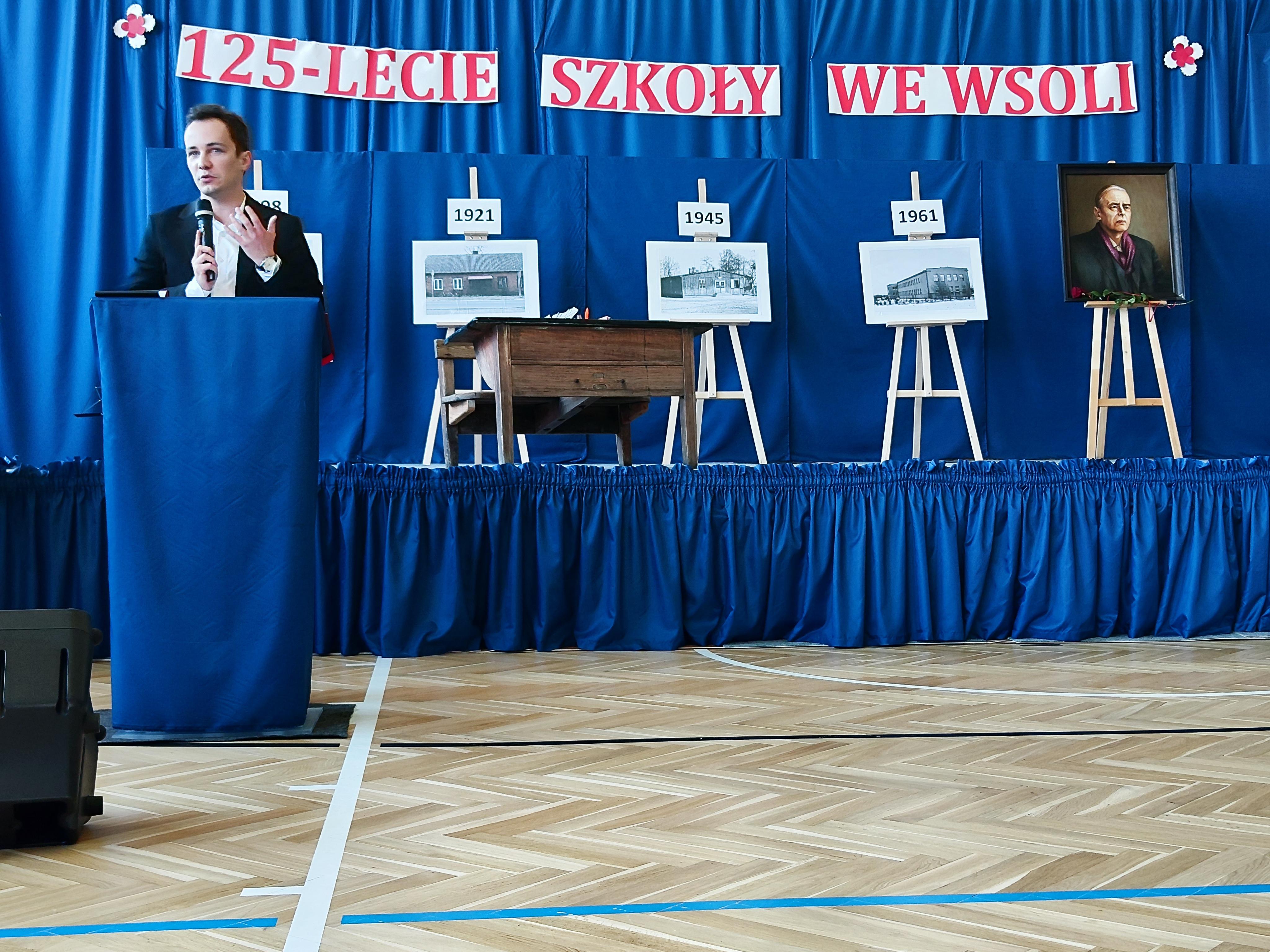 - Szkołę tworzą ludzie: uczniowie, nauczyciele, rodzice, pracownicy administracji i to dzięki nim, nie pustym murom, wspominany szkolne lata. Dziękuję wszystkim tym, którzy dzisiaj i w przeszłości przyczyniają się oraz przyczyniali się do rozwoju szkoły we Wsoli - oddajecie temu miejscu całe swoje serce i tak przez pokolenia, przez 125 lat, niezłomnie - mimo zaborów, mimo wojen. Co ciekawe, szkoła, której patronem jest pisarz Witold Gombrowicz, znajduje się w sąsiedztwie należącego do nich pałacu. W czasach, gdy był on zamieszkiwany jeszcze przez Gombrowiczów, rodzina pisarza wspierała działalność placówki. Obecnie szkoła z dumą pielęgnuje swoją historię i pamięć o patronie. Gratuluję pięknego jubileuszu i życzę wielu lat istnienia i wychowania nowych pokoleń absolwentów – podkreślił Wicewojewoda Mazowiecki Patryk Fajdek.