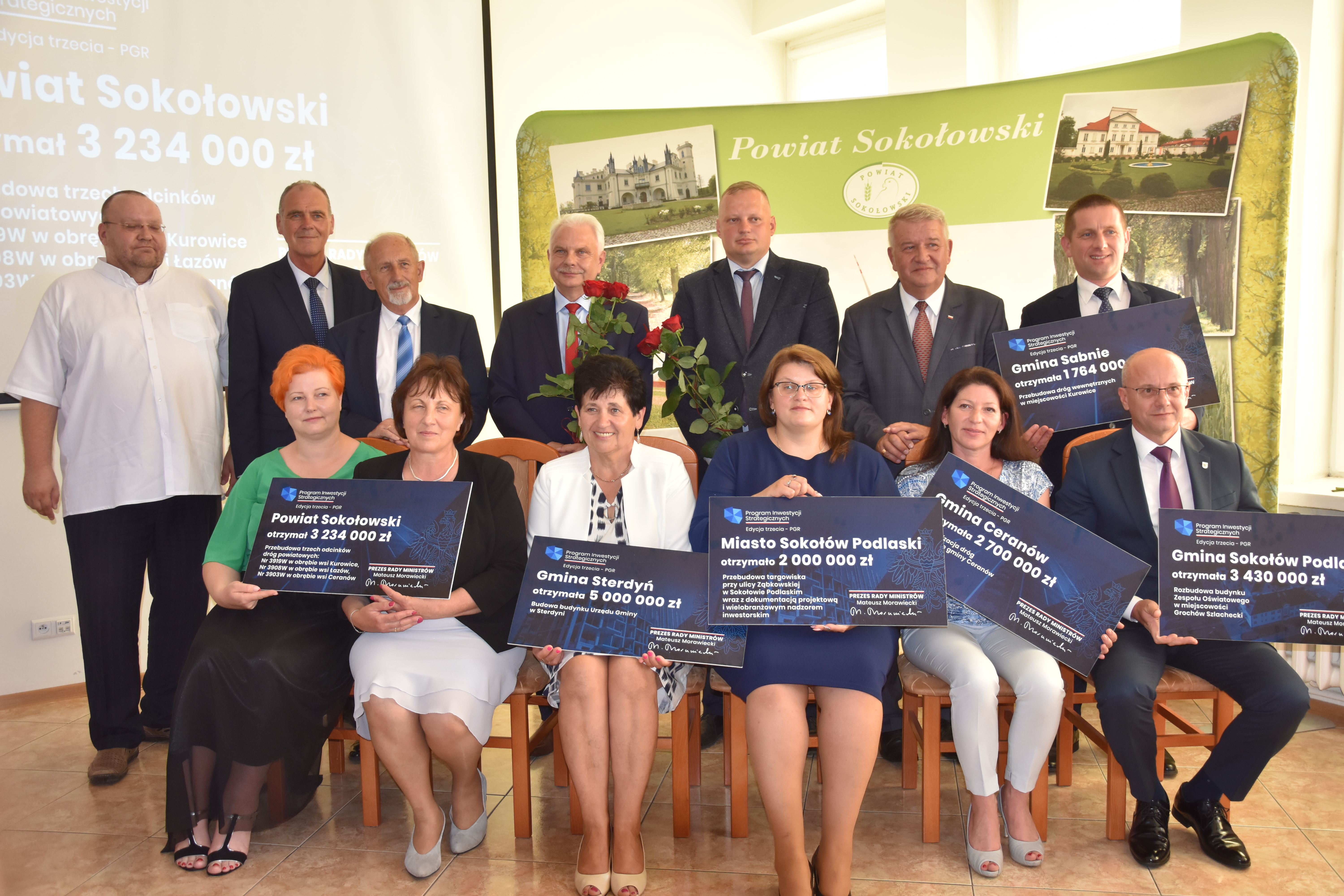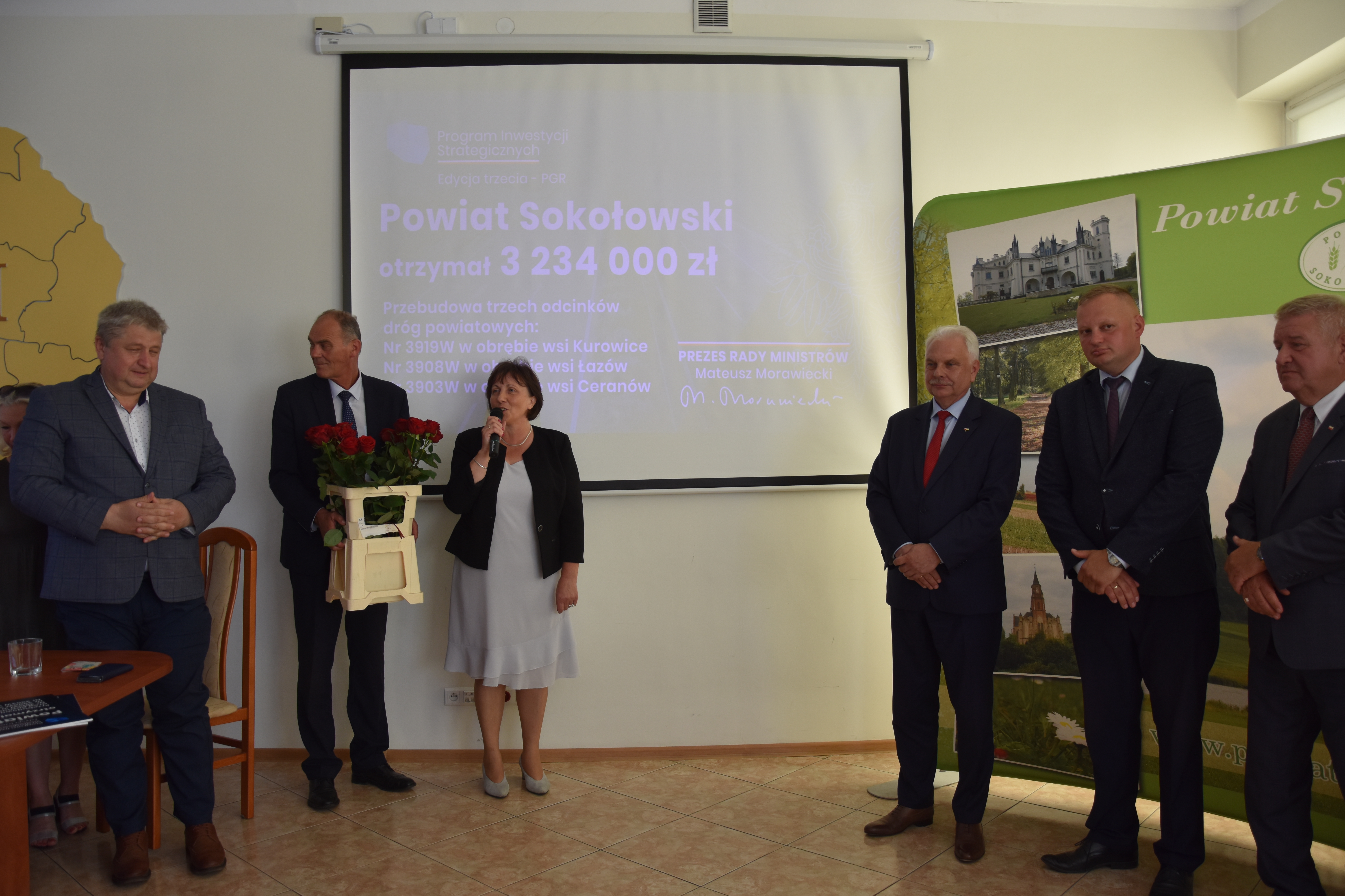 Powiat Sokołowski na kwotę 3 234 000 zł na przebudowę trzech odcinków dróg powiatowych: nr 3919W w obrębie wsi Kurowice, nr 3908W w obrębie wsi Łazów, nr 3903W w obrębie wsi Ceranów.