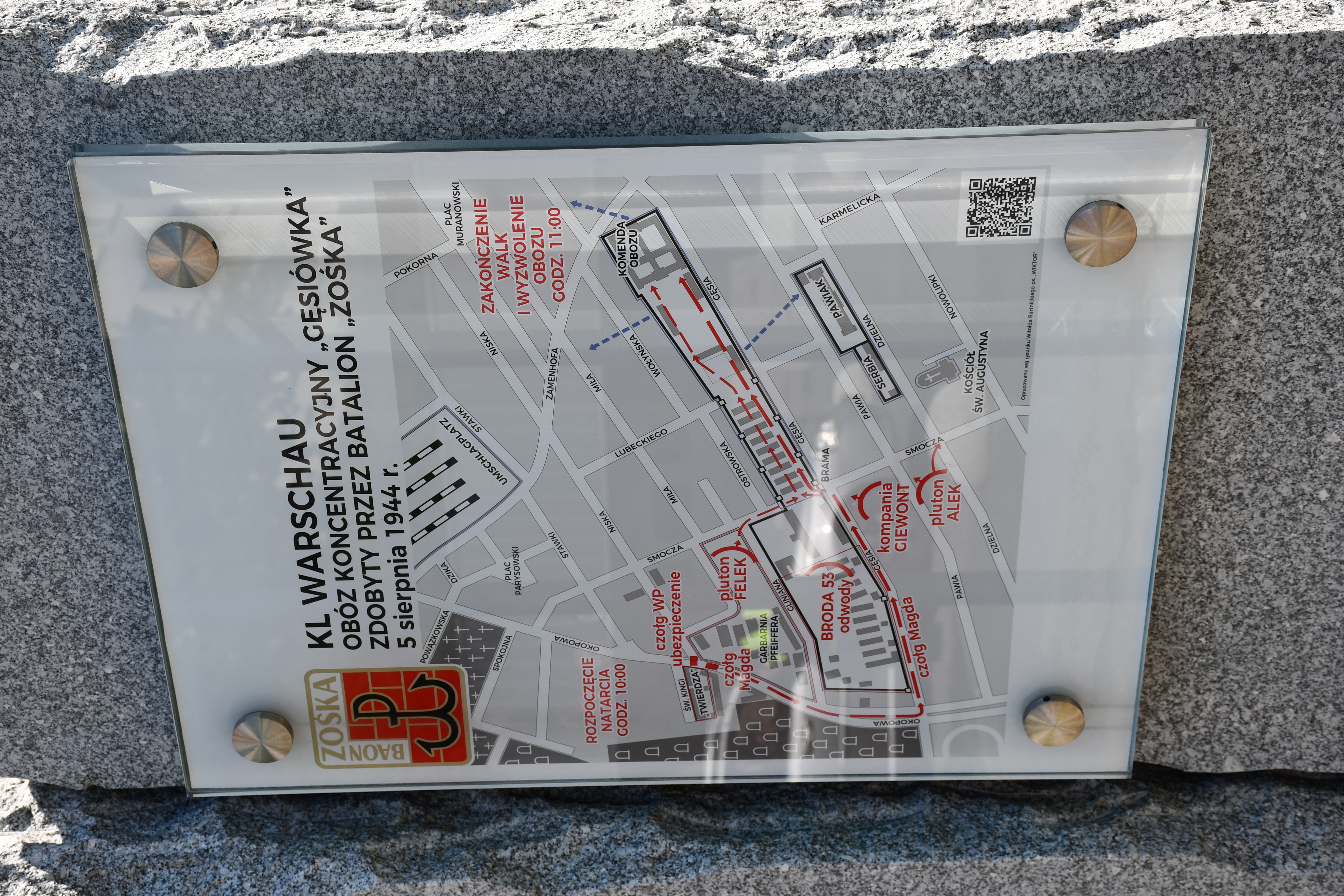 Uroczystości odbyły się w miejscu upamiętnienia akcji oraz oswobodzonych więźniów, w którym usytuowano kamienne bloki, na których umieszczone zostały tablice pamiątkowe przeniesione z budynku przy ul. Anielewicza 34. Miejsce to znajduje się w pobliżu lokalizacji niemieckiego bunkra, strzegącego terenu obozu. Obóz „Gęsiówka” został wyzwolony przez oddziały powstańcze AK.