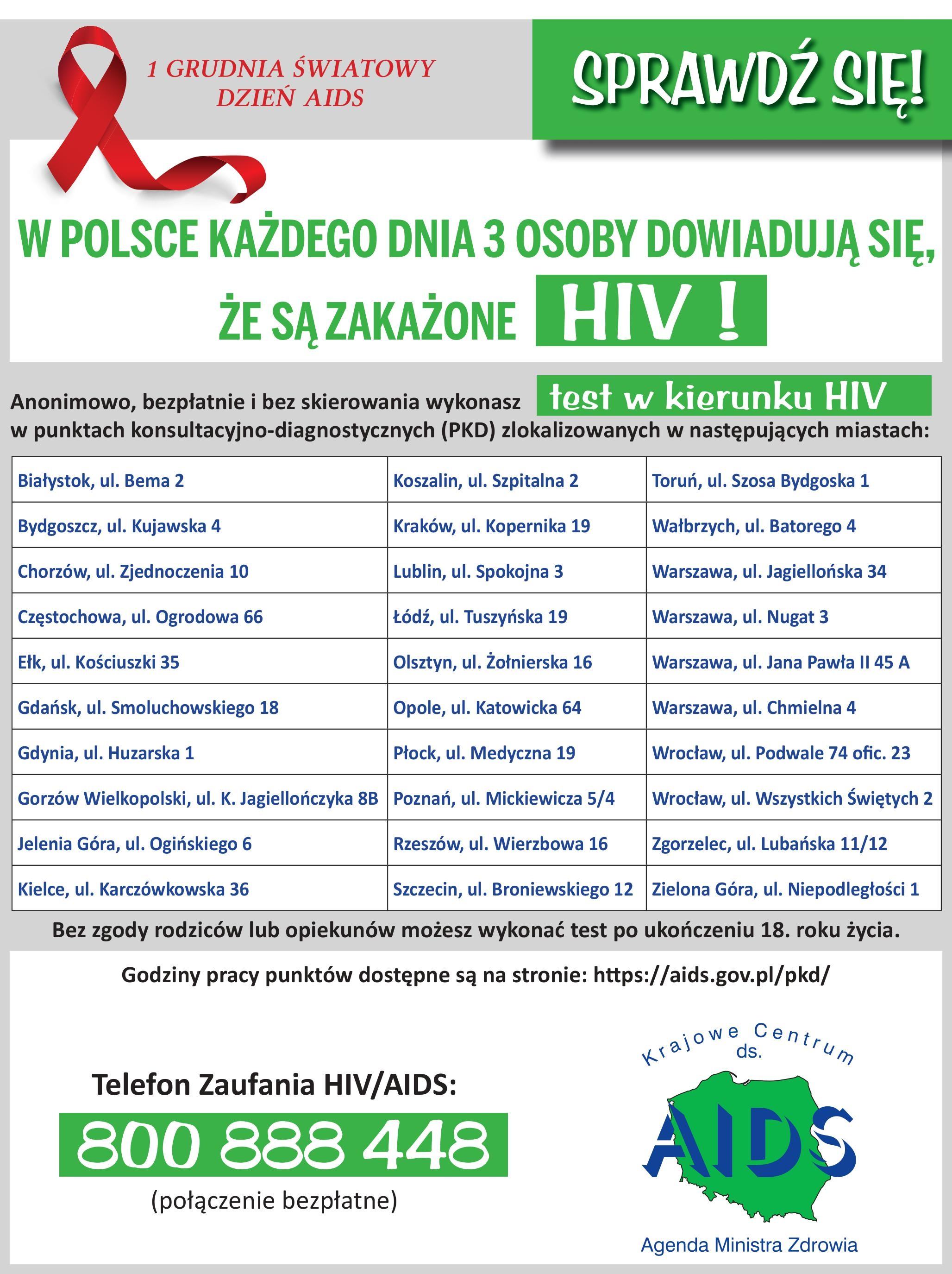 Jeśli ktoś ma wątpliwości lub pytania, związane z HIV czy innymi chorobami przenoszonymi drogą płciową, może zadzwonić pod bezpłatny numer Telefonu Zaufania HIV/AIDS: 800 888 448. Do końca grudnia telefon będzie pracował całodobowo. Profesjonalni konsultanci odpowiedzą na wszystkie pytania i pokierują do odpowiedniego specjalisty lub na test.