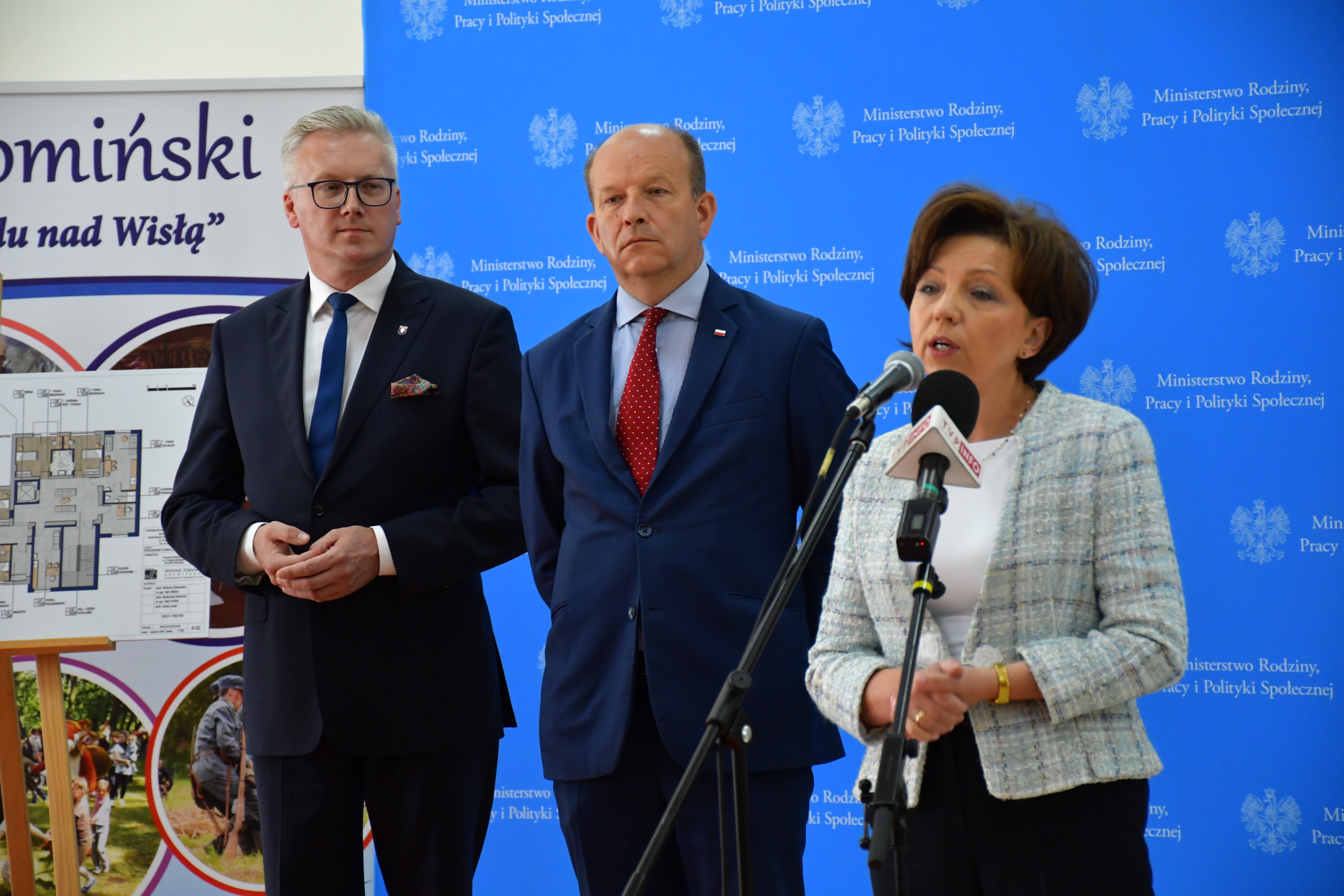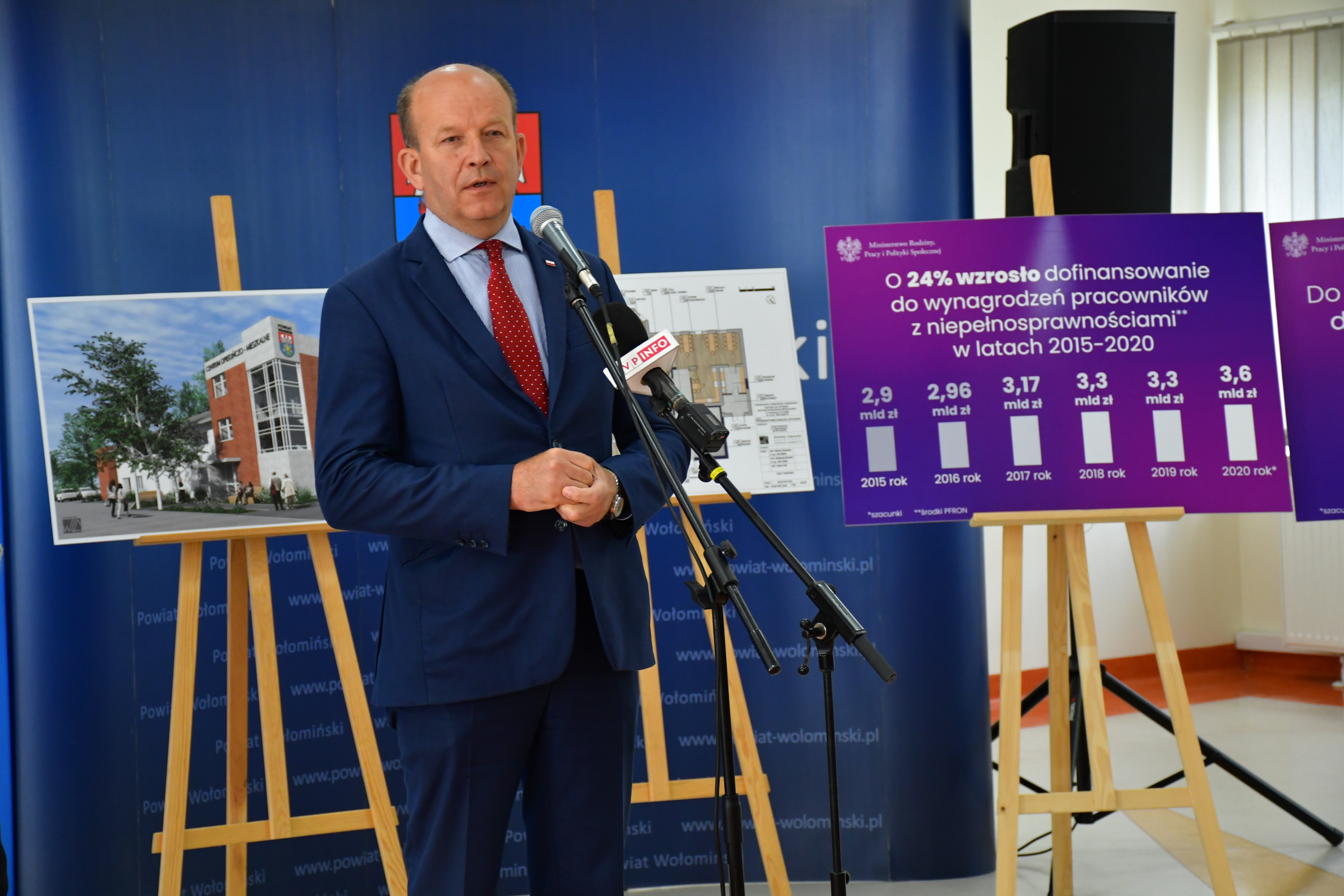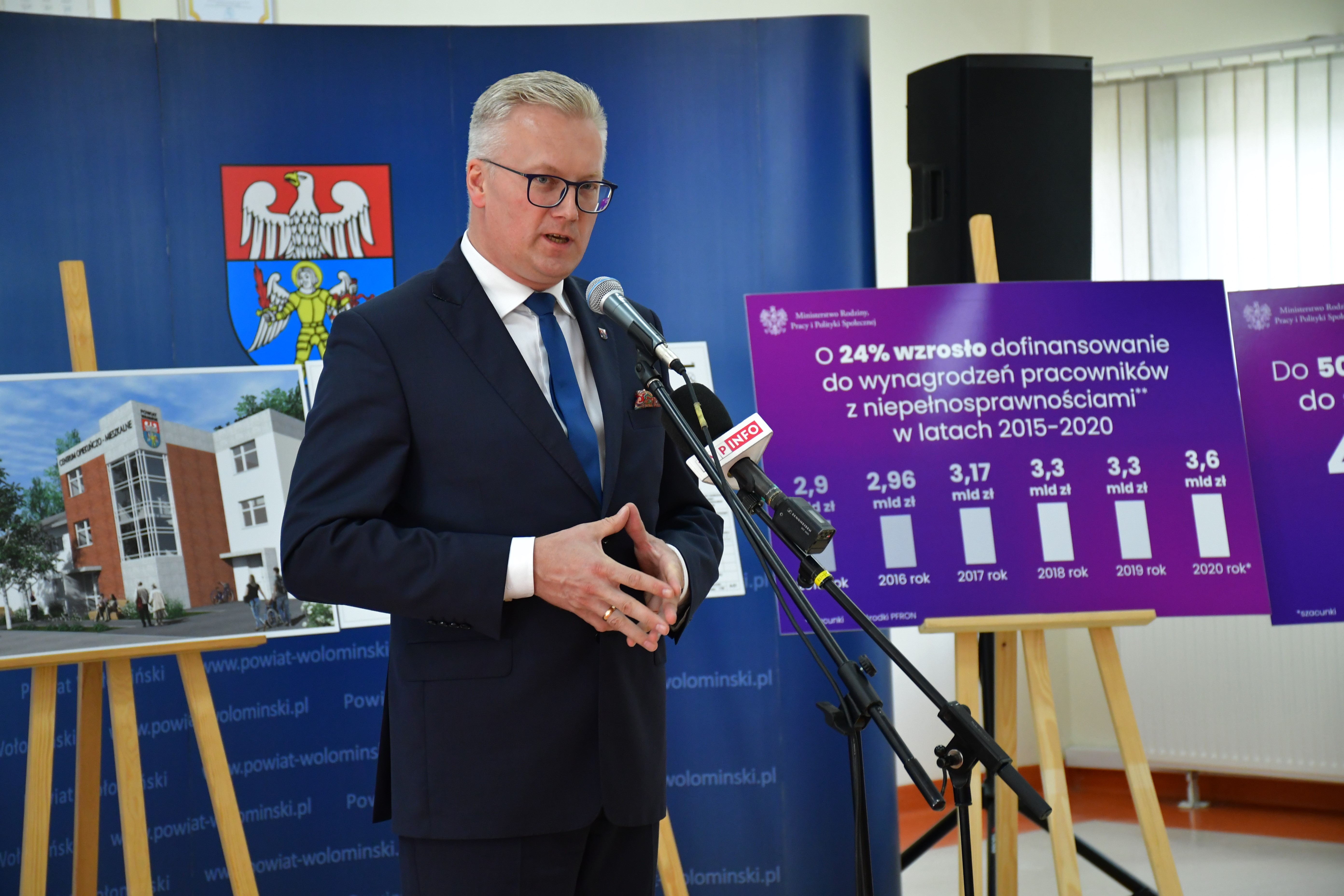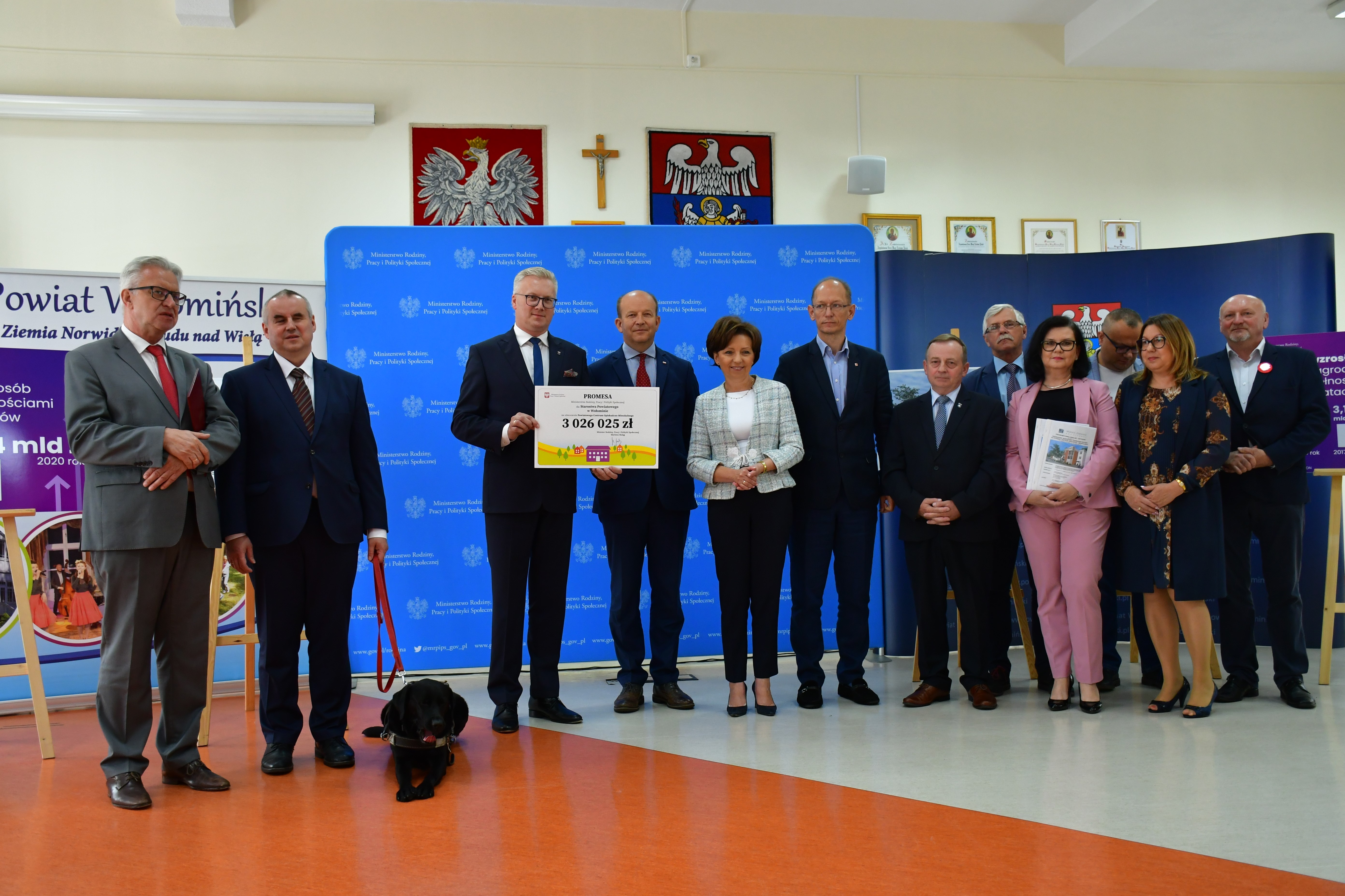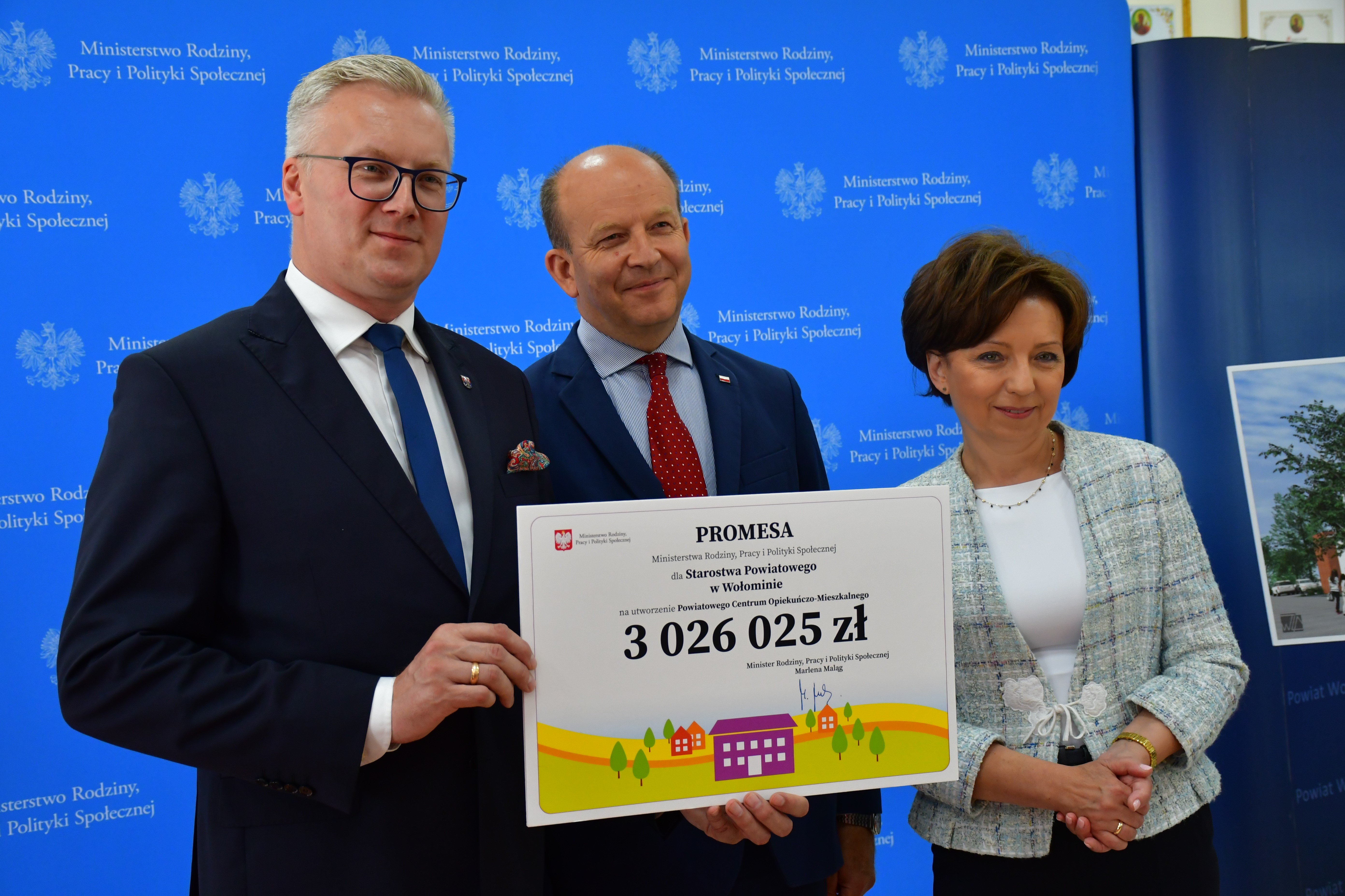 We wtorek Minister Rodziny, Pracy i Polityki Społecznej Marlena Maląg oraz Pełnomocnik Rządu ds. Osób Niepełnosprawnych Paweł Wdówik wręczyli na ręce Adama Lubiaka, Starosty Wołomińskiego, promesę na ponad 3 mln zł na utworzenie Powiatowego Centrum Opiekuńczo-Mieszkalnego. W wydarzeniu uczestniczyli też Wojewoda Mazowiecki Konstanty Radziwiłł oraz Prezes Państwowego Funduszu Rehabilitacji Osób Niepełnosprawnych Krzysztof Michałkiewicz.