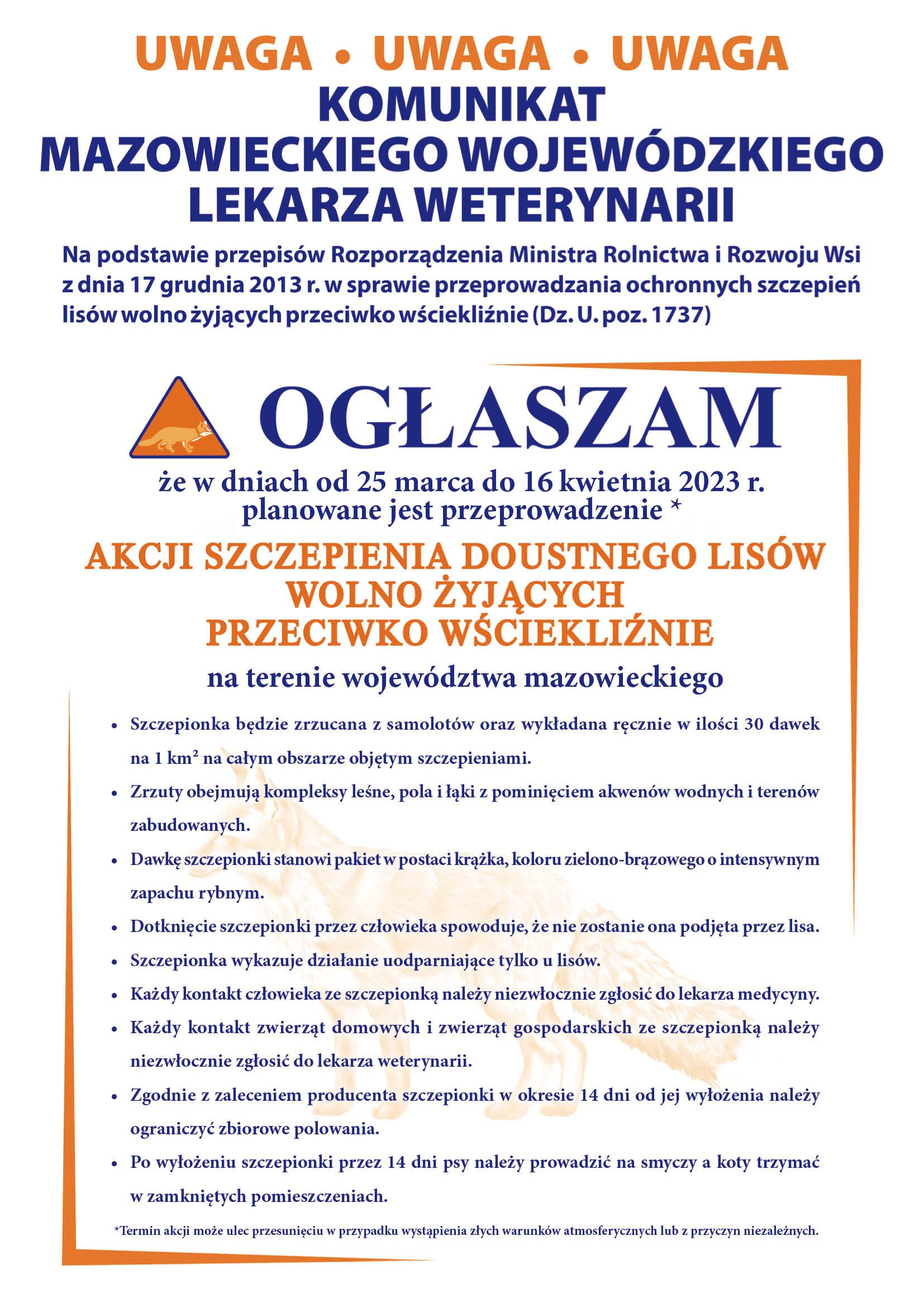 Od 25 marca do 16 kwietnia 2023 r. Mazowiecki Wojewódzki Lekarz Weterynarii z udziałem Powiatowych Lekarzy Weterynarii przeprowadzi wiosenną akcję szczepienia lisów wolno żyjących przeciwko wściekliźnie na terenie województwa mazowieckiego. Szczepionka będzie wykładana ręcznie oraz zrzucana z samolotów na lasy, pola i łąki. Przynęty ze szczepionką nie wolno dotykać. Zwierzęta nie przyjmą tych z zapachem człowieka. Przez dwa tygodnie od wyłożenia szczepionki należy zachować ostrożność podczas wyprowadzania zwierząt.