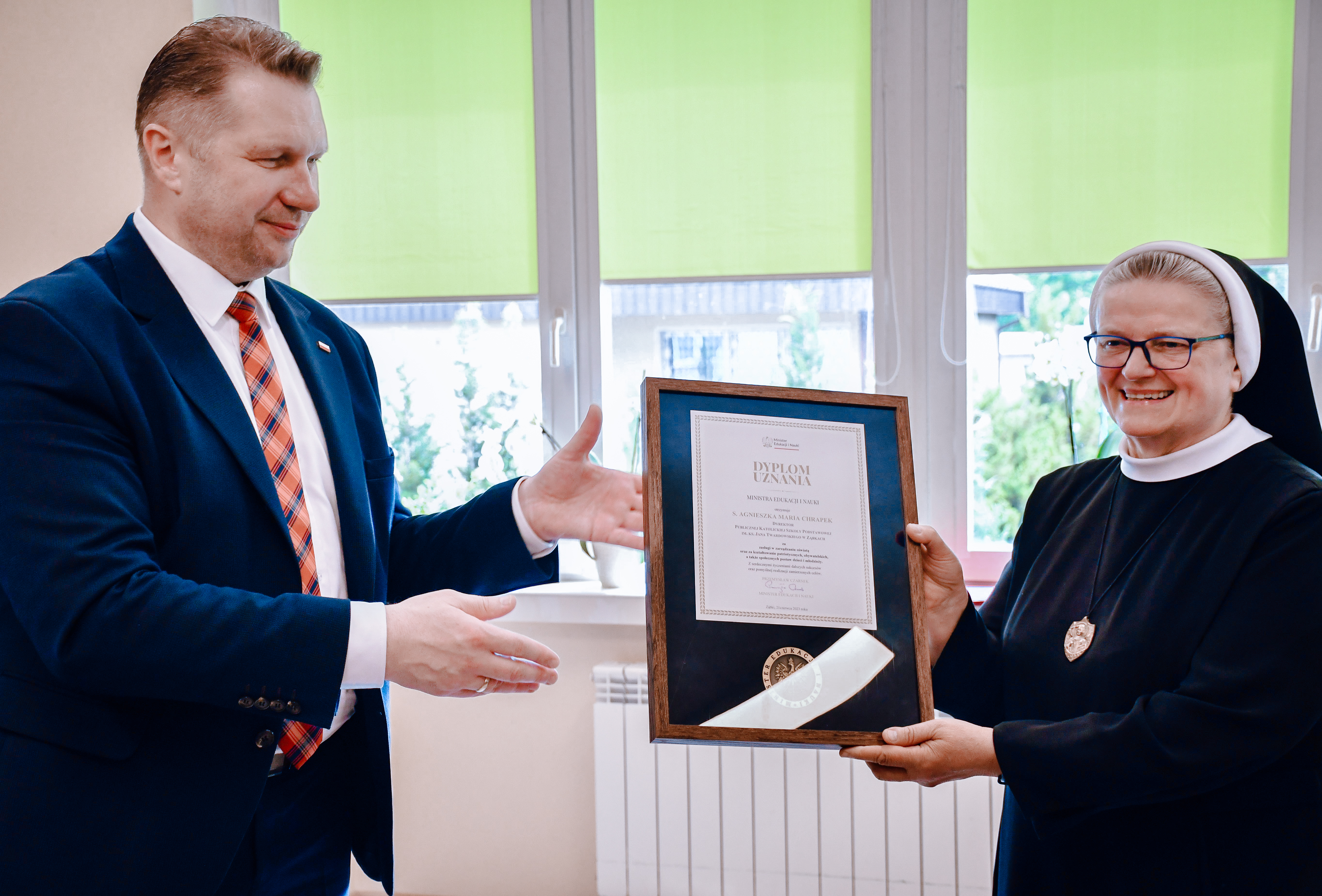 Następnie, w sali gimnastycznej, Minister spotkał się z uczniami klas 6-8. Miały miejsce okolicznościowe przemówienia zaproszonych gości, po których Minister Edukacji i Nauki Przemysław Czarnek wręczył medal i dyplom uznania Dyrektor Publicznej Katolickiej Szkoły Podstawowej im. ks. Jana Twardowskiego w Ząbkach siostrze Marii Chrapek, jak również złożył na ręce jednego z uczniów Laur Niepodległości.