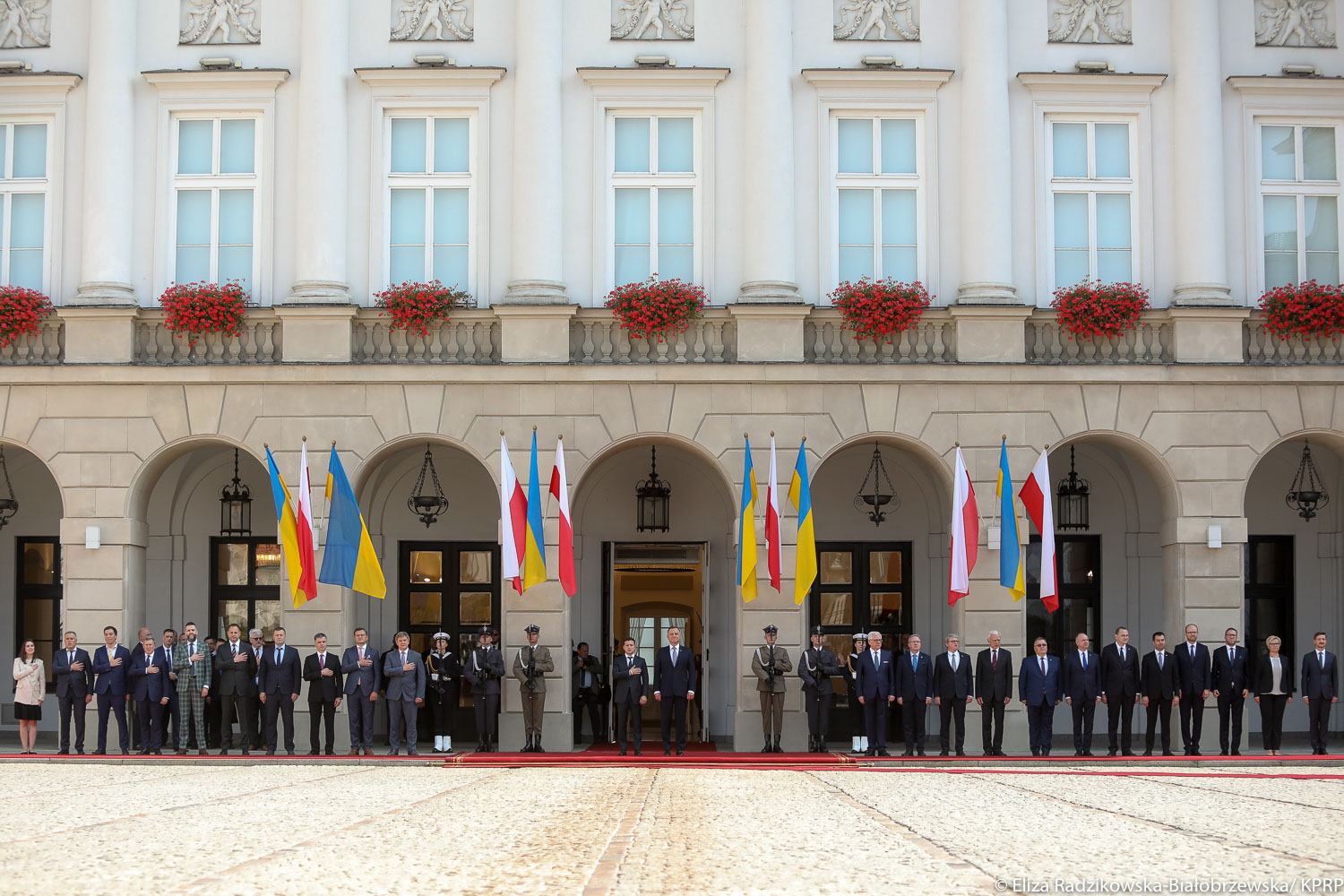 Oficjalne powitanie Prezydenckiej Pary przez Prezydenta RP Andrzeja Dudę odbyło się na dziedzińcu Pałacu Prezydenckiego.