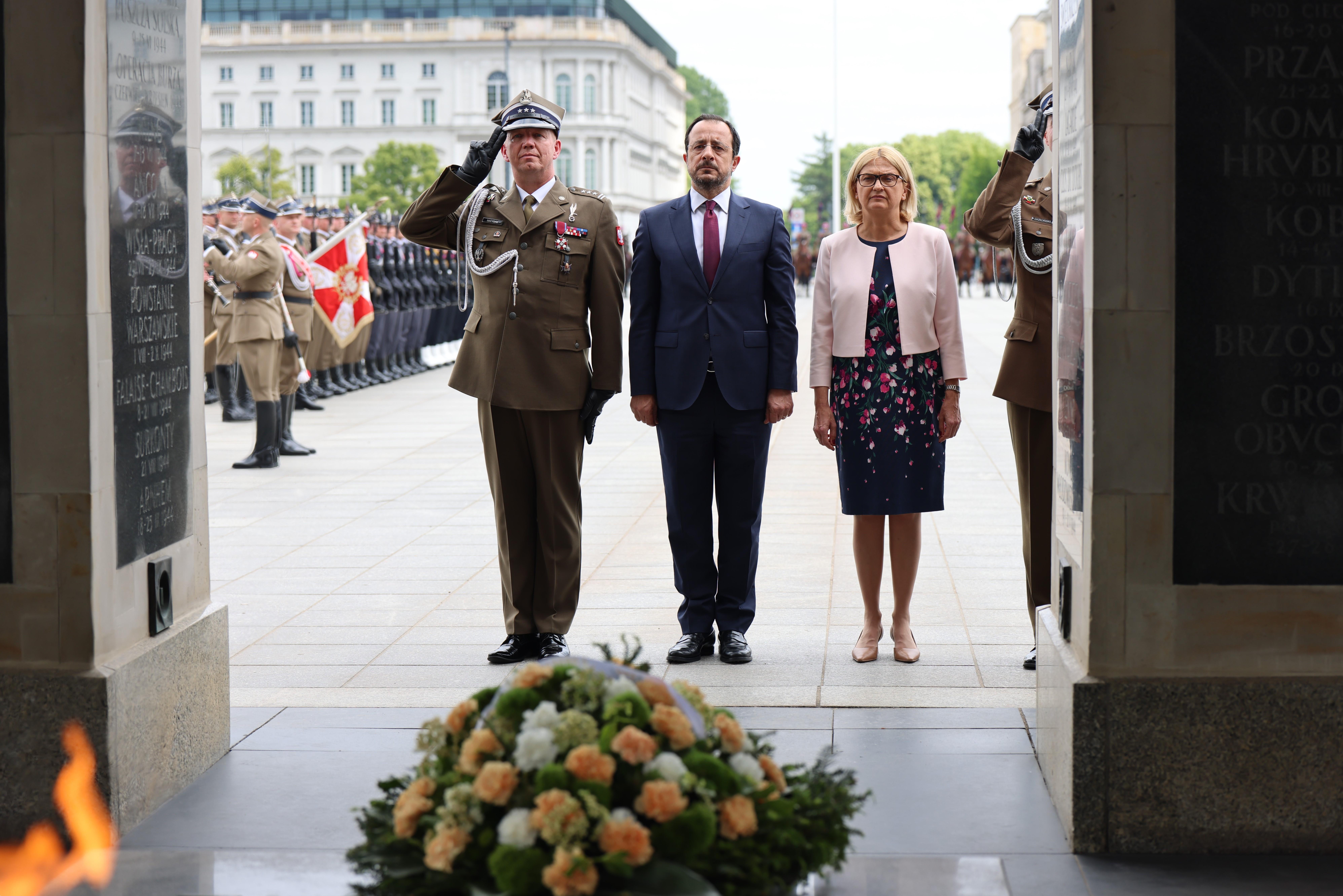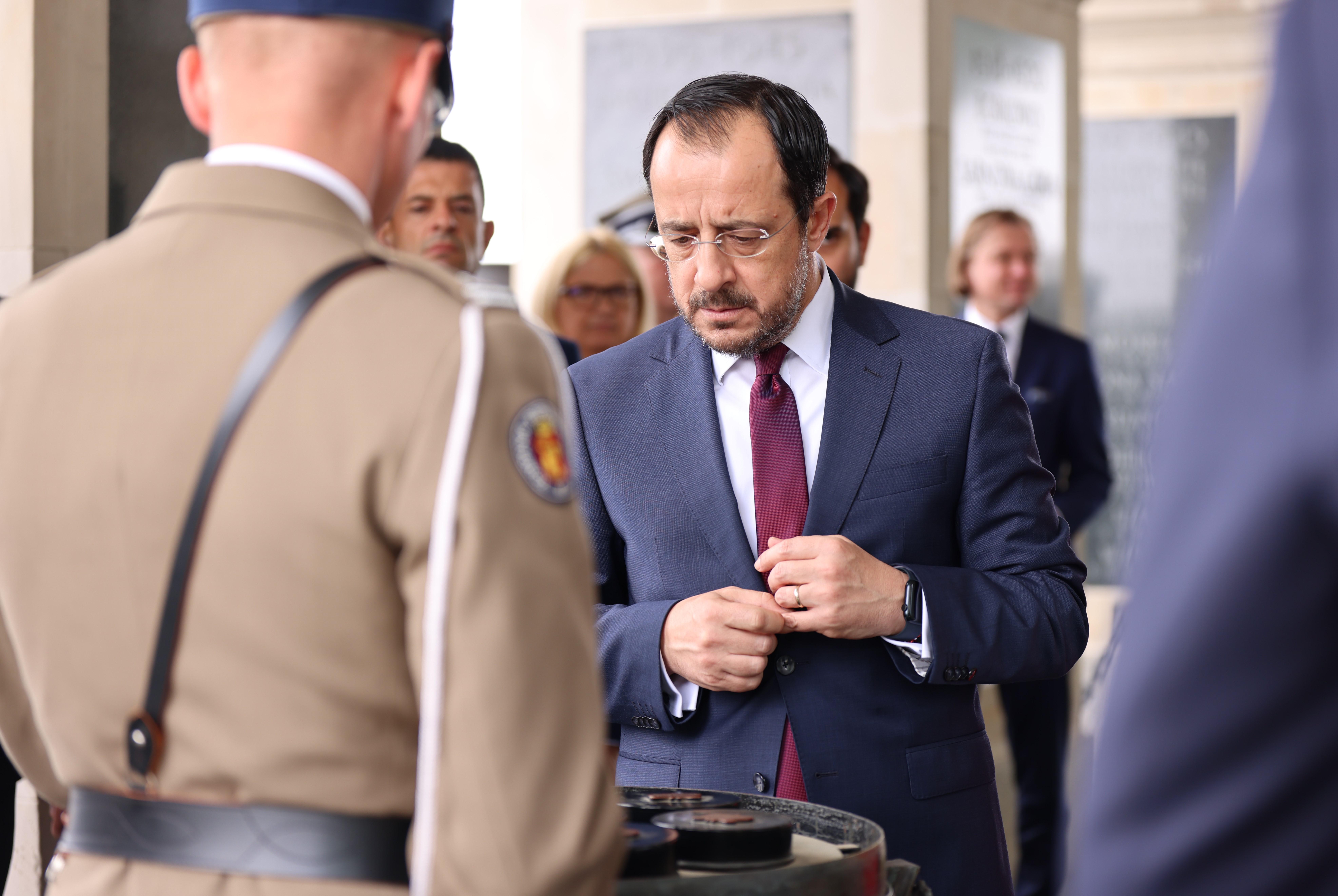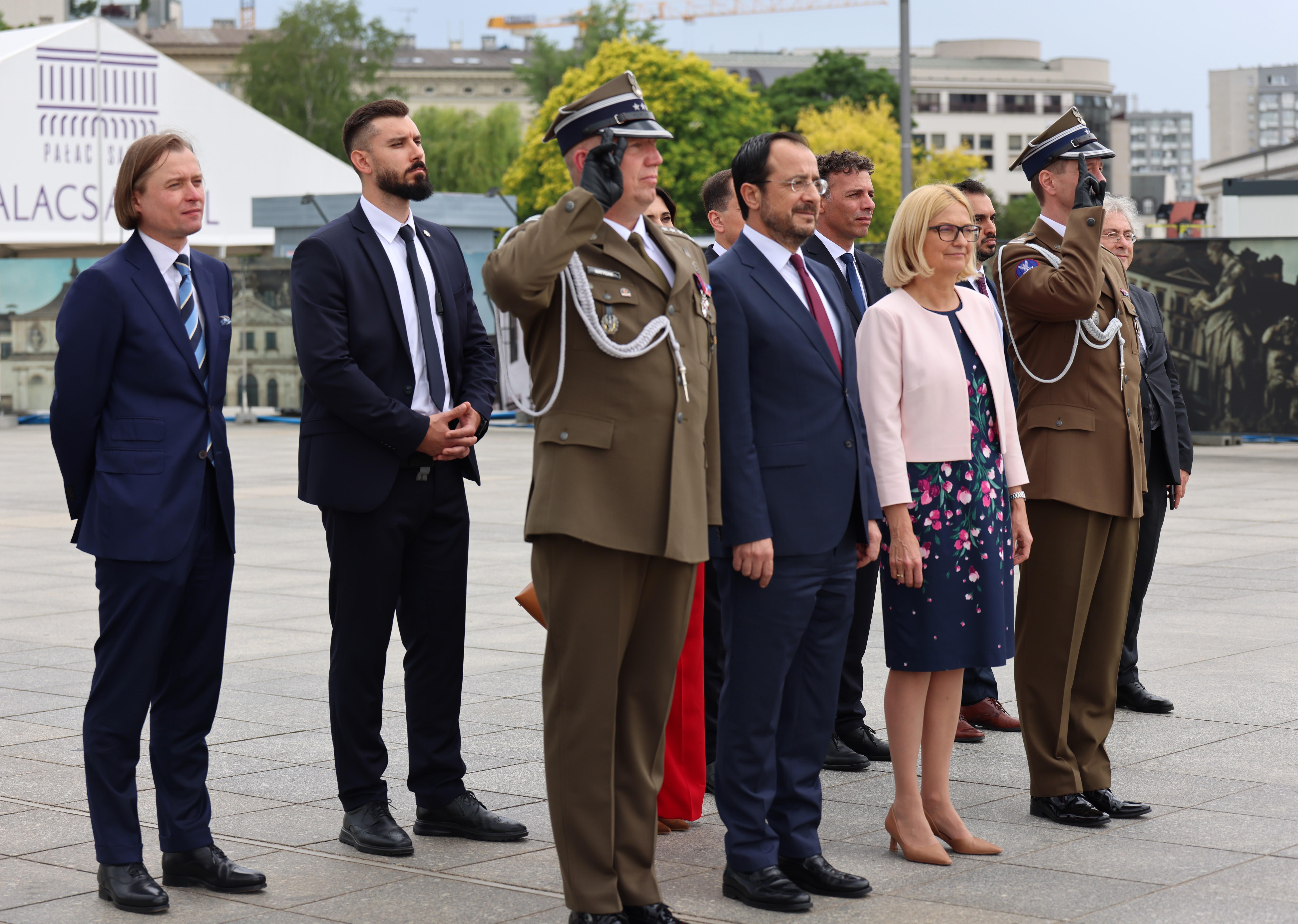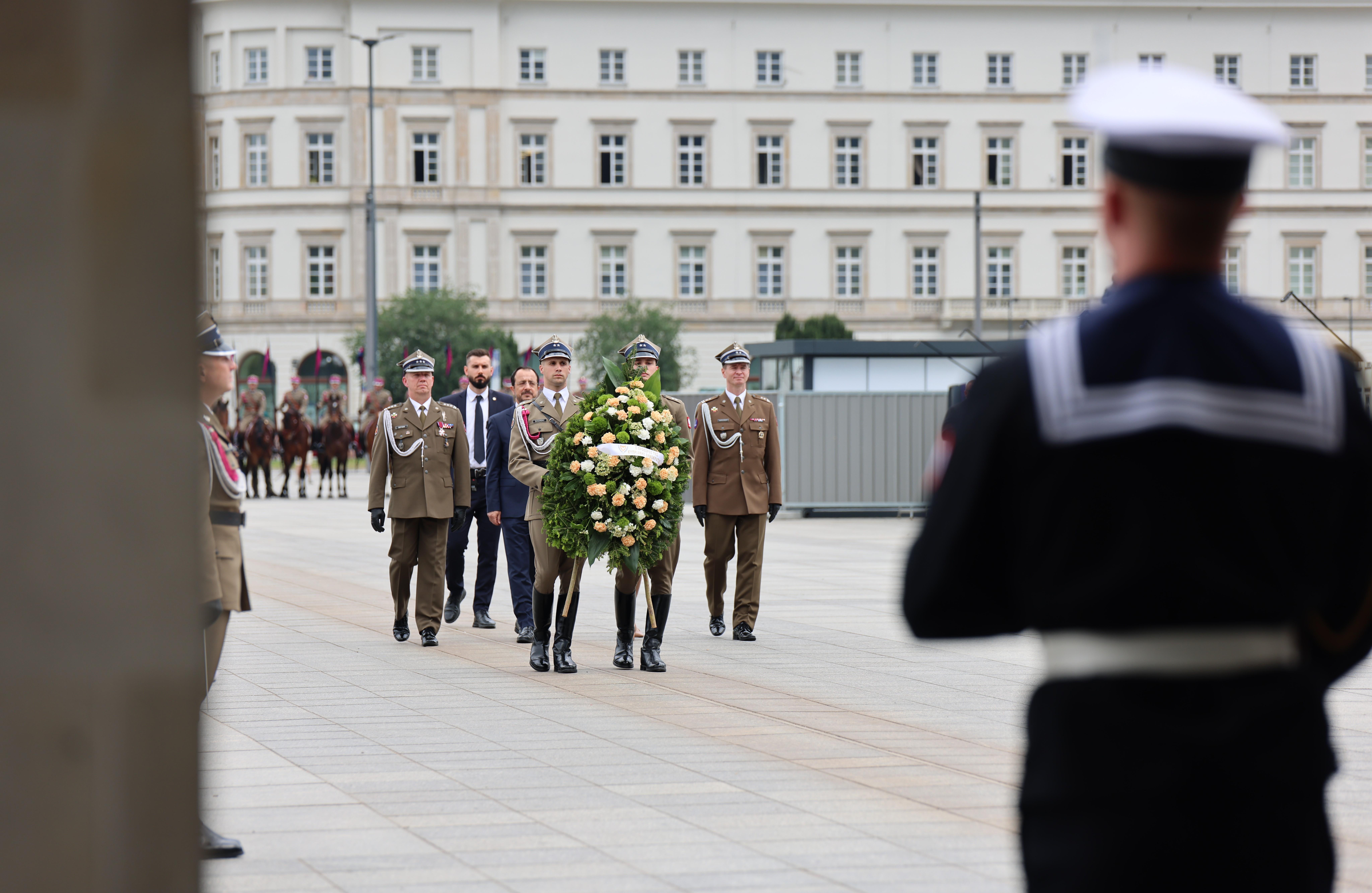 Prezydent RP Andrzej Duda powitał na dziedzińcu Pałacu Prezydenckiego Prezydenta Republiki Cypryjskiej Nikosa Christodoulidesa z małżonką. W ceremonii uczestniczył również Wicewojewoda Mazowiecki Patryk Fajdek. Następnie Wojewoda Mazowiecki Mariusz Frankowski wziął udział w ceremonii złożenia wieńca przez Prezydenta Republiki Cypryjskiej Nikosa Christodoulidesa przy Grobie Nieznanego Żołnierza.