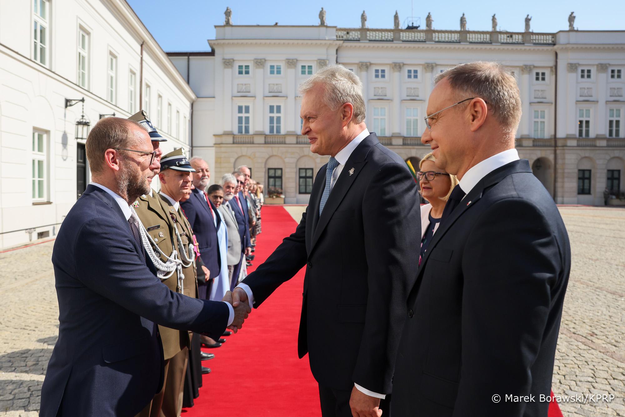 Prezydent RP Andrzej Duda powitał na dziedzińcu Pałacu Prezydenckiego Prezydenta Republiki Litewskiej Gitanasa Nausėde z małżonką. W tej ceremonii uczestniczył Wicewojewoda Mazowiecki Robert Sitnik.
