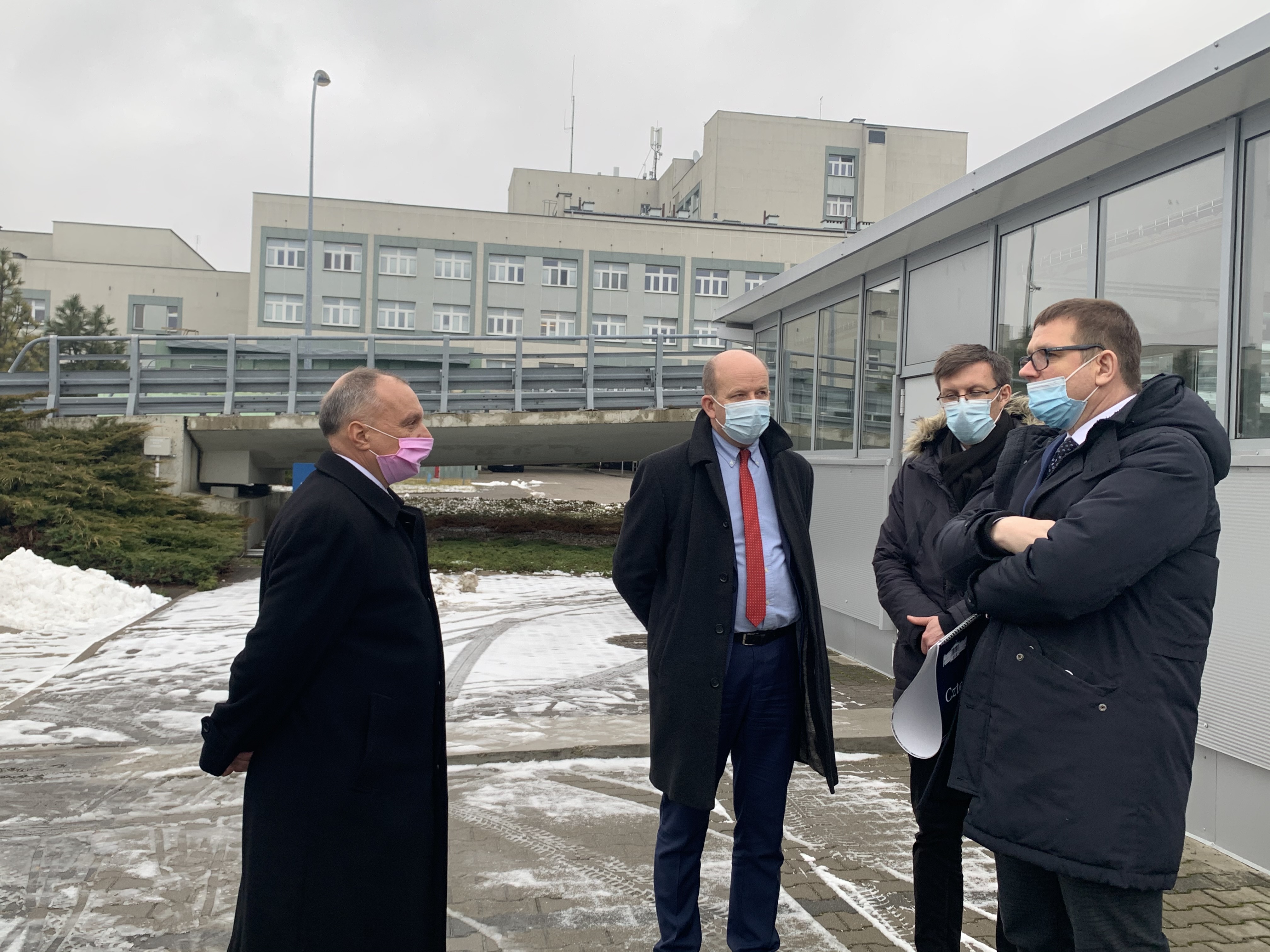 Ostatnim punktem programu była wizyta w Szpitalu Tymczasowym znajdującym się na terenie Mazowieckiego Szpitala Specjalistycznego im. dr. Józefa Psarskiego w Ostrołęce. Wojewoda Mazowiecki Konstanty Radziwiłł oraz Kierownik Delegatury MUW w Ostrołęce Marcin Grabowski spotkali się z Dyrektorem Szpitala Pawłem Rafałem Natkowskim oraz Zastępcą Dyrektora ds. medycznych Wojciechem Krzyżanowskim. Wojewoda podziękował dyrekcji za zaangażowanie w prowadzenie szpitala tymczasowego na terenie Wojewódzkiego Szpitala im. J. Psarskiego. Szpital tymczasowy obecnie hospitalizuje 50 pacjentów z COVID-19, a przygotowanych ma 88 miejsc.
