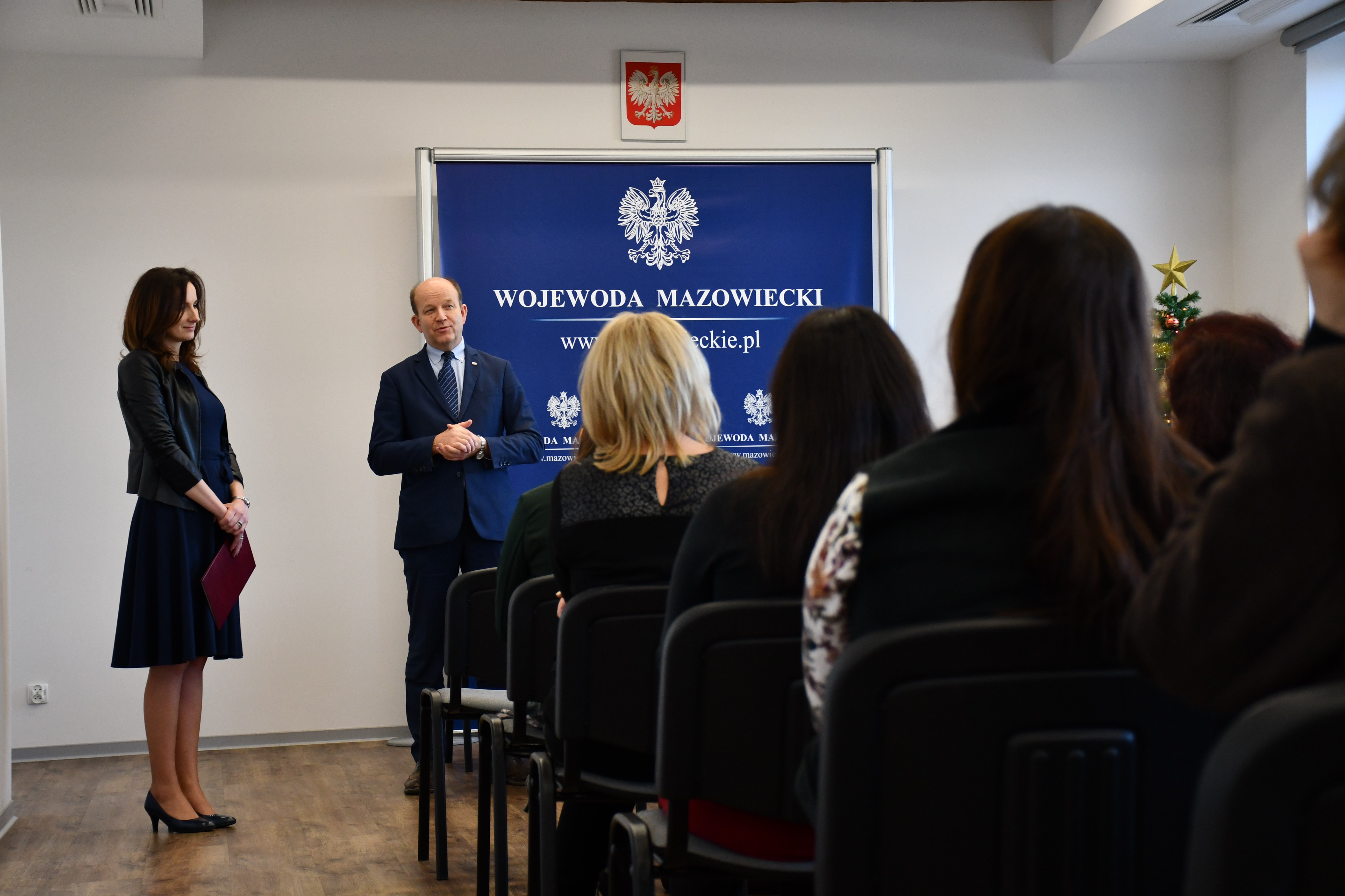Wojewoda wręczył także nagrody i wyróżnienia wychowankom placówek opiekuńczo-wychowawczych z Gostynina, którzy wzięli udział w konkursie na kartkę świąteczną Wojewody Mazowieckiego.