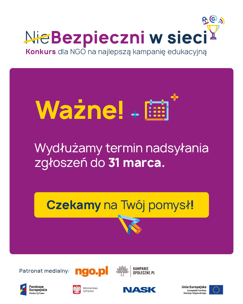 Halo, halo, czy są tu jakieś organizacje pozarządowe? W związku z ostatnimi wydarzeniami – macie jeszcze nie kilka dni, prawie dwa tygodnie na zgłoszenie pomysłu do konkursu „NieBezpieczni w sieci”. Wasz pomysł i nasze wsparcie - to musi się udać!