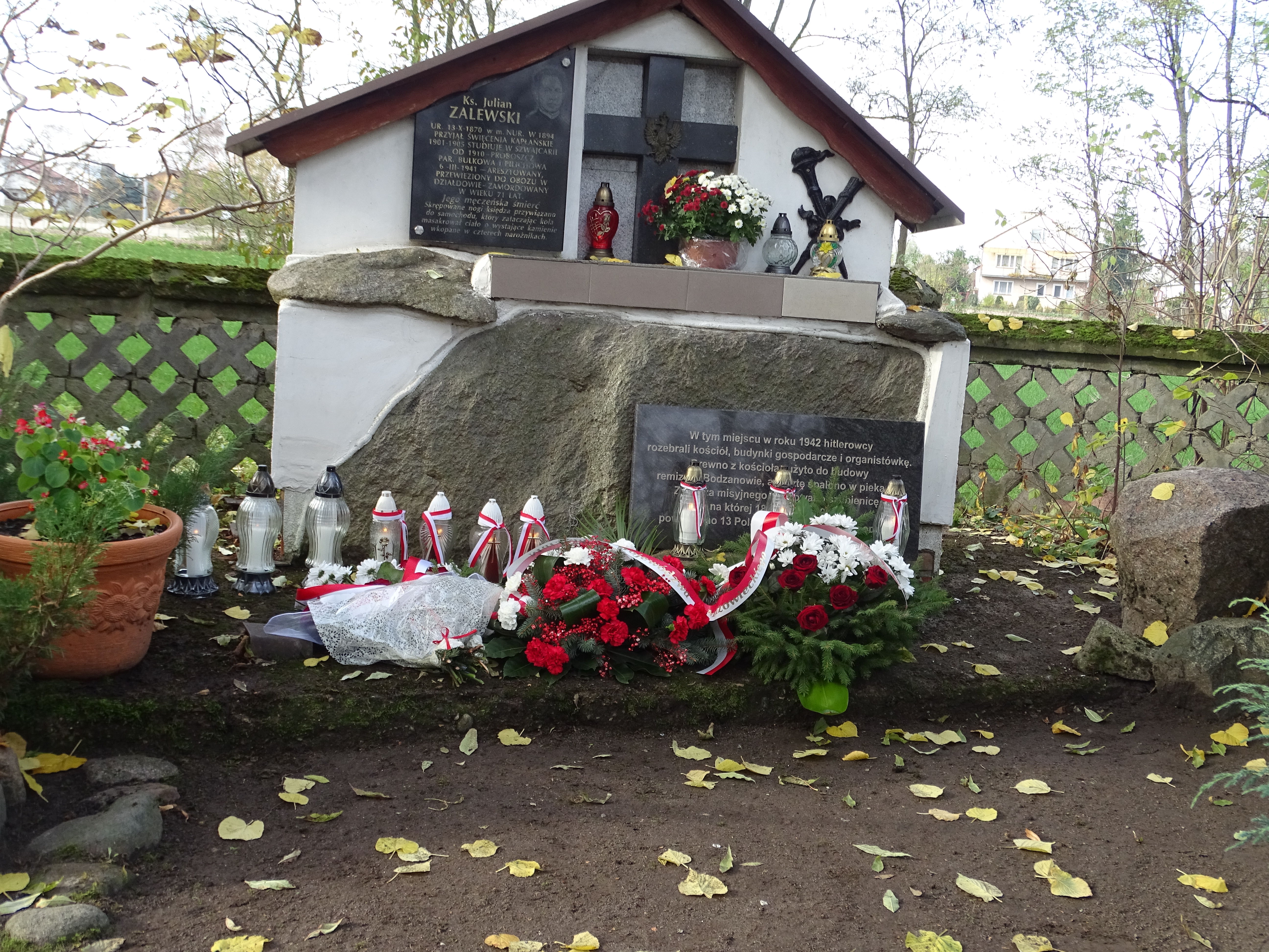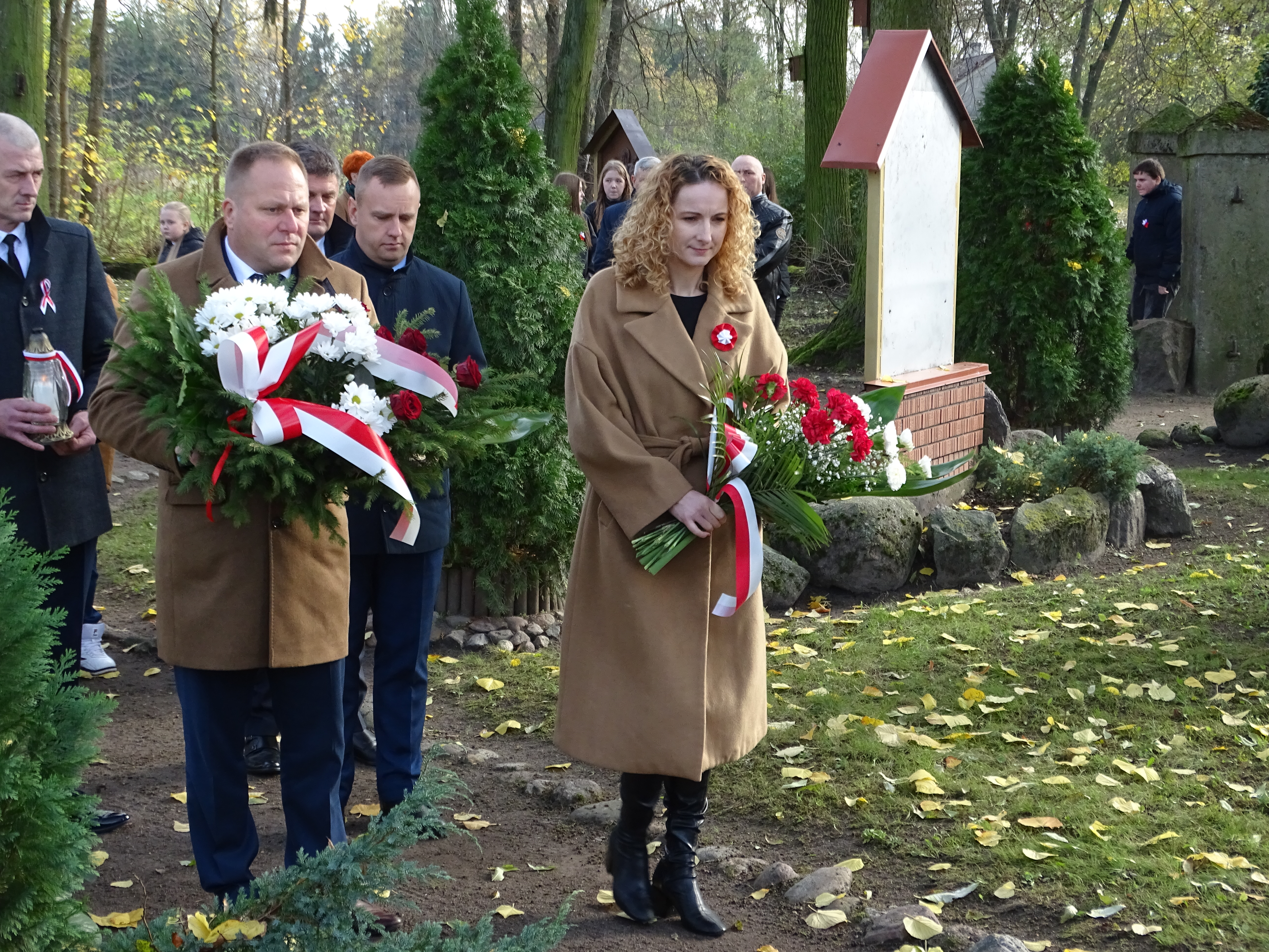 Następnie delegacje zaproszonych Gości, Urzędu Gminy i Uczniów złożyły kwiaty i znicze w Gminnym Parku Niepodległości i przy obelisku upamiętniającym wydarzenia II Wojny Światowej i męczeńskiej śmierci ks. Juliana Zalewskiego.