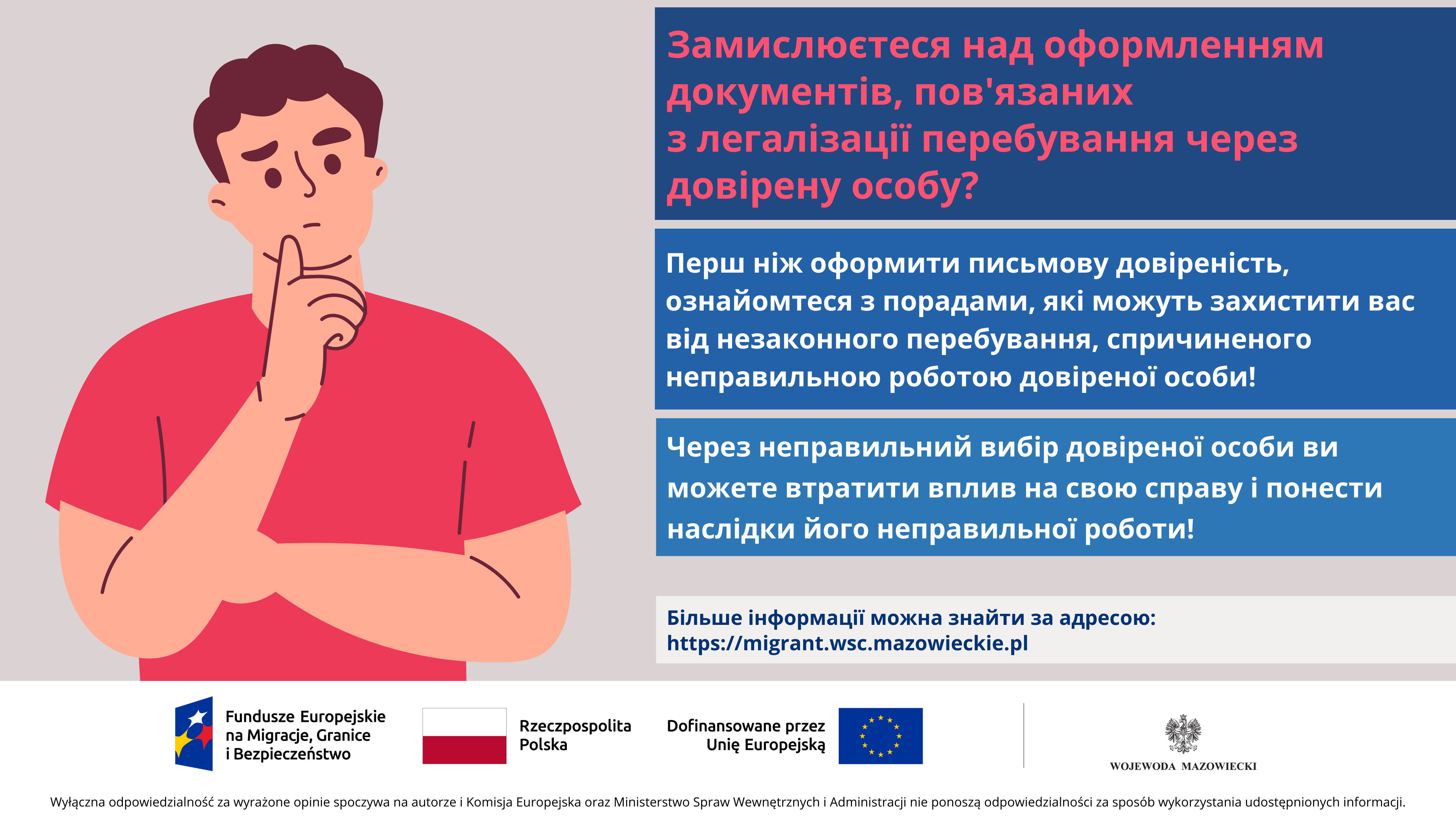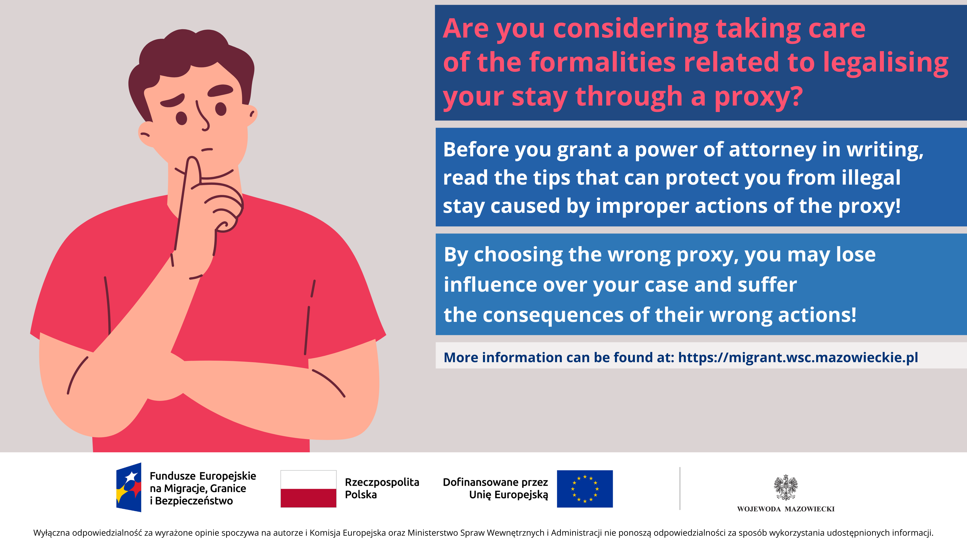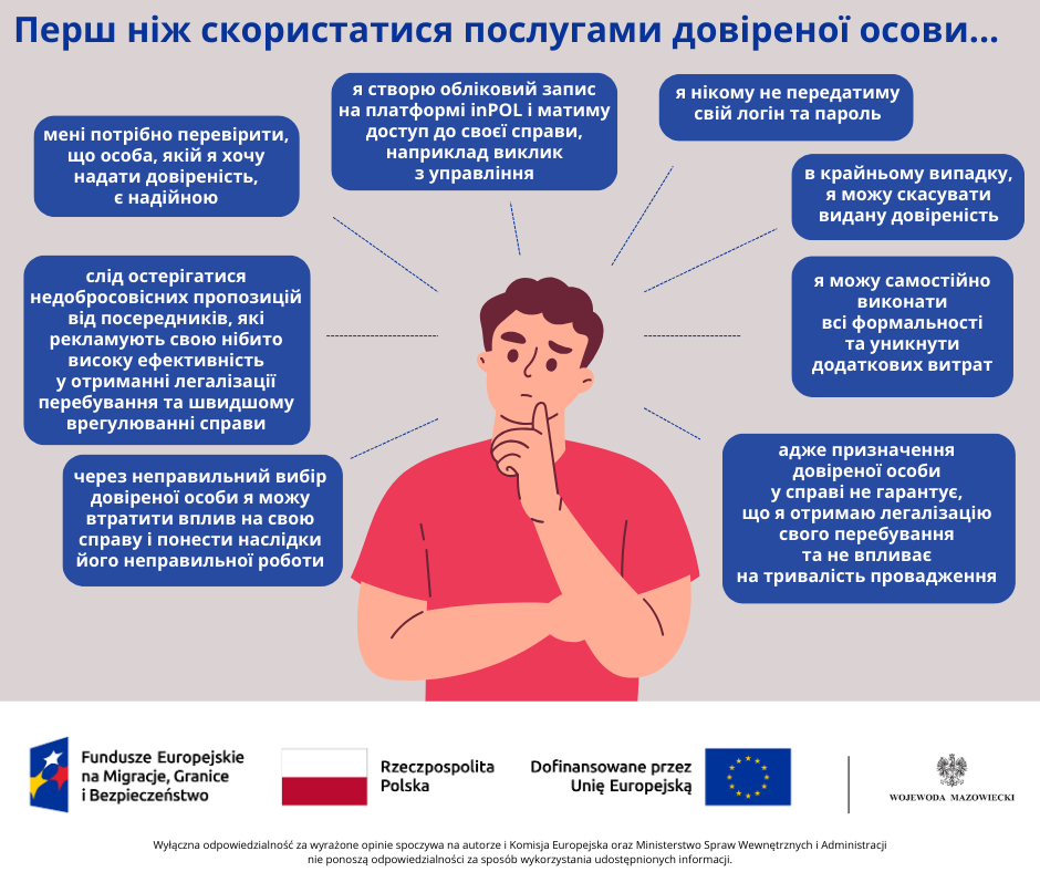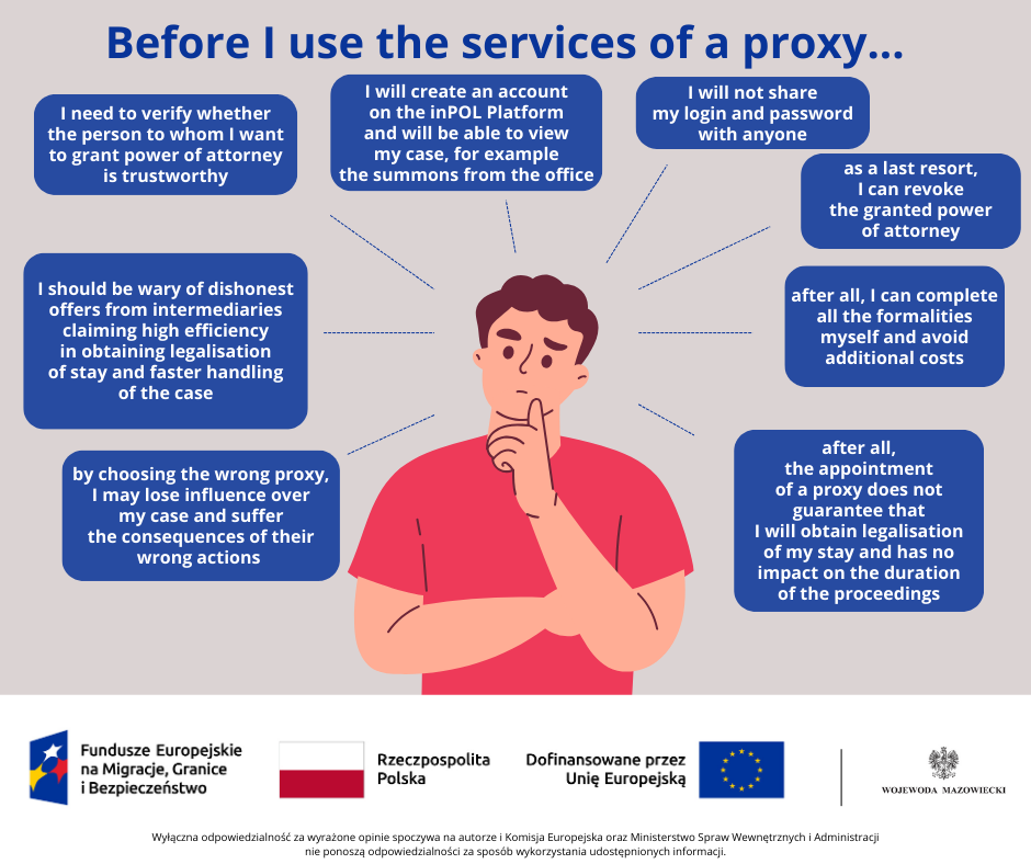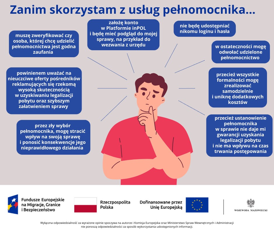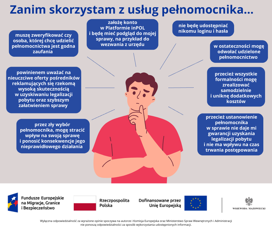 - Uważaj na nieuczciwe oferty pośredników reklamujących się rzekomą, wysoką skutecznością w uzyskiwaniu legalizacji pobytu oraz szybszym załatwieniem sprawy. Posiadanie pełnomocnika nigdy nie daje takich gwarancji ani nie wpływa na pracę urzędników. Co więcej, niekiedy wydłuża czas postępowania przez np. niepodejmowanie przez pośrednika koniecznych czynności, czy nieodpowiadanie na wezwania lub pisma z urzędu. Pośrednicy często pobierają dodatkowe opłaty i wprowadzają w błąd odnośnie obowiązującego prawa. Nie informują na bieżąco o etapach postępowania. Przez zły wybór pełnomocnika, możesz stracić wpływ na swoją sprawę i ponosić konsekwencje jego nieprawidłowego działania.