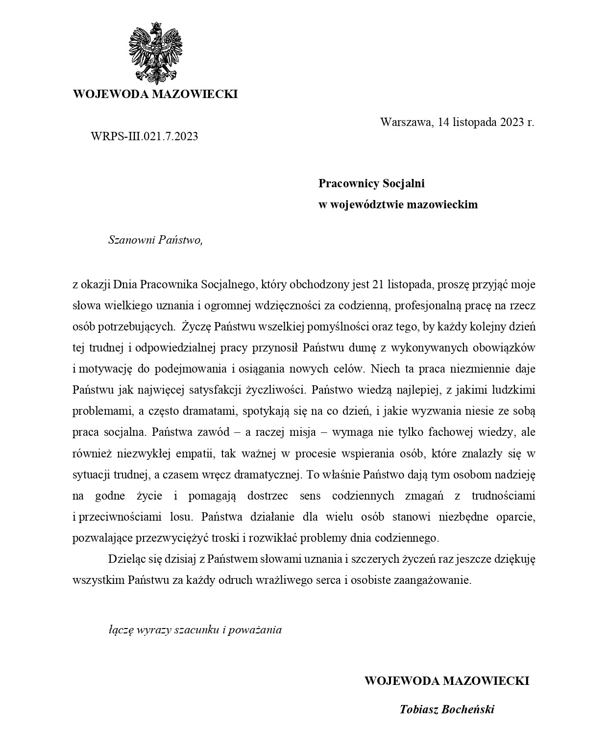 Życzenia Wojewody Mazowieckiego dla Pracowników Socjalnych
