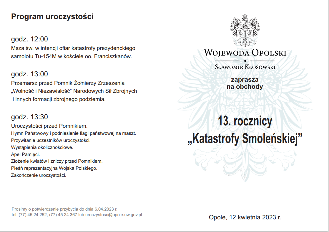 12 kwietnia 2023 r. Wojewoda Opolski zaprasza na obchody 13. rocznicy "Katastrofy Smoleńskiej" Zdjęcia (1) Pokaż zdjęcie 1 z galerii.