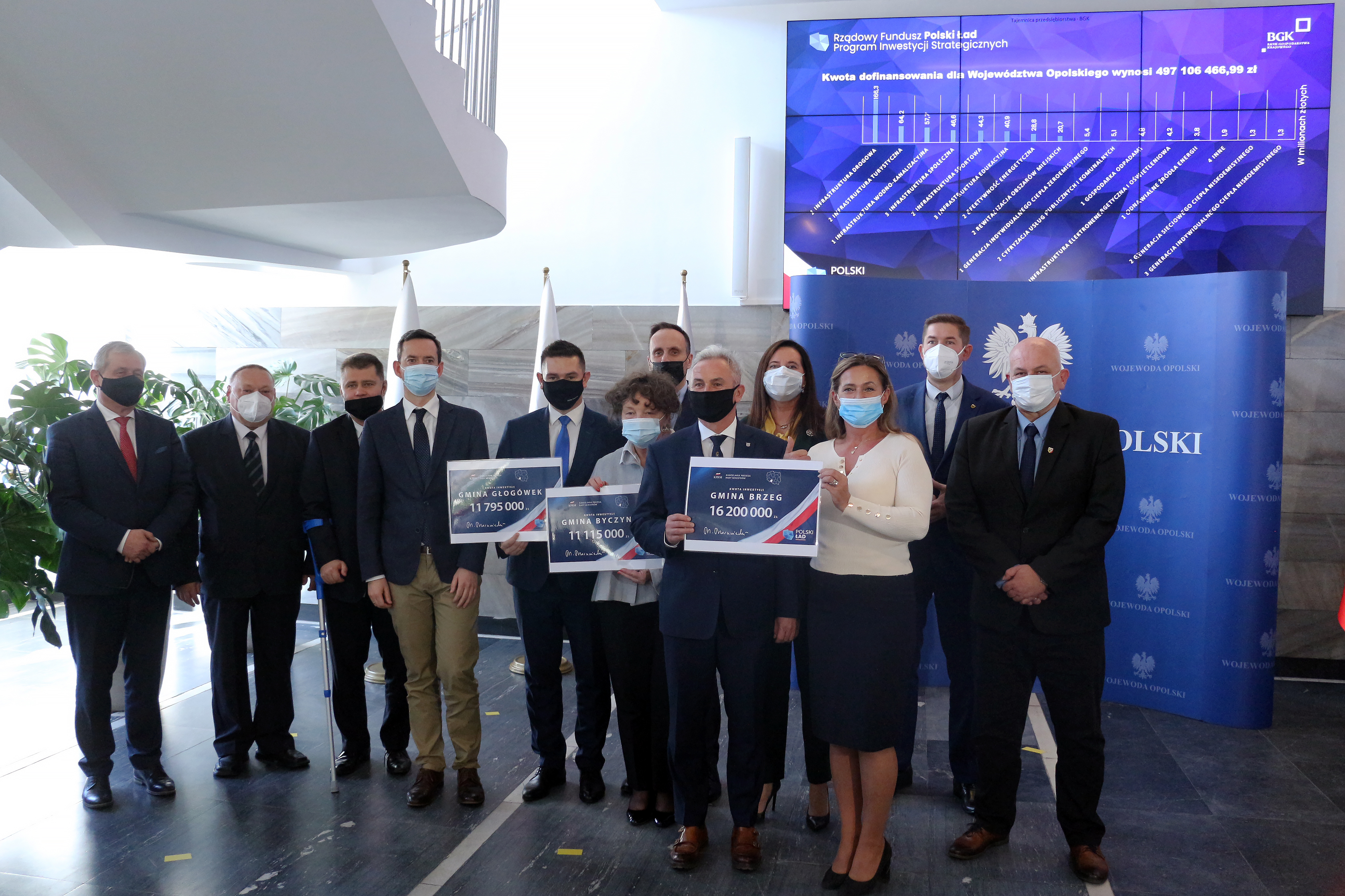Czek na niemal 12 mln złotych otrzymała również Iwona Sobania, burmistrz Byczyny oraz Piotr Bujak, burmistrz Głogówka. Gmina ta otrzymała dofinansowanie na kwotę 6,8 mln złotych.