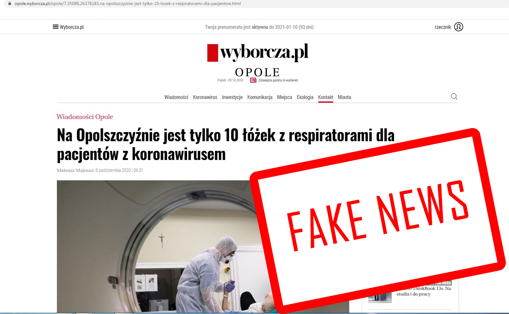 Nieprawdą jest, że na terenie województwa opolskiego zabezpieczonych jest tylko 10 łóżek respiratorowych dla pacjentów z COVID-19 jak podano w dniu 08.10.2020 r. przez serwis https://opole.wyborcza.pl oraz w druku w Gazecie Wyborczej Tygodnik Opole na stronie 3 w dniu 09.10.2020 r.