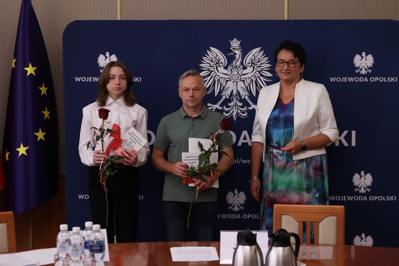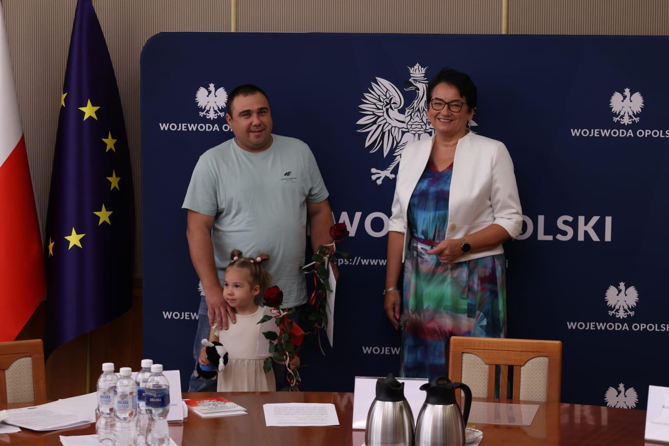 Podczas dzisiejszej (31.07) uroczystości w Sali Złotej Wojewoda Opolski Monika Jurek wręczyła obywatelstwa 9 osobom, w tym 5 dzieci. W wydarzeniu wzięły udział również Dyrektor Wydziału Spraw Obywatelskich i Cudzoziemców Anna Bartoszek-Dec oraz Zastępca Dyrektora Wydziału Spraw Obywatelskich i Cudzoziemców Karolina Superczyńska.