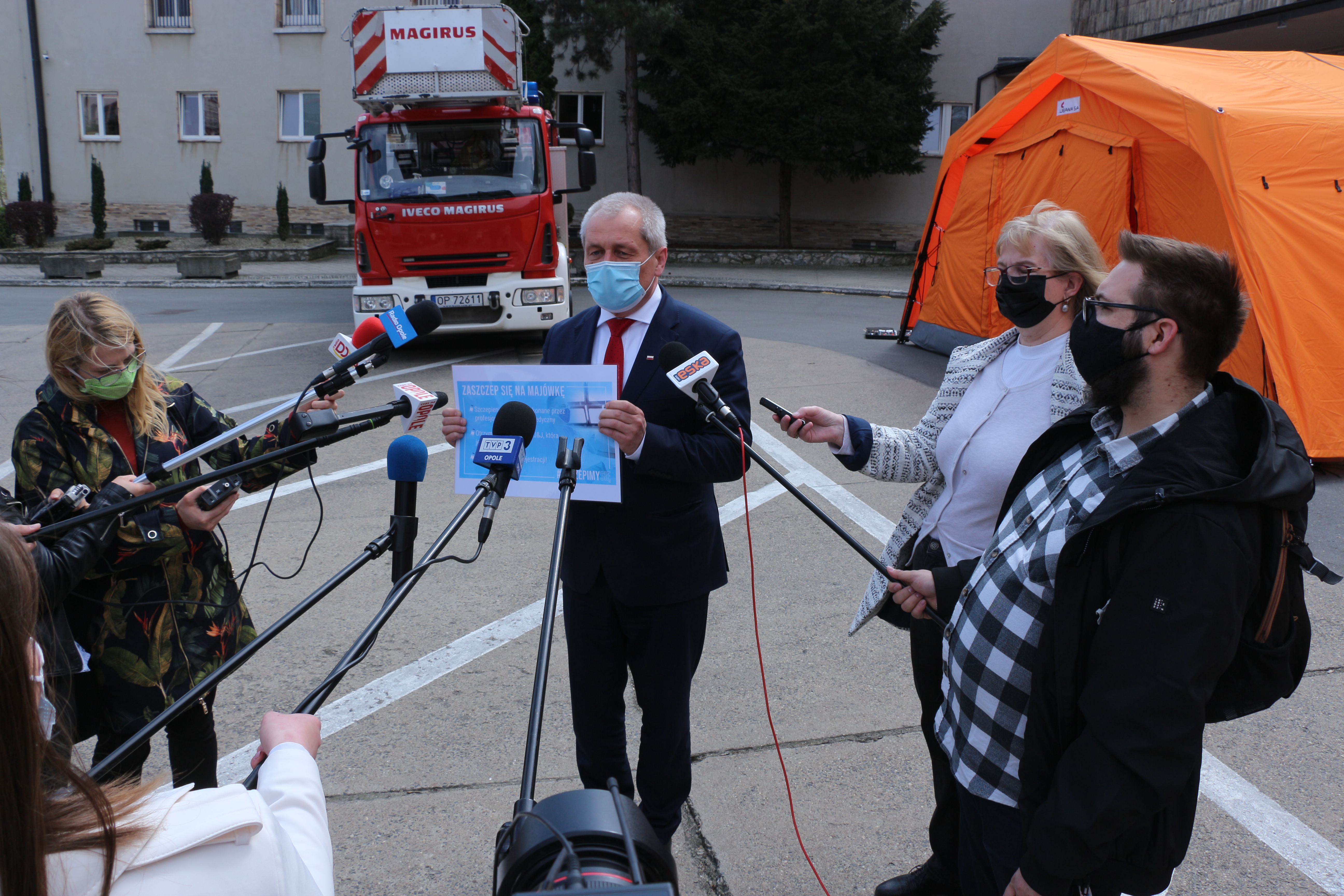 - Dawek będzie łącznie 2,5 tysiąca. Liczymy, na to, że przerób tego punktu na dwóch namiotach z kadrą medyczną będzie odpowiedni do tego, żeby wyszczepić wszystkich tych, którzy wyrażą chęć. Są trzy zespoły szczepienne, składające się z pielęgniarek, lekarzy i ratowników medycznych. Kadra jest z Krapkowickiego Centrum Zdrowia – wyjaśniał podczas dzisiejszego briefingu prasowego wojewoda opolski Sławomir Kłosowski. Dziś pod urzędem strażacy stawiali bowiem pierwsze namioty do szczepień.