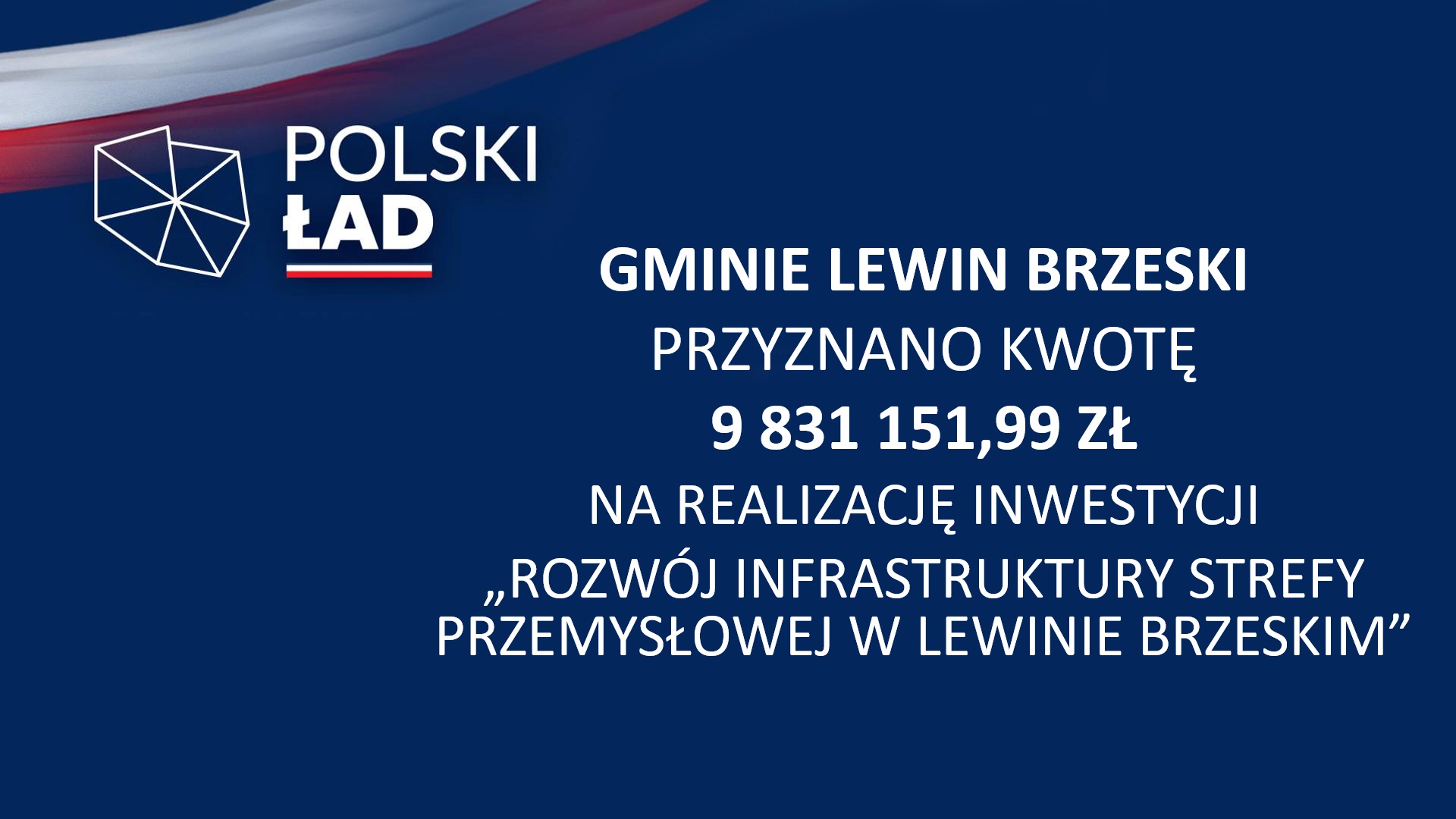 - Gminie Lewin Brzeski przyznano kwotę 9 831 151,99 zł na realizację inwestycji „Rozwój Infrastruktury Strefy Przemysłowej w Lewinie Brzeskim”;