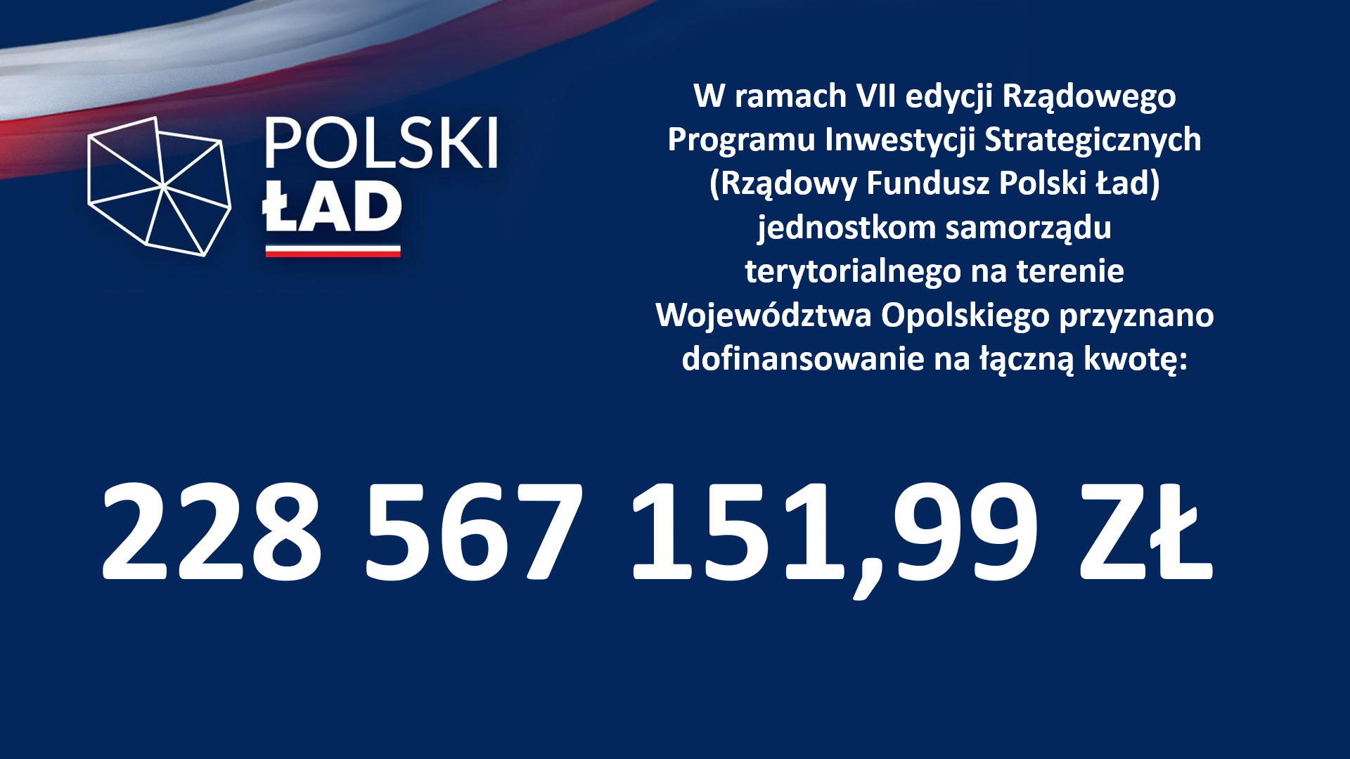 W ramach VII edycji Rządowego Programu Inwestycji Strategicznych (Rządowy Fundusz Polski Ład) jednostkom samorządu terytorialnego na terenie Województwa Opolskiego przyznano dofinansowanie na łączną kwotę 228 567 151,99 złotych (słownie: dwieście dwadzieścia osiem milionów pięćset sześćdziesiąt siedem tysięcy sto pięćdziesiąt jeden złotych i dziewięćdziesiąt dziewięć groszy). Środki te przyznano siedmiu jednostkom samorządu terytorialnego na realizację siedmiu inwestycji: