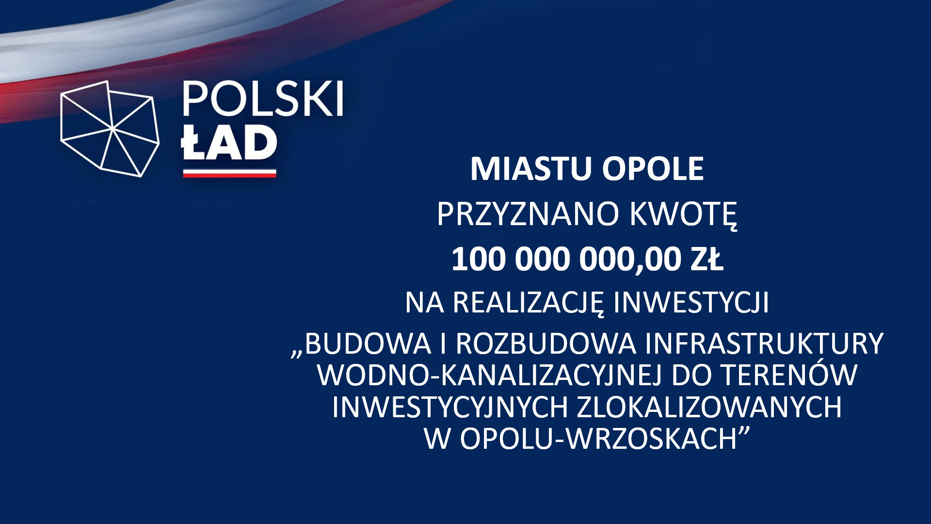 - Miastu Opole przyznano kwotę 100 000 000,00 zł na realizację inwestycji „Budowa i Rozbudowa Infrastruktury Wodno-Kanalizacyjnej do Terenów Inwestycyjnych Zlokalizowanych w Opolu-Wrzoskach”.