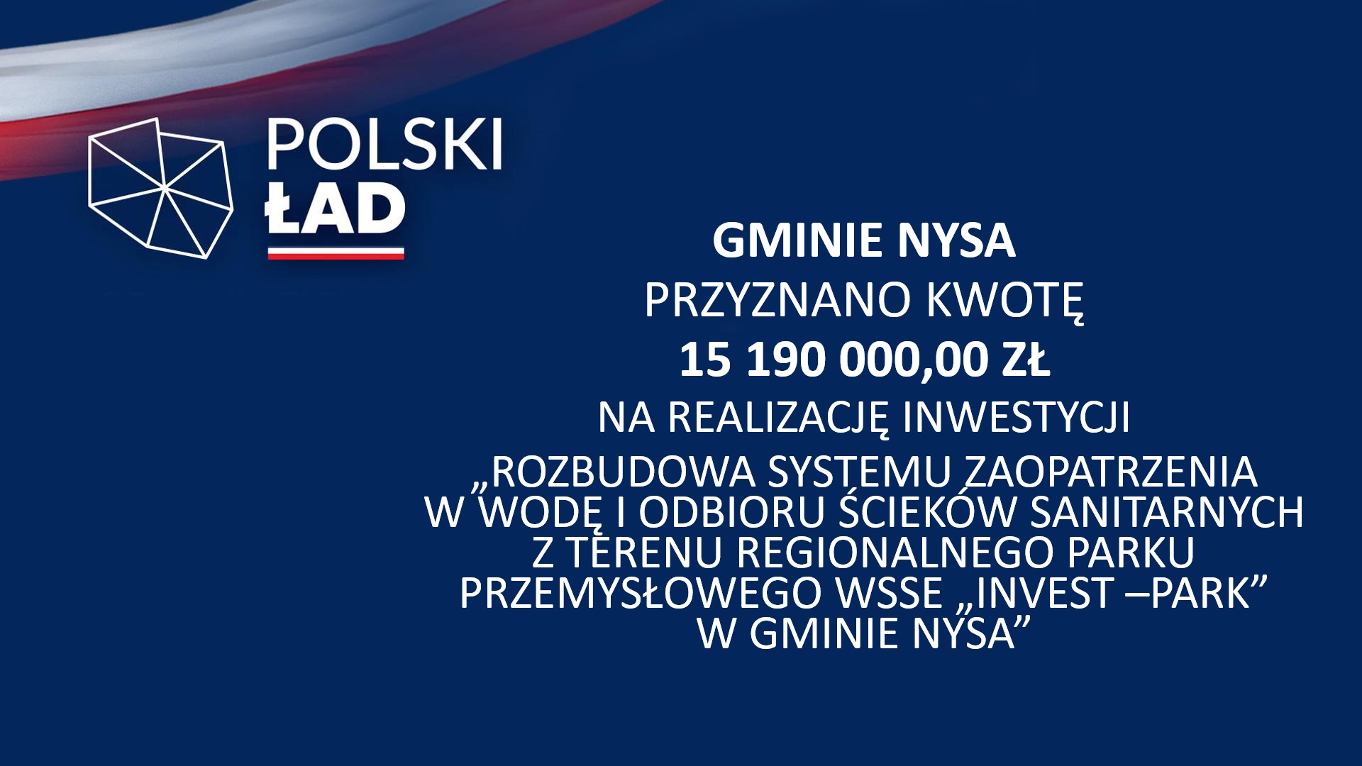 - Gminie Nysa przyznano kwotę 15 190 000,00 zł na realizację inwestycji „Rozbudowa Systemu Zaopatrzenia w Wodę i Odbioru Ścieków Sanitarnych z Terenu Regionalnego Parku Przemysłowego WSSE „Invest–Park” w Gminie Nysa”;